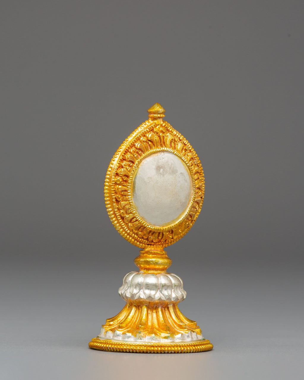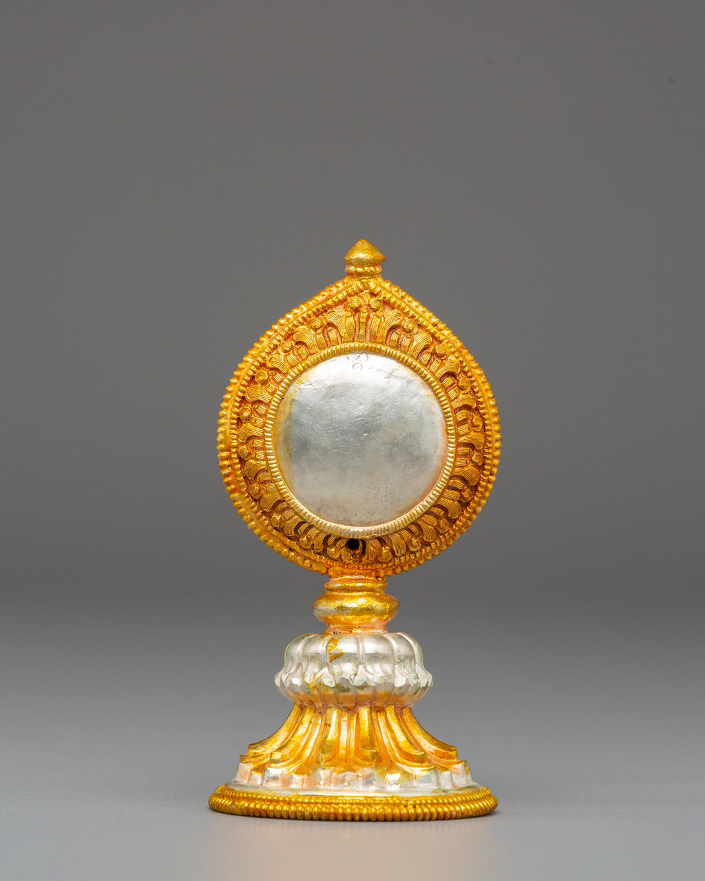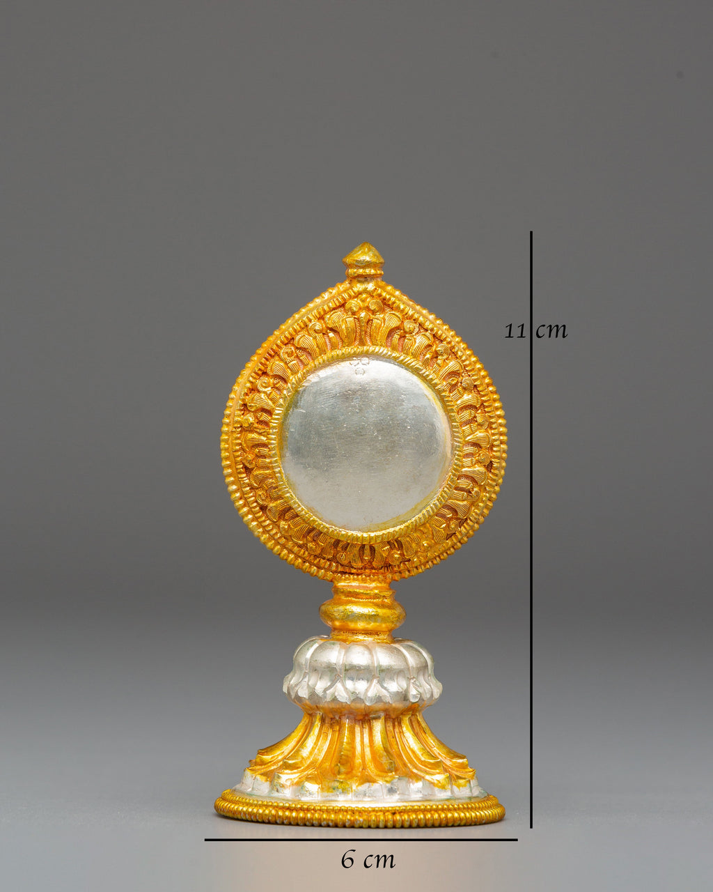 This sacred golden mirror is an exquisite Tibetan spiritual artifact that combines beauty and profound symbolism. Measuring 11 cm in height and 6 cm in width, this handcrafted mirror boasts a copper body with silver plating and mercury gold plating, creating a stunning effect that shines with both elegance and spiritual significance. Mirrors in Tibetan Buddhism are considered symbols of self-reflection and wisdom, representing clarity and the ability to see beyond illusions. This mirror serves as a powerful reminder of enlightenment and the importance of self-awareness on the spiritual path.