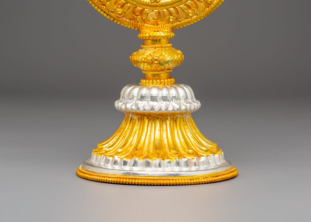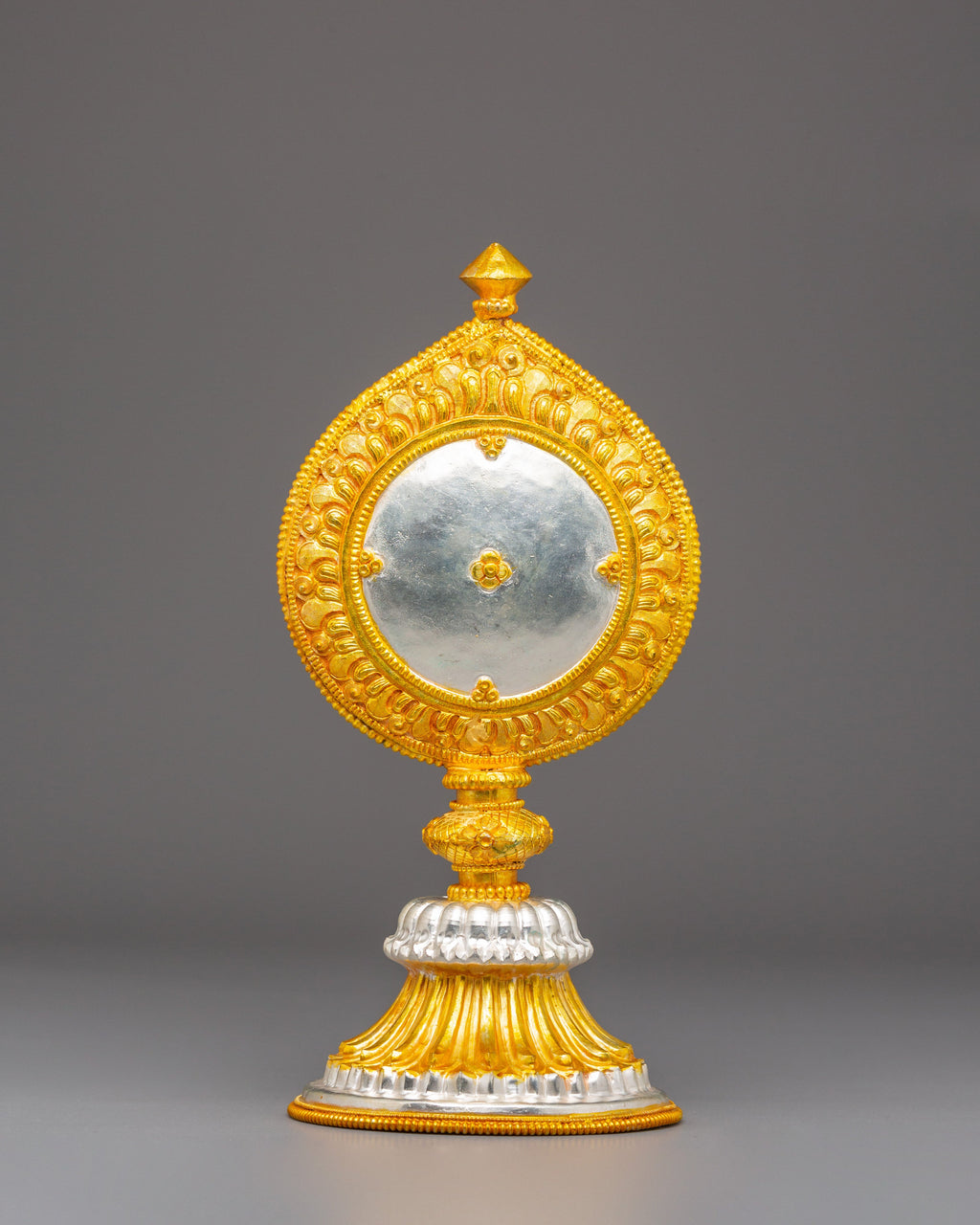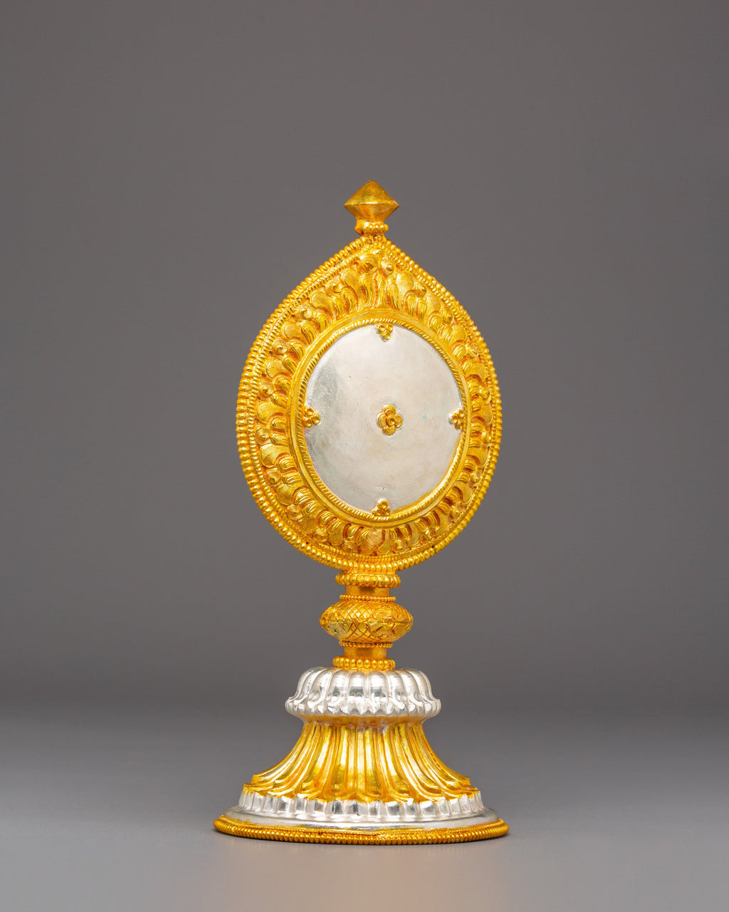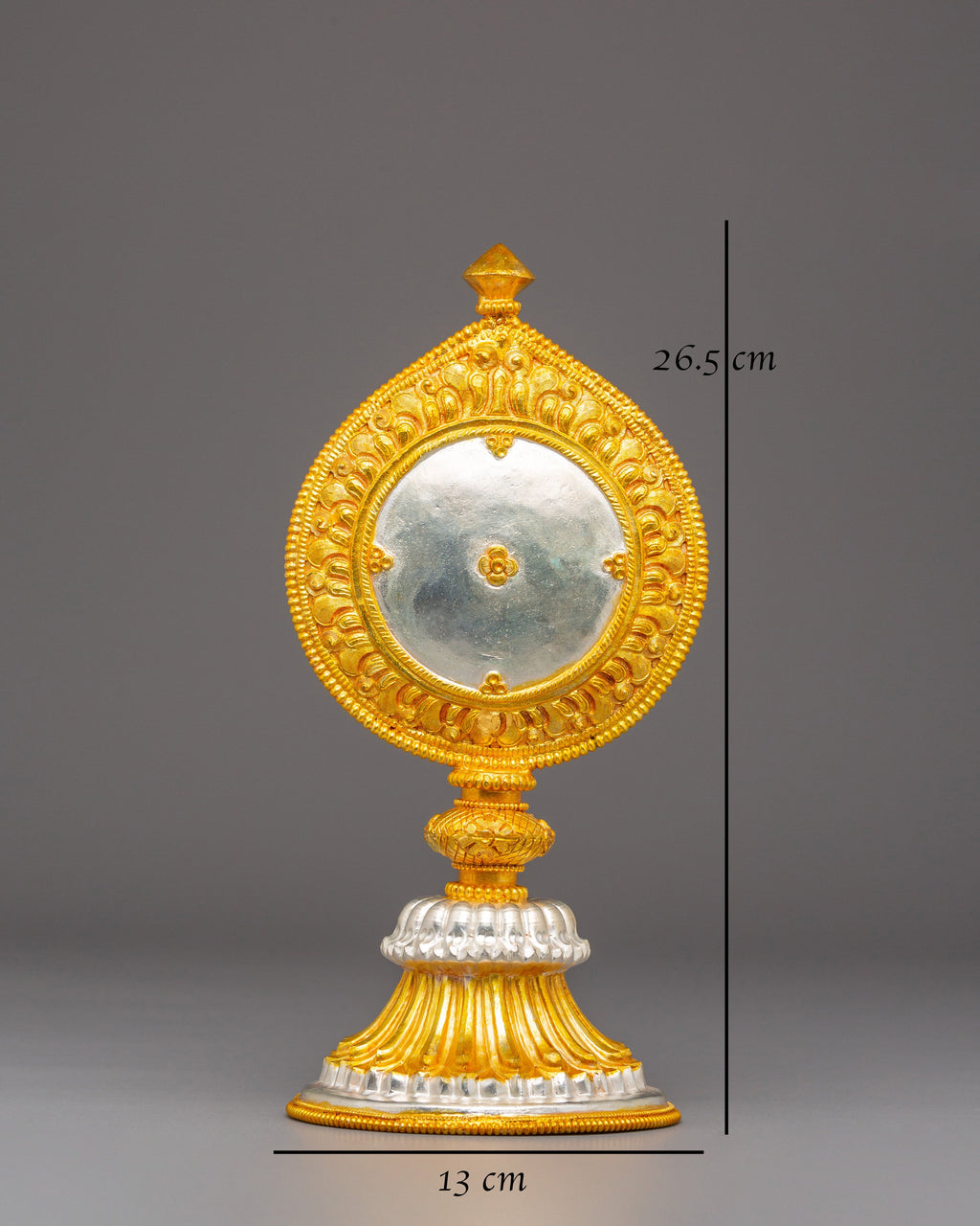 The frame showcases traditional Himalayan-inspired artistry, featuring ornamental borders, lotus-like patterns, and layered textures that highlight cultural symbolism. The gold and silver tones work together harmoniously, emphasizing purity, insight, and mindful awareness. The tiered base adds visual balance and symbolic grounding, connecting the mirror to the practice of offering, respect, and spiritual intention. These motifs reflect the deep heritage of Tibetan craftsmanship.