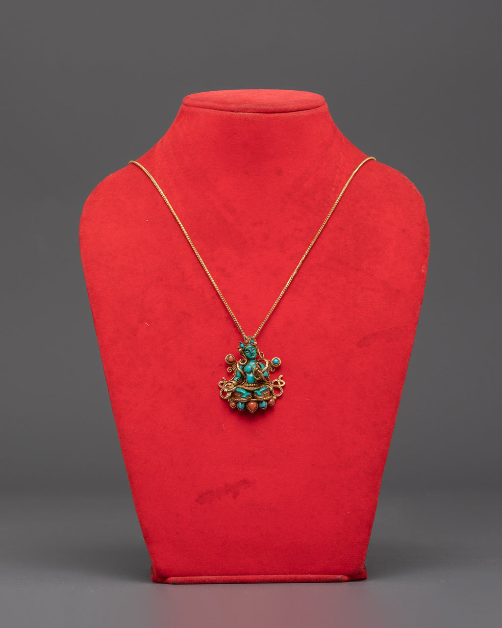 Green Tara, known as the Goddess of Compassion and Swift Action in Tibetan Buddhism, is thought to protect practitioners from worries and impediments while guiding them to insight and calm. This exquisitely created Buddhist locket necklace functions as both a protection amulet and a work of sacred art. The use of deep blue lapis, vivid turquoise, and red coral adds visual appeal while expressing traditional Tibetan aesthetics and spiritual meaning. Perfect for practitioners, collectors, or those seeking spiritual jewelry, this Green Tara pendant carries blessings of peace, healing, and guidance. Whether worn as a necklace or used as a meditation charm, it connects you to Buddhist traditions and the protective energy of Tara.