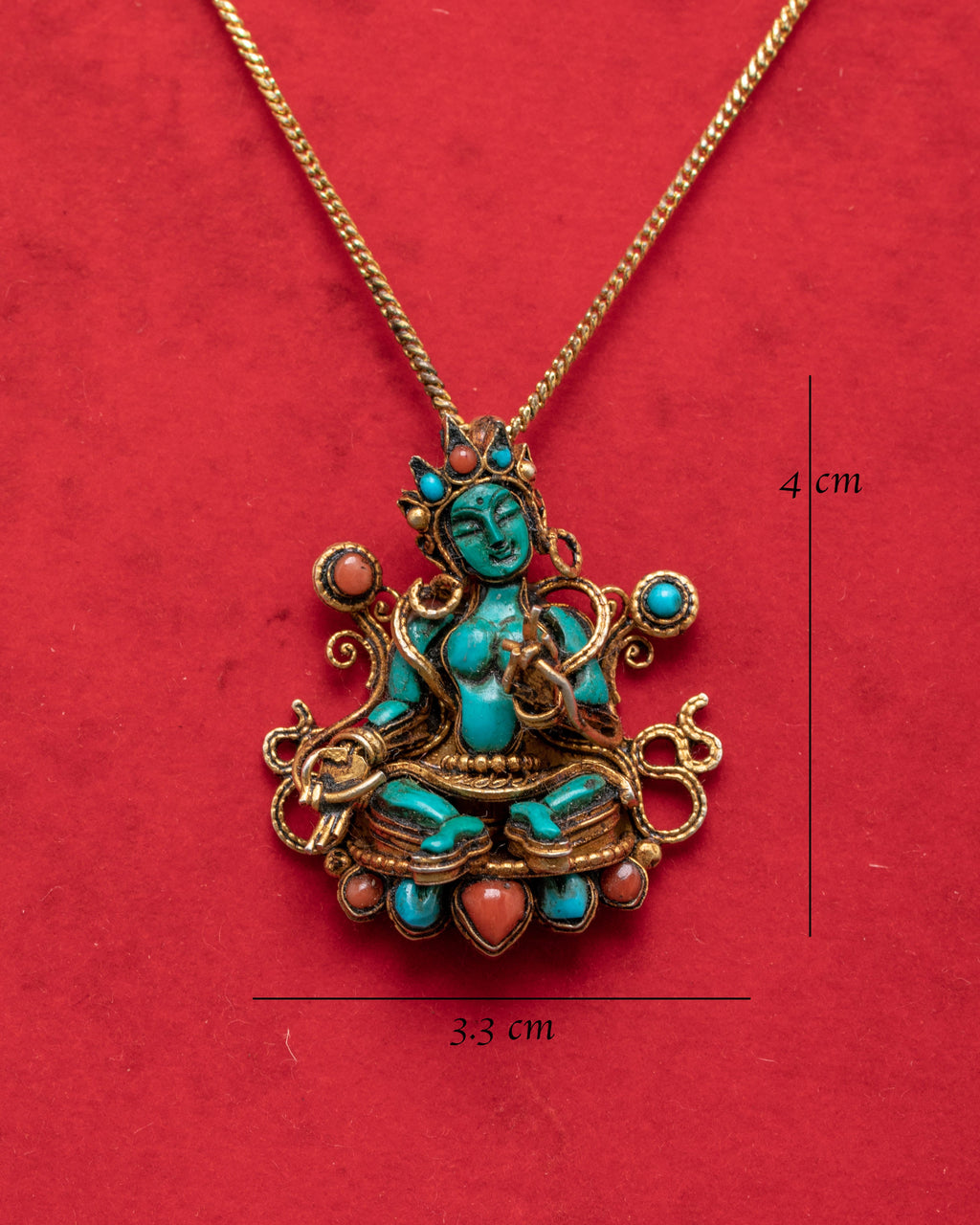 Celebrate the divine feminine energy with this Green Tara Locket Pendant, a precious piece of Tibetan Buddhist jewelry that represents compassion, protection, and enlightenment. This pendant, measuring 4cm in height and 3.3cm in breadth and weighing only 0.008kg, is made of silver with gold plating and features artificial stones such as lapis lazuli, turquoise, and coral. Its small size and spiritual symbolism make it an appropriate piece to wear daily or set on an altar.