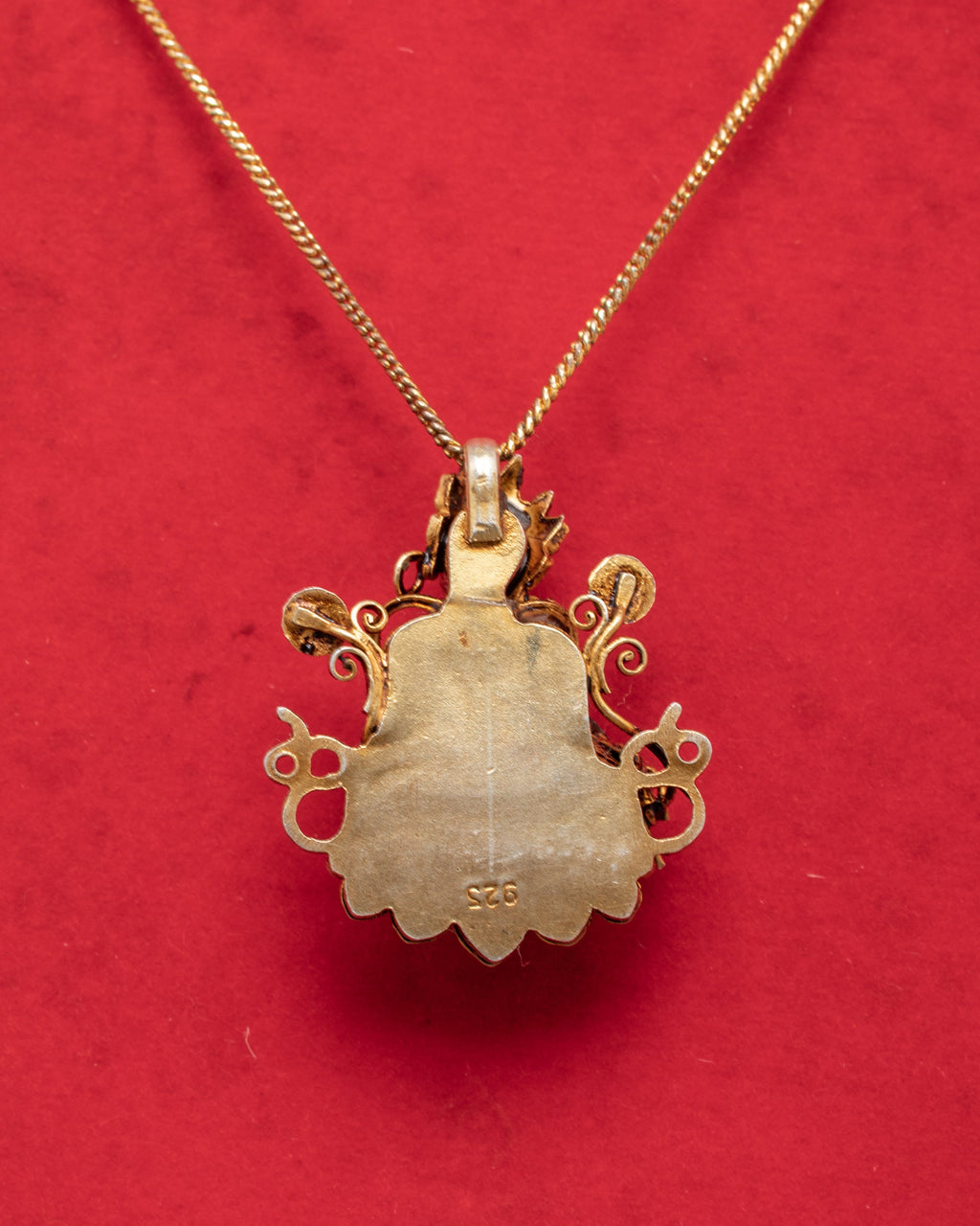 A Buddhist locket is a piece of jewelry designed to hold a small prayer, mantra, or image related to Buddhist practice. The locket may feature a design or image of a Buddhist deity, such as the Buddha, or a representation of a sacred symbol, like the lotus flower. It is typically worn as a talisman to remind the wearer of their spiritual path and to offer protection. Some Buddhist lockets are also used as a form of religious devotion and are frequently given as gifts to friends and family members to provide them with spiritual support and blessings.