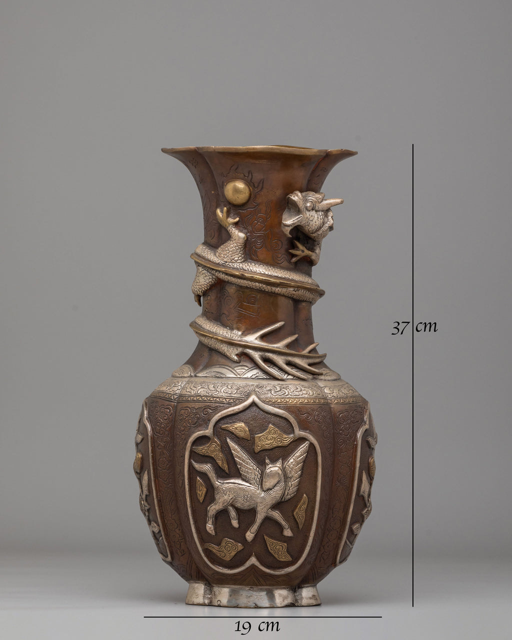 This handcrafted flower vase adds elegance to any space, embodying beauty and spiritual grace. It stands 37 cm tall and 19 cm wide, weighing 6.97 kg, making it a substantial presence. Crafted from iron with oxidized and electro-silver-plated finishes.
