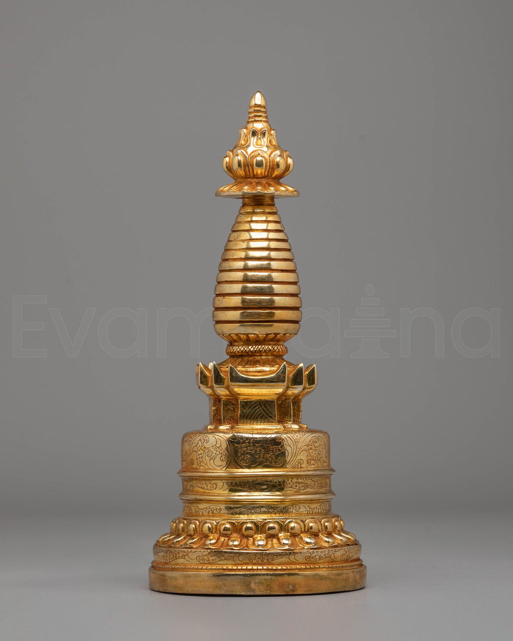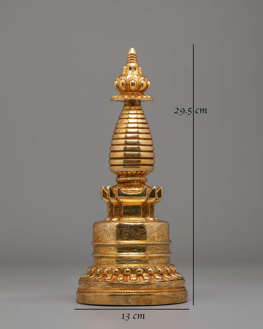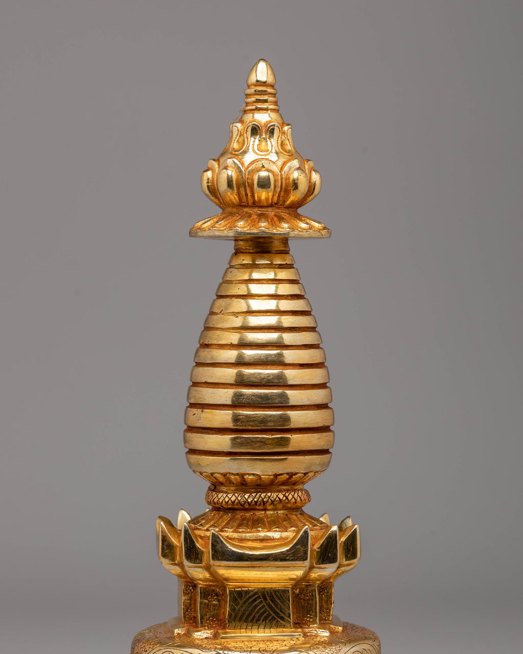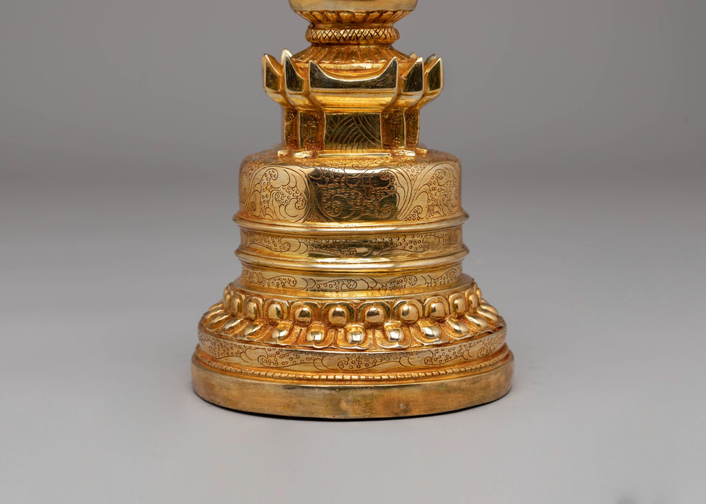 The design of the stupa incorporates intricate motifs that represent key elements of Buddhist teachings, such as the lotus base, which symbolizes purity and spiritual growth. The gold plating adds an aura of sacredness to the stupa, while the copper body ensures durability and a timeless, antique feel. The stupa's spiritual energy makes it an essential tool for those seeking protection, guidance, and blessings on their spiritual journey. The design invites both physical and spiritual peace, promoting mindfulness and reflection during rituals.