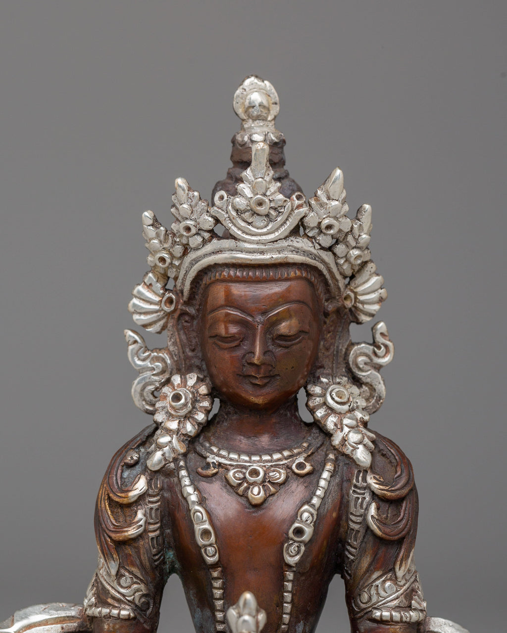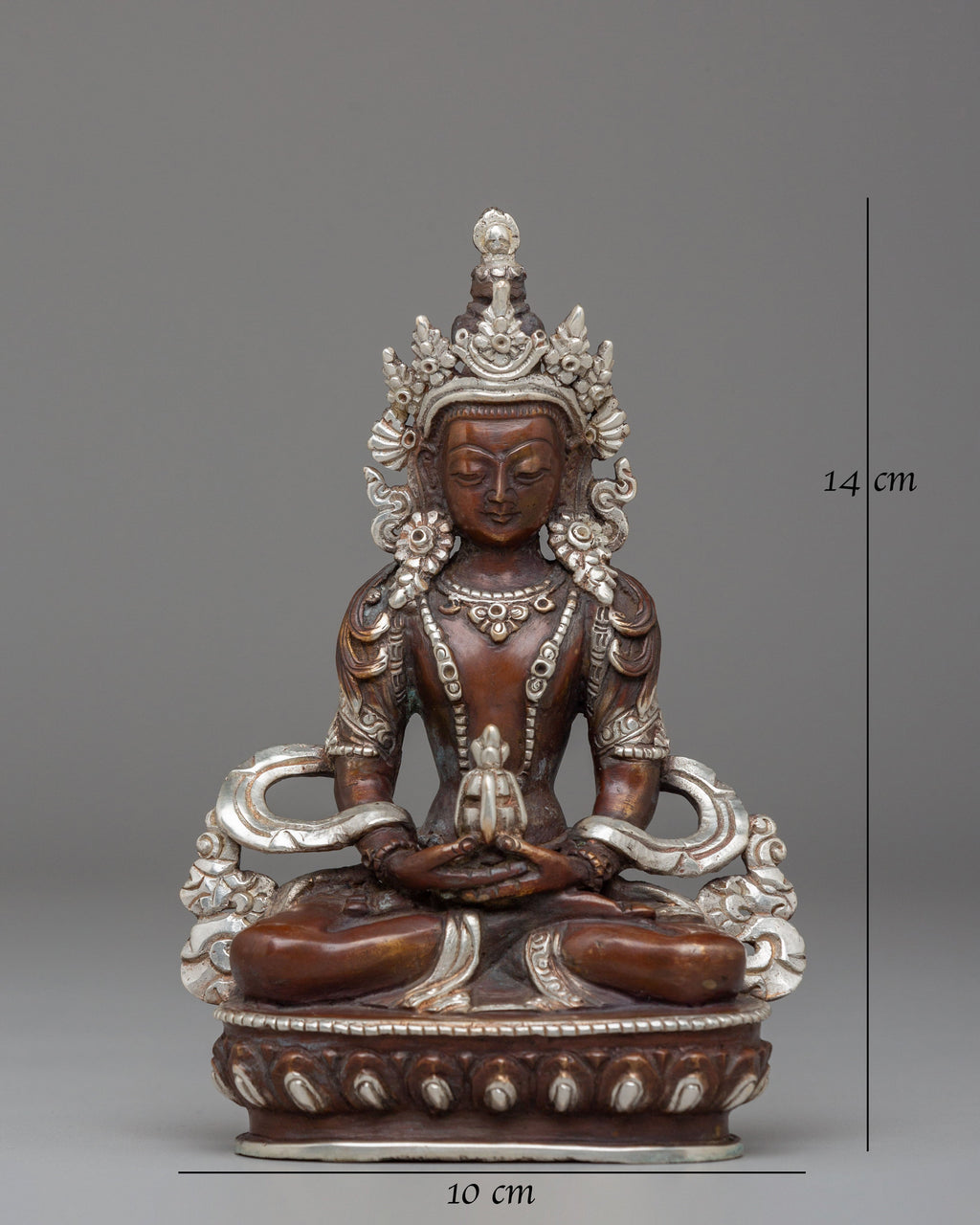 The Sacred Handmade Amitayus Buddha Statue is a finely crafted representation of Amitayus, the Buddha of Infinite Life. Standing at 14 cm tall and 10 cm wide, this statue is made of oxidized copper and finished with electro-silver plating, giving it a divine, serene appearance. The statue embodies the essence of longevity, vitality, and spiritual enlightenment, making it a perfect addition to altars, meditation spaces, or spiritual collections. Its intricate detailing and peaceful expression radiate tranquility, inviting positive energy and mindfulness into your space.