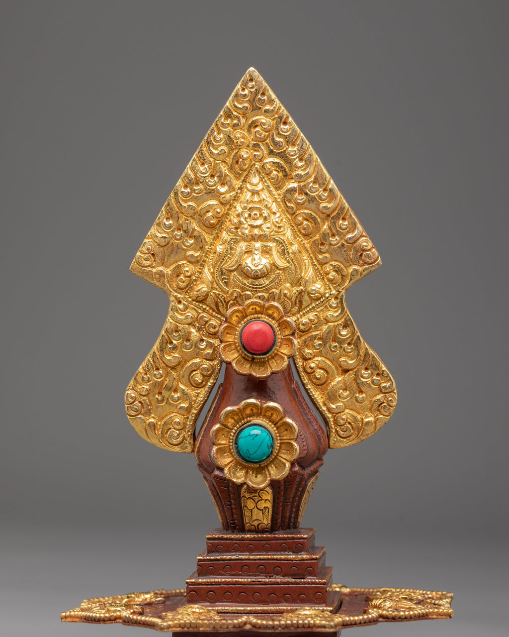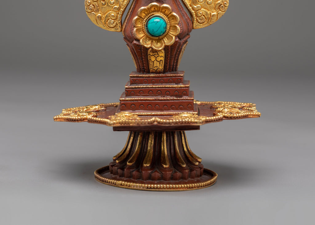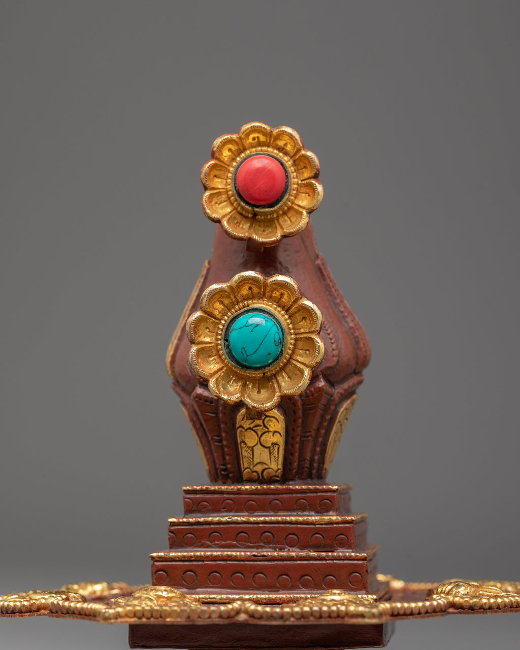The piece is adorned with intricate Tibetan motifs enhanced with acrylic color and set with artificial turquoise and coral stones. These elements are traditionally associated with healing, vitality, and positive spiritual energy. The rich ornamentation highlights the symbolic connection to the Hundred Deities, reflecting the visual language of Himalayan sacred art and the ritual intention to cultivate purification, openness, and awareness.
