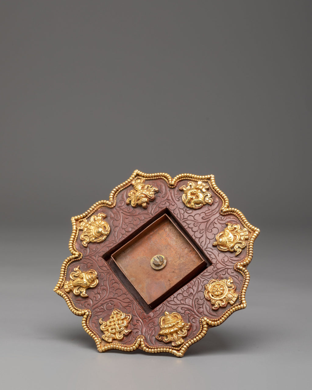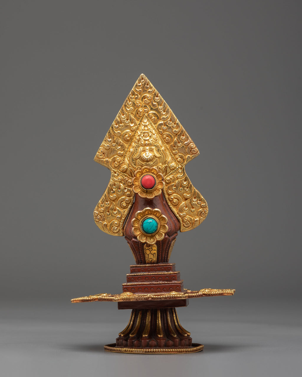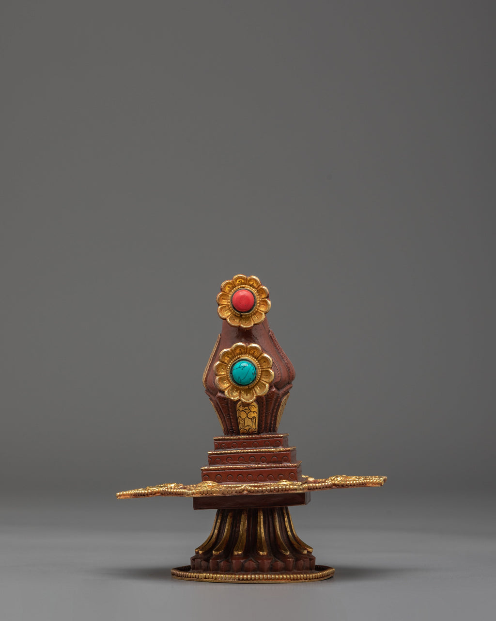 The piece is adorned with intricate Tibetan motifs enhanced with acrylic color and set with artificial turquoise and coral stones. These elements are traditionally associated with healing, vitality, and positive spiritual energy. The rich ornamentation highlights the symbolic connection to the Hundred Deities, reflecting the visual language of Himalayan sacred art and the ritual intention to cultivate purification, openness, and awareness.