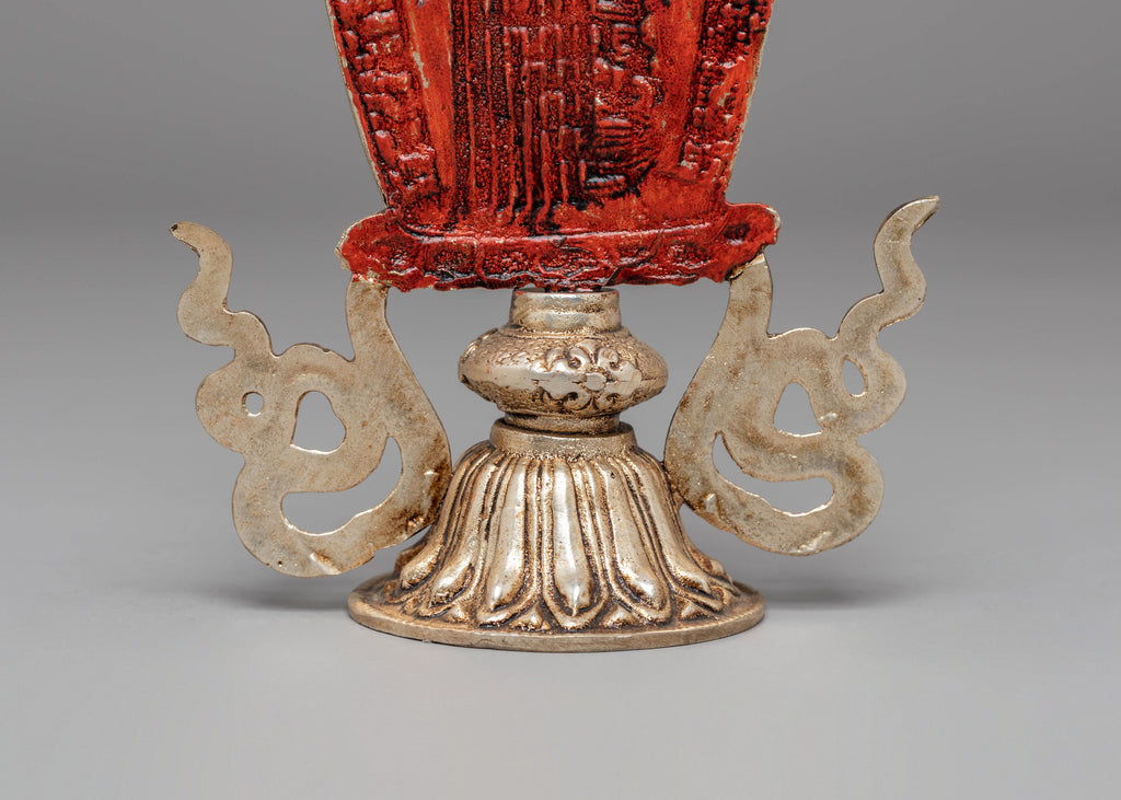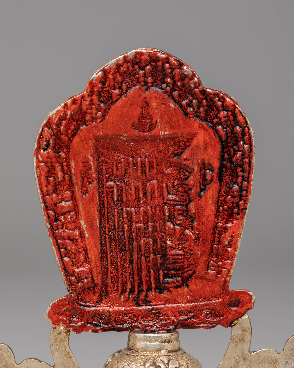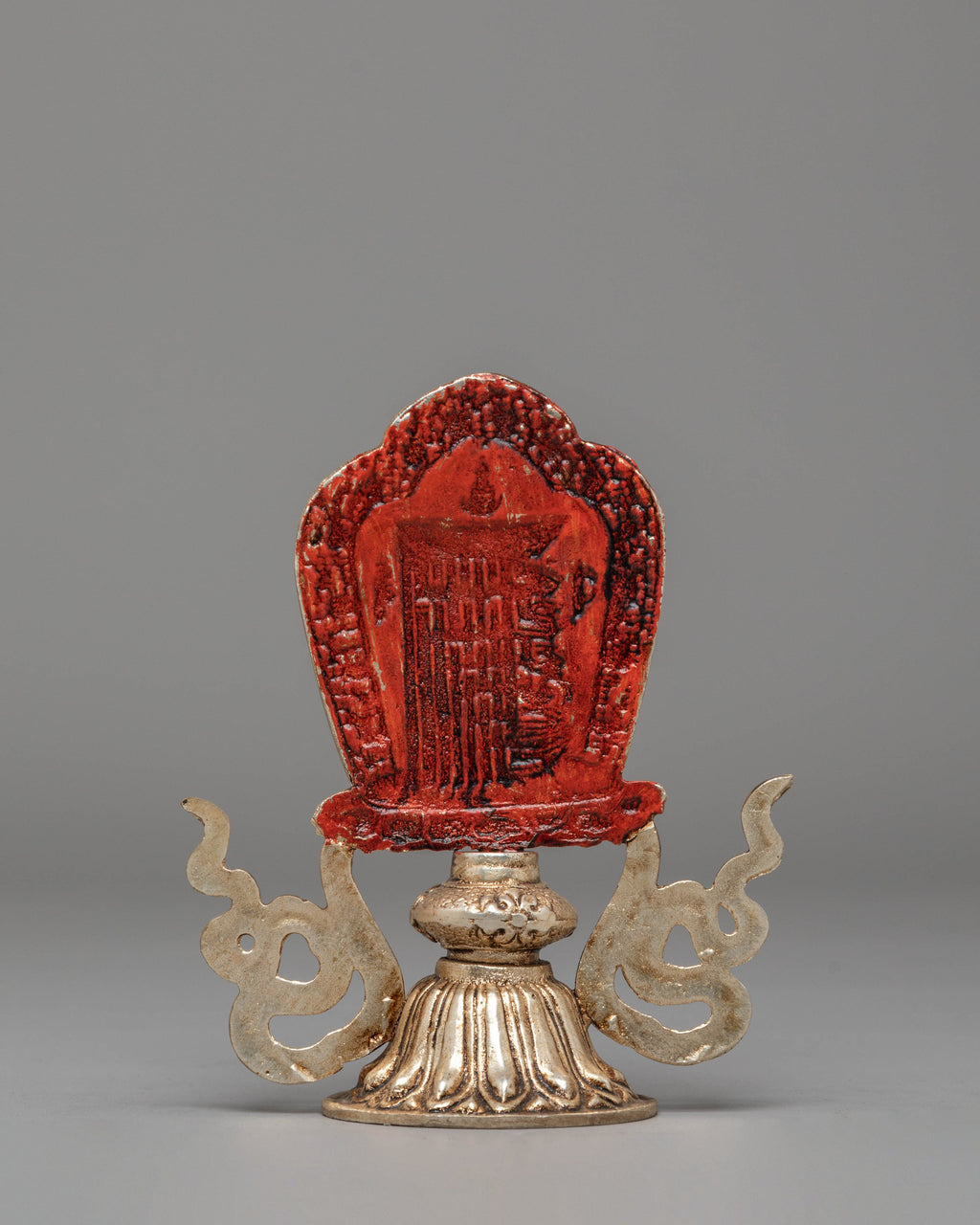 The vibrant red backdrop highlights the Kalachakra emblem, enhancing its visual impact and symbolic strength. Flowing flame-like shapes rise gracefully from both sides, representing transformative energy and the purification of the path to enlightenment. The lower section features classical lotus-inspired contours that symbolize spiritual growth, clarity, and awakening. Every element of the design carries deep cultural significance rooted in Tibetan ritual art.