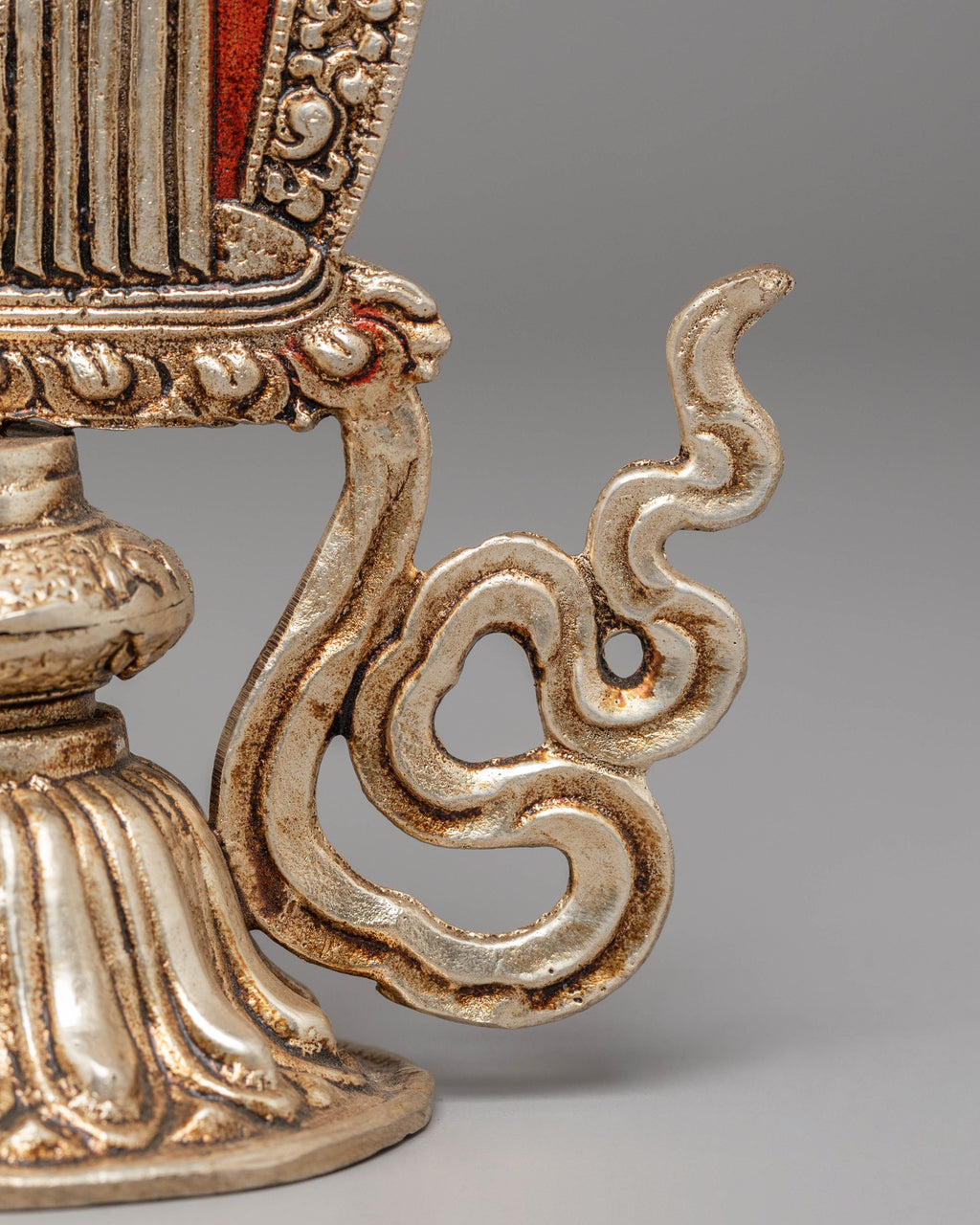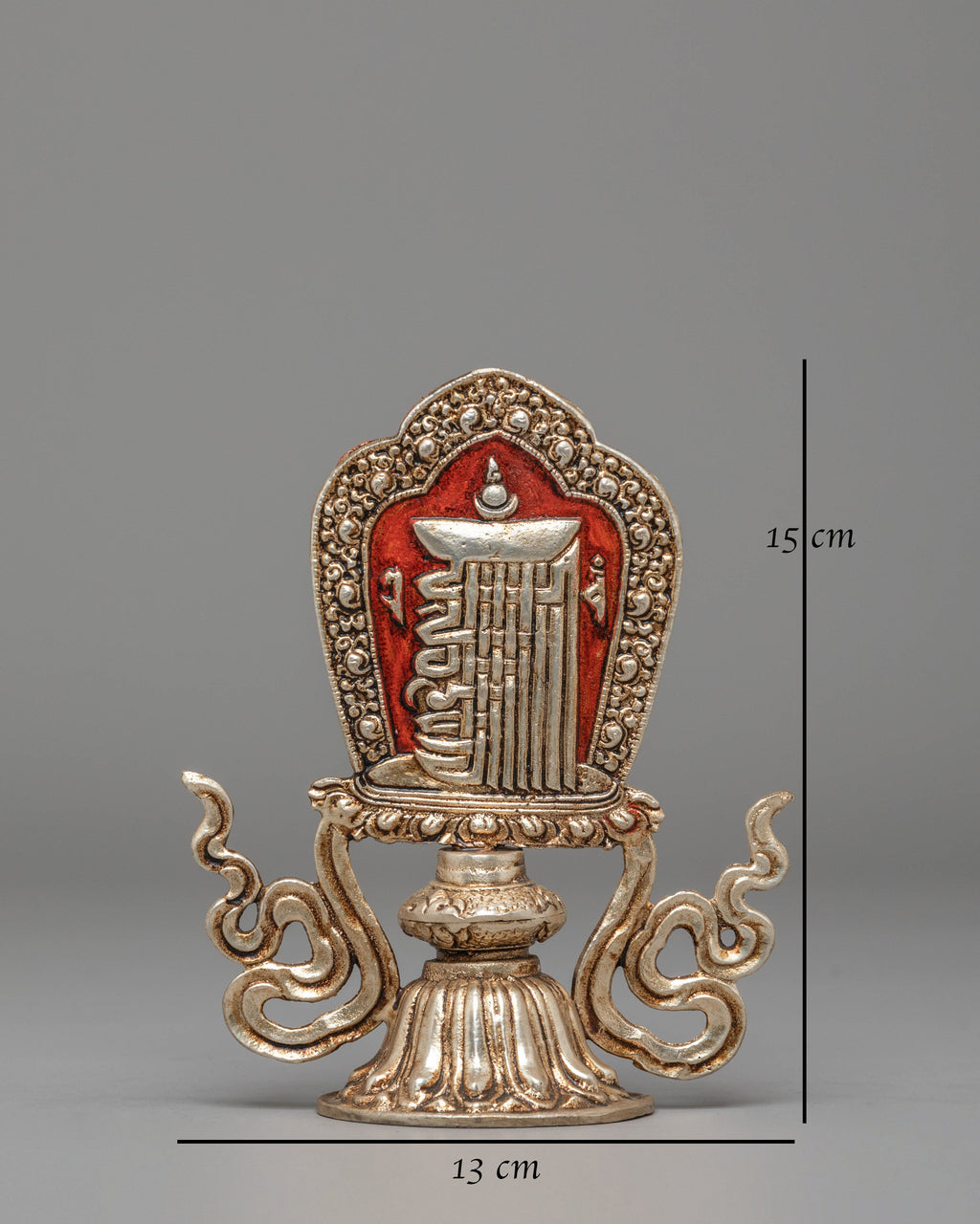This Sacred Kalachakra Decor showcases exquisite craftsmanship, with a copper body adorned with elegant silver plating, creating a spiritually radiant piece for any altar or meditation space. The central Kalachakra symbol is framed by a richly textured border with raised motifs, which add depth and presence to the design. Its intricate structure reflects the ancient spiritual traditions associated with the Wheel of Time, making it a meaningful piece for Buddhist practitioners and collectors alike.