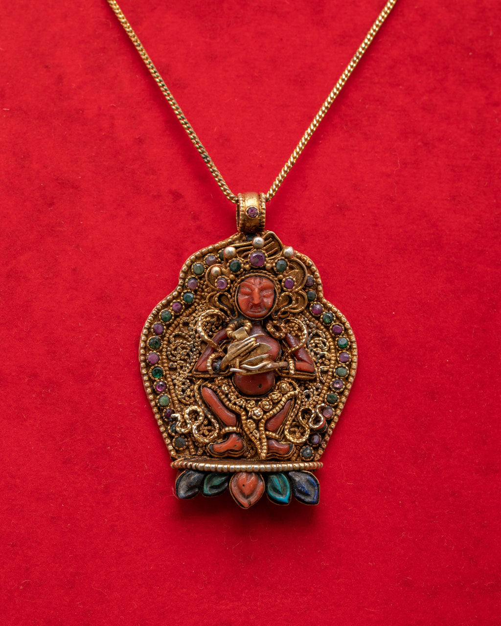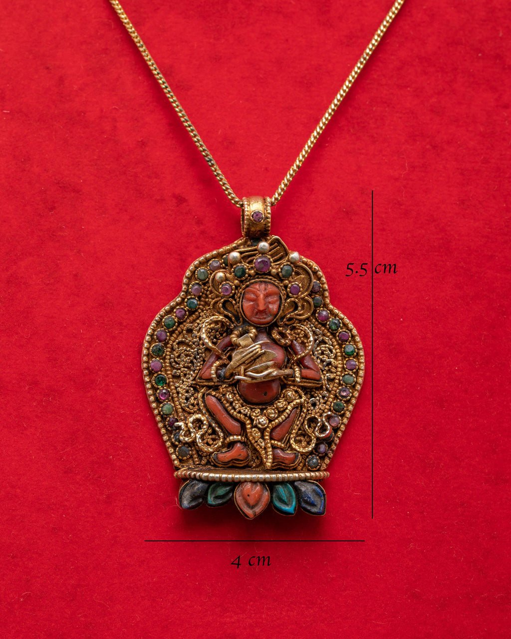 The wrathful deity jewelry piece displays exceptional artisanship, with detailed relief work that captures Mahakala's intimidating yet benevolent presence. Complete with his characteristic fierce eyes that see through deception and his powerful stance that commands respect from hostile forces, this piece showcases the deity's formidable presence. The coral stones embedded throughout represent life force energy and courage, while the turquoise elements provide healing and protective vibrations. The gold plating adds divine luminescence that amplifies the pendant's guardian power, transforming this piece into both a potent spiritual shield and an extraordinary work of devotional art that connects the wearer to ancient protective traditions.