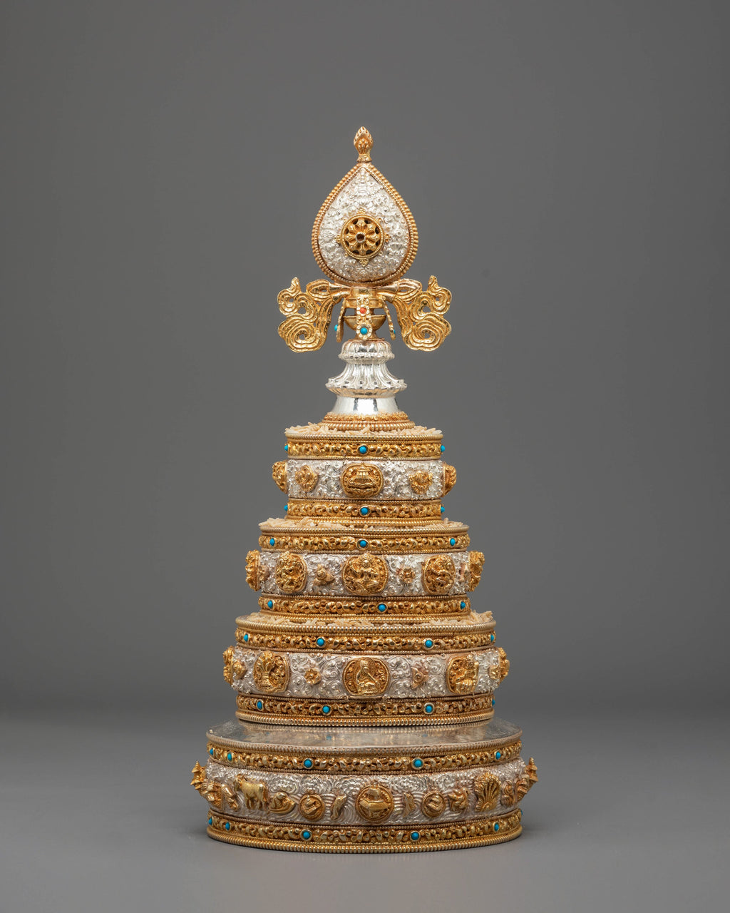 This Sacred Mandala Wall Hanging for Meditation is a beautifully handcrafted piece created with a copper body, pure silver, fire gold, and vibrant turquoise and coral stones. Its tiered structure and ornate symbols reflect traditional spiritual artistry, making it an inspiring addition to any meditation or reflection space. Each layer is thoughtfully designed with meaningful motifs, including sacred animals and protective emblems that carry deep cultural significance. These elements work together to create a powerful visual representation of inner balance and spiritual focus.