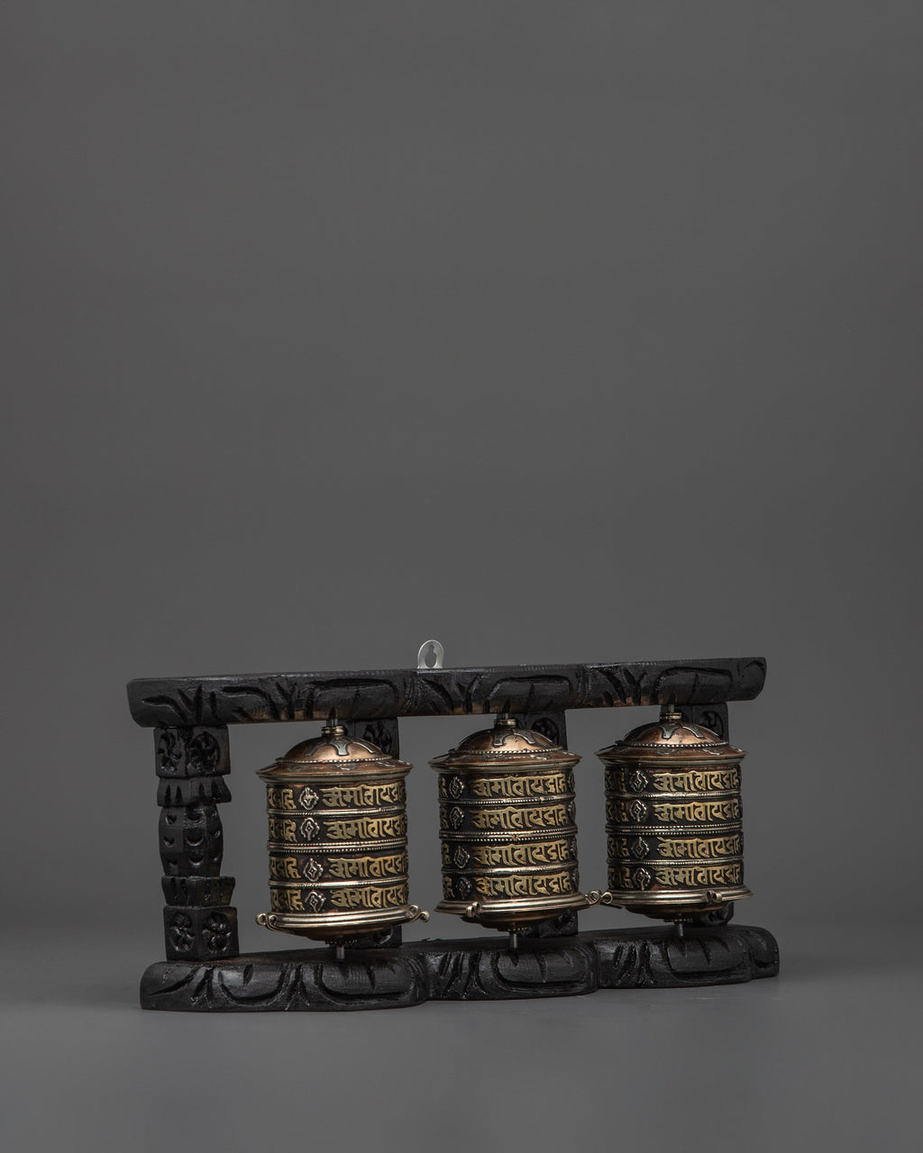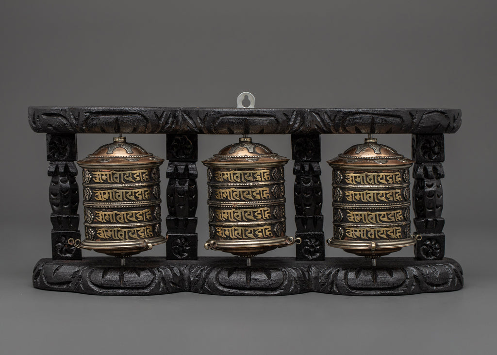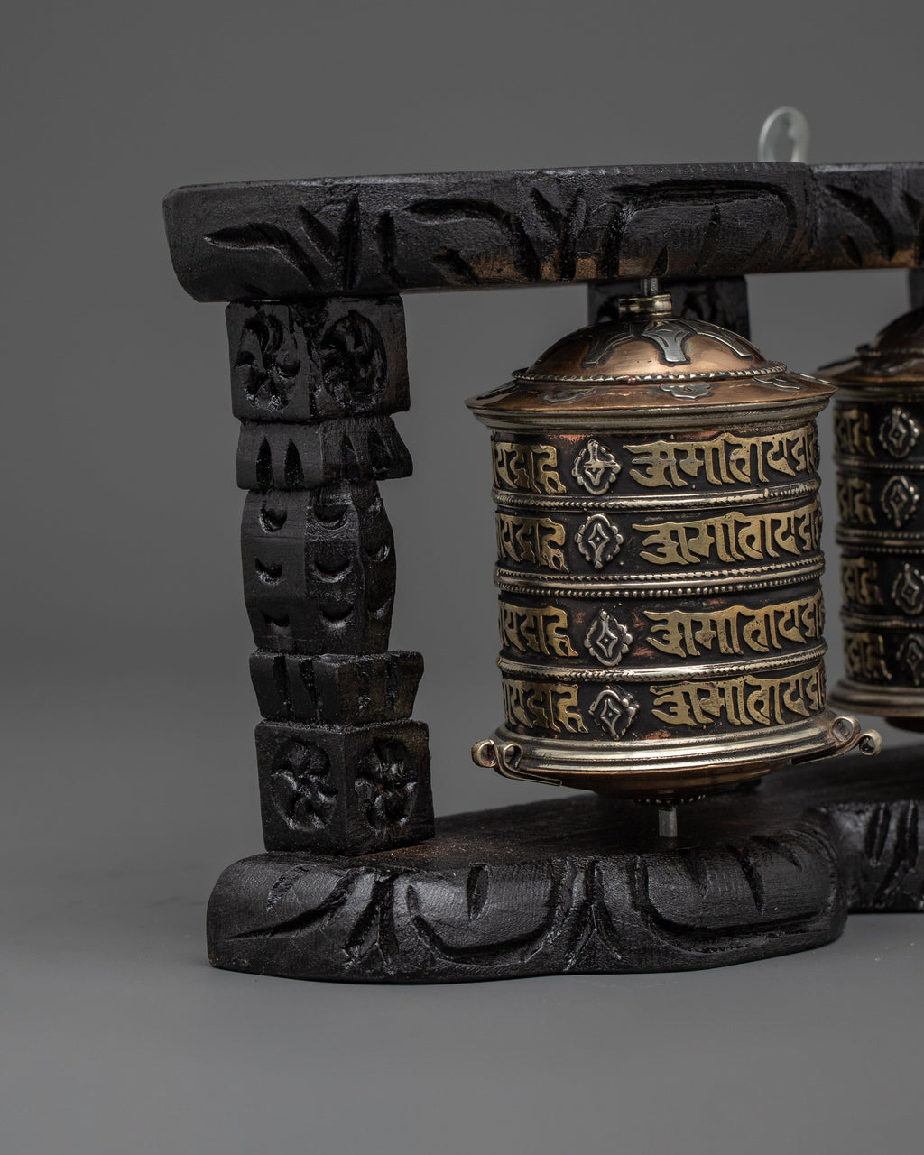 Each wheel, mounted on a beautifully carved wooden frame, spins gently and is designed to contain scrolls of sacred texts within. With each rotation, the energy of prayer is increased. Copper and brass combine to create a traditional Himalayan appearance while raising the space's vibrational frequency. Ideal for spiritual ceremonies, home shrines, or as a meaningful present, this prayer wheel set is both a devotional tool and a magnificent piece of spiritual art.
