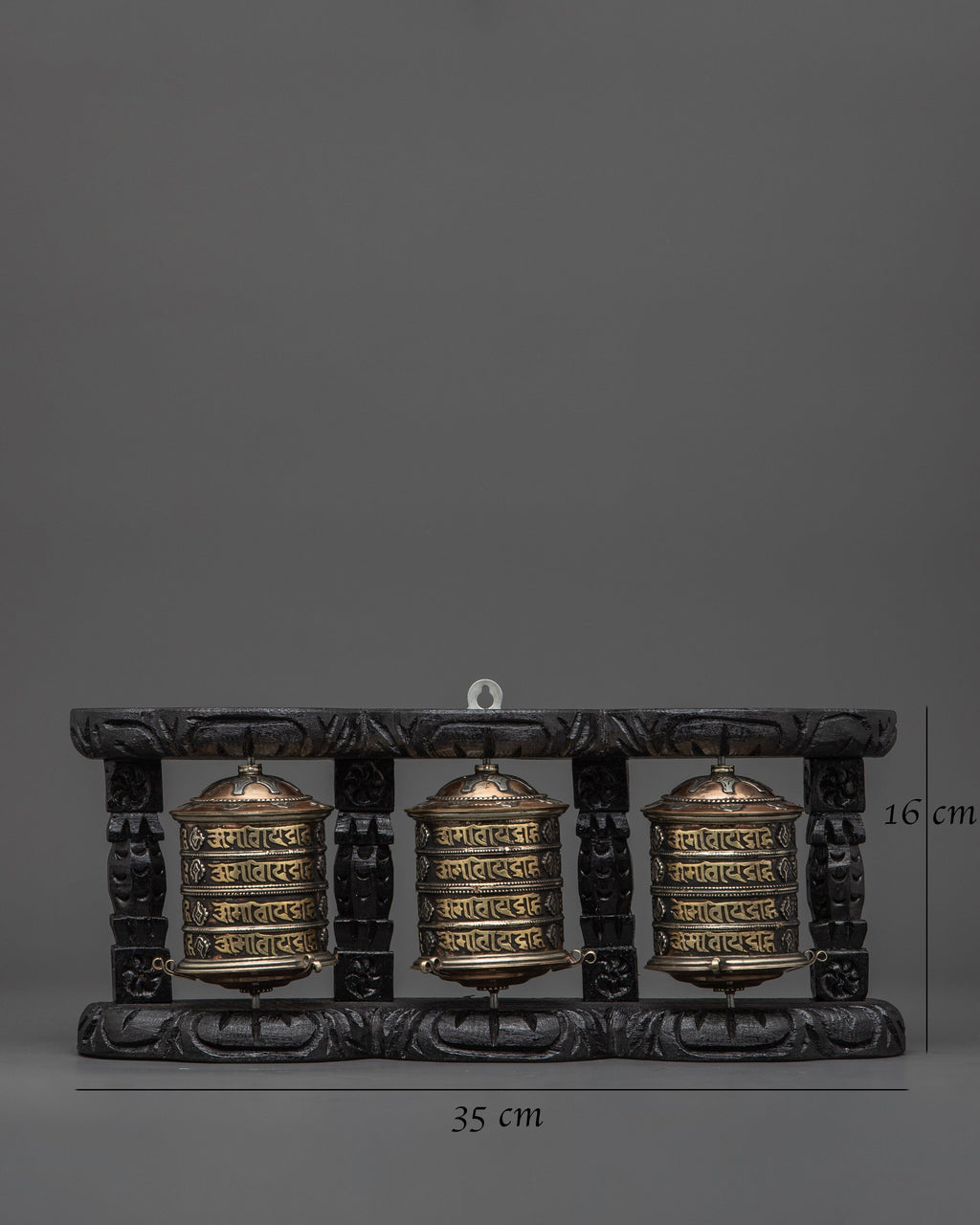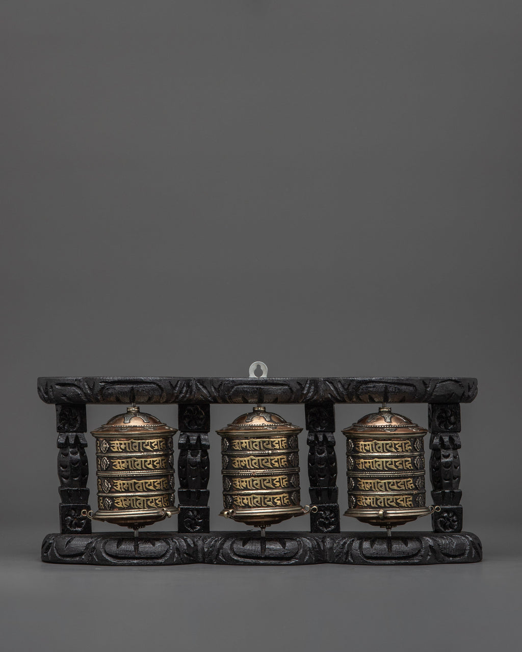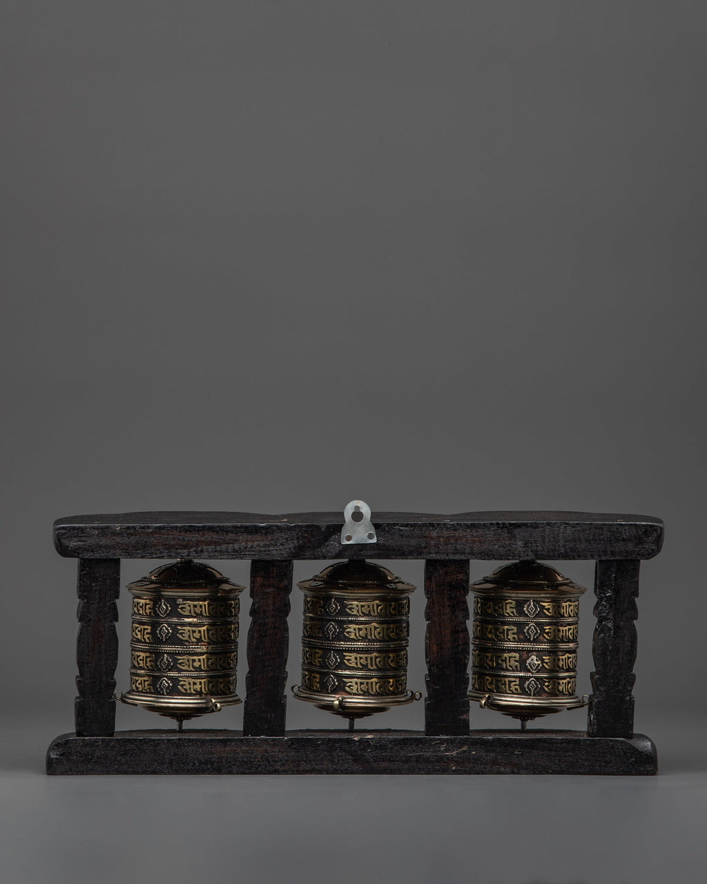 Each wheel, mounted on a beautifully carved wooden frame, spins gently and is designed to contain scrolls of sacred texts within. With each rotation, the energy of prayer is increased. Copper and brass combine to create a traditional Himalayan appearance while raising the space's vibrational frequency. Ideal for spiritual ceremonies, home shrines, or as a meaningful present, this prayer wheel set is both a devotional tool and a magnificent piece of spiritual art.