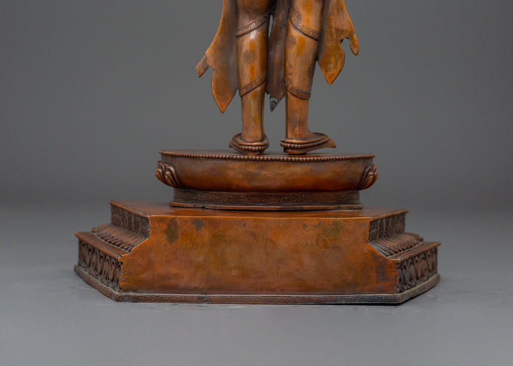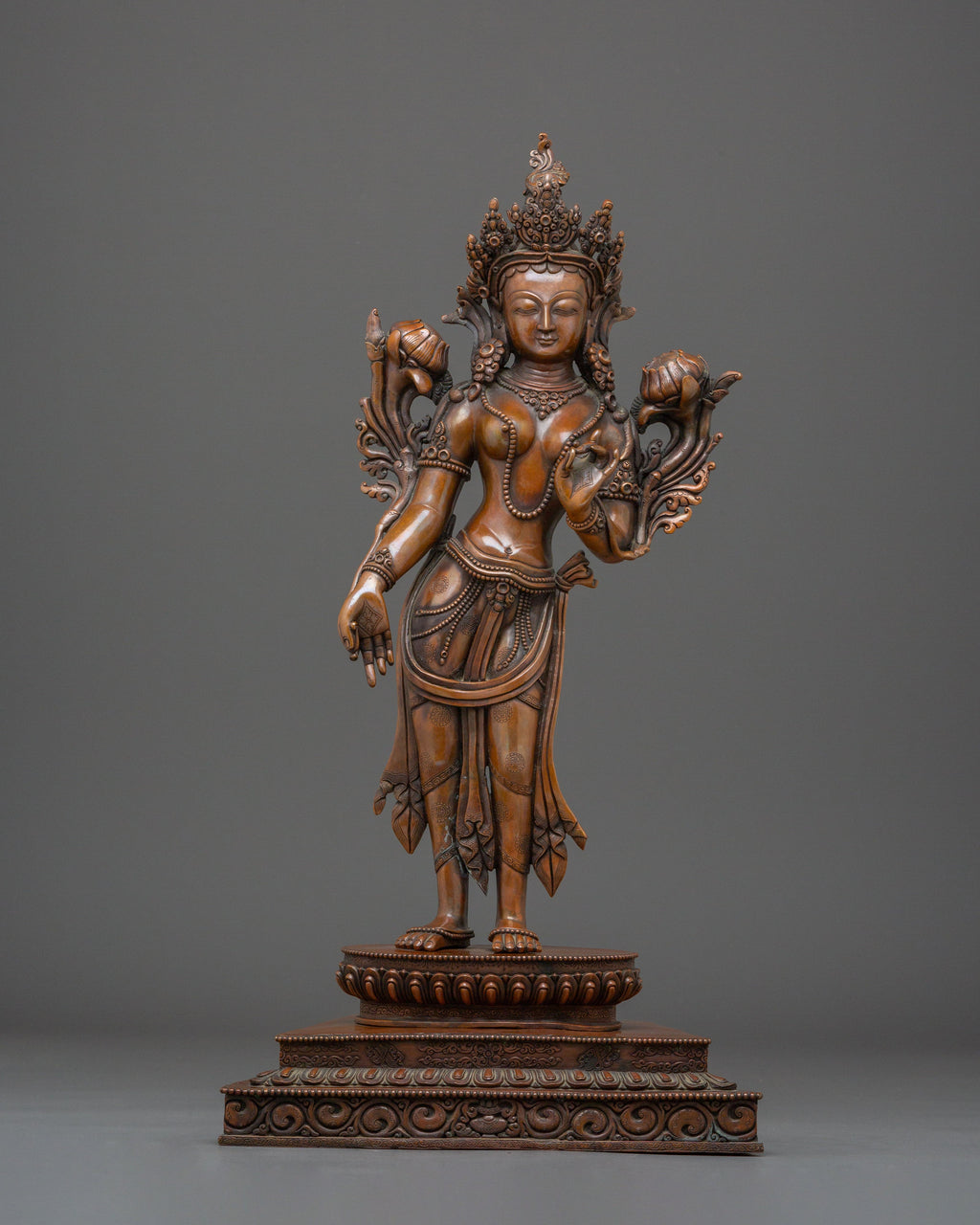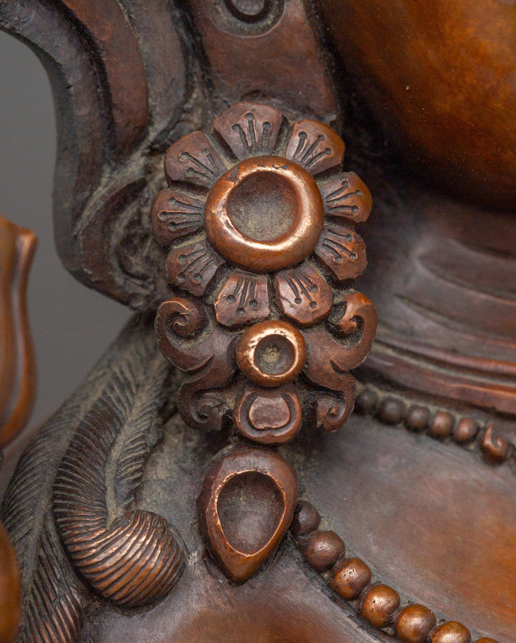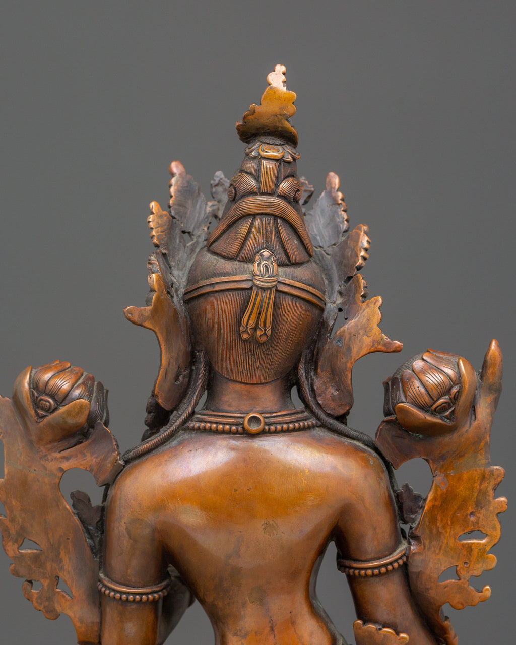 Handcrafted from oxidized copper, the statue’s intricate details come to life with the unique depth and texture created by the natural oxidation process. The fine craftsmanship reflects the skill of traditional artisans from the Himalayan and Tibetan regions, with every delicate element, from the positioning of Tara's hands to the folds of her robe, meticulously sculpted. The ancient aesthetic of the copper, coupled with the graceful representation of Tara, evokes the connection to centuries of religious art and history.