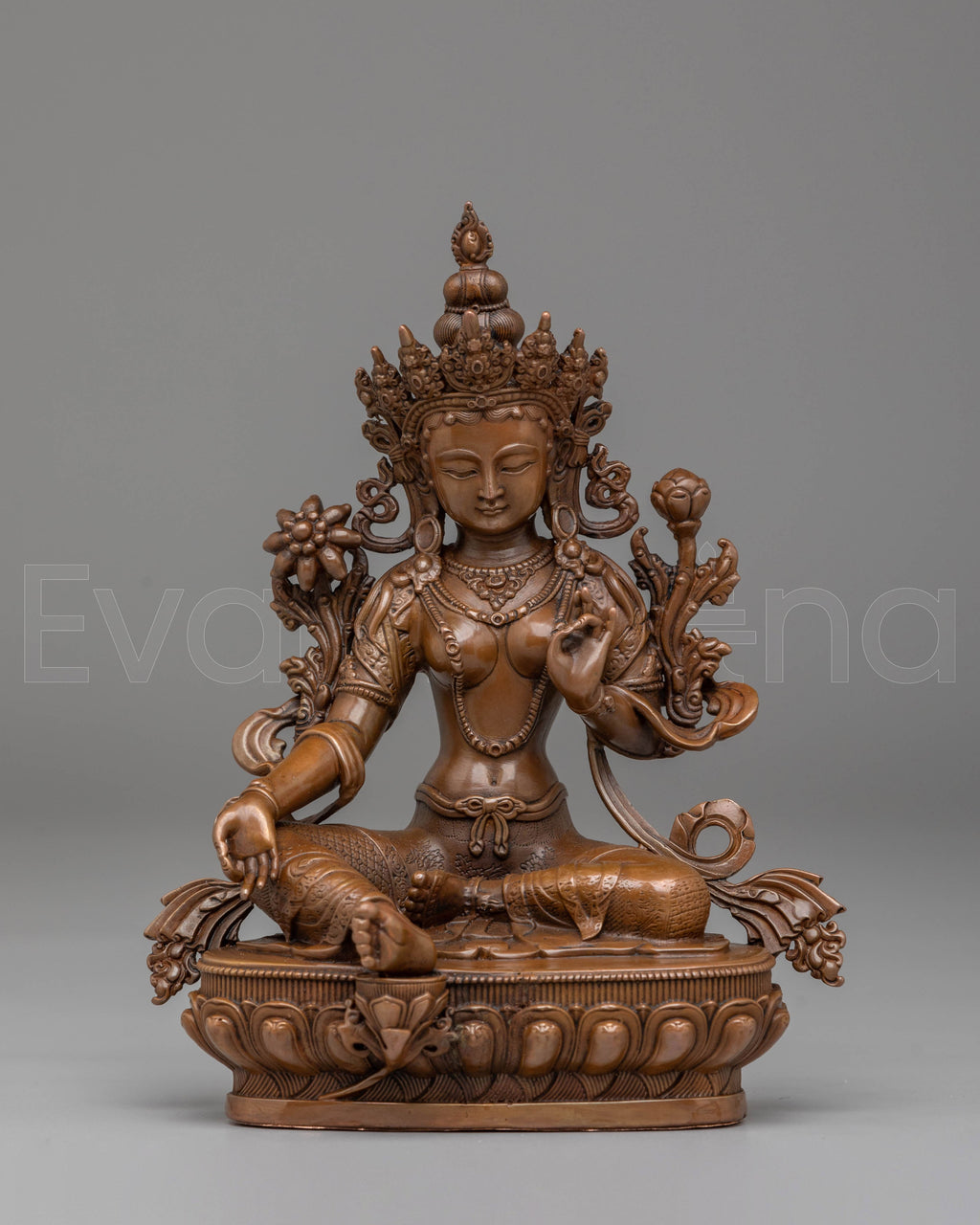 Green Tara is a principal deity who guides confused and distracted beings back to their original state. She assists in releasing attachment to specific outcomes, helping individuals regain energy and generate inner peace and clarity. Believed to be incarnate in every pious woman, she is considered a protector who comes to our aid, relieving physical, emotional, and spiritual suffering. Green Tara is often invoked to overcome fear and to achieve personal freedom.