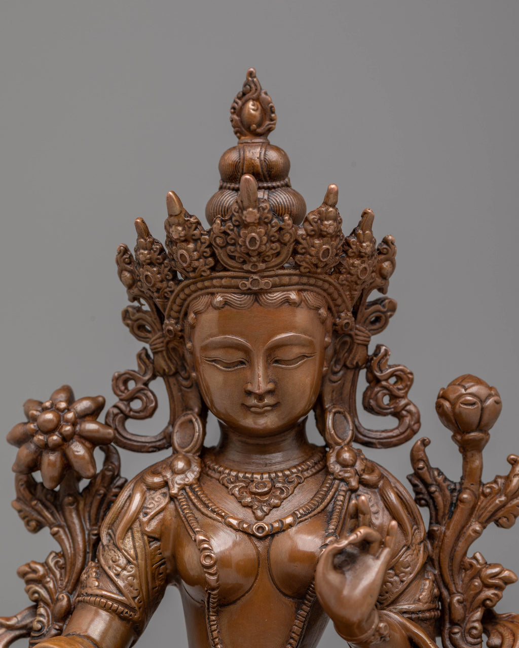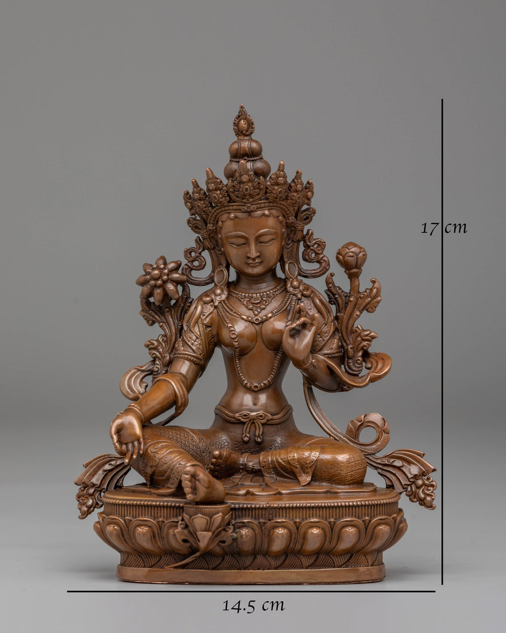 This Shyama Tara statue depicts the revered Green Tara, a beloved figure in Tibetan Buddhism known for her swift compassion and fearless protection. Standing 17 cm tall and 14.5 cm wide, this handcrafted statue is crafted from oxidized copper, giving it a rich, antique appearance that enhances its spiritual presence. Green Tara, also known as the "Mother of Liberation," is highly venerated for her ability to protect and guide practitioners through obstacles and challenges. This statue beautifully captures her serene yet powerful energy, making it an essential addition to any altar or sacred space.