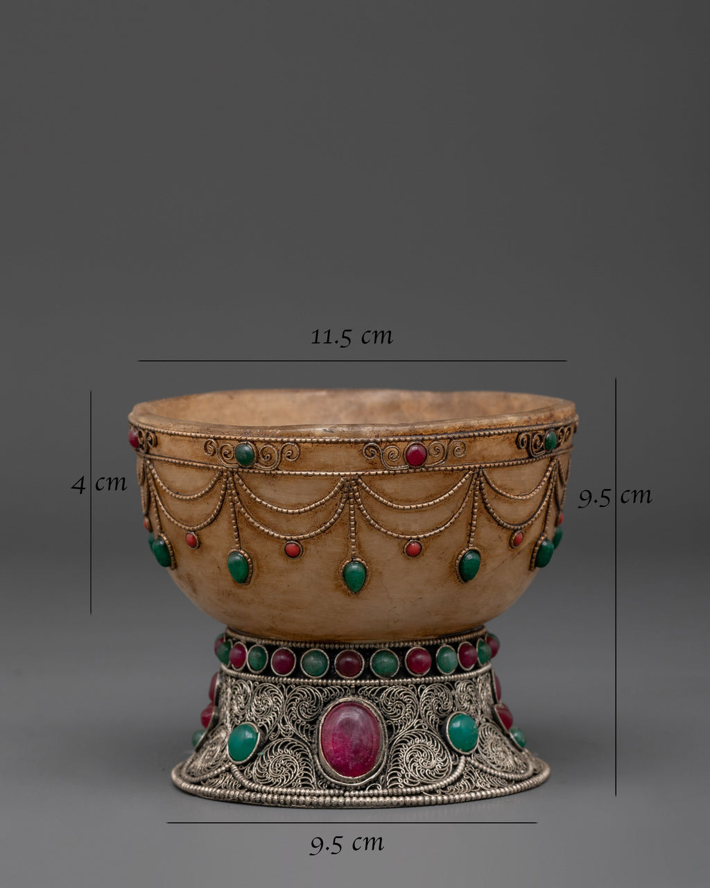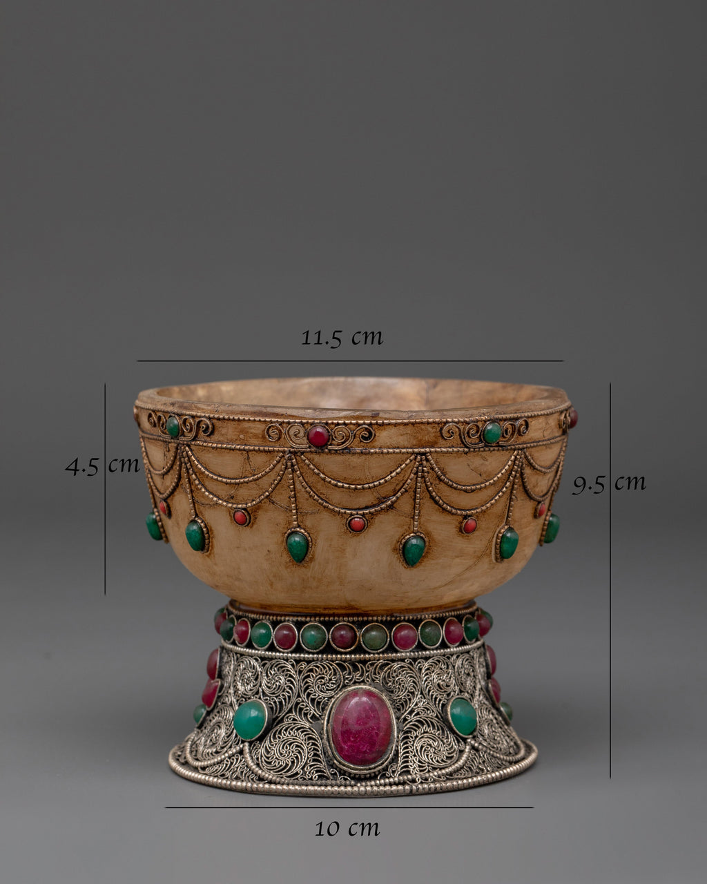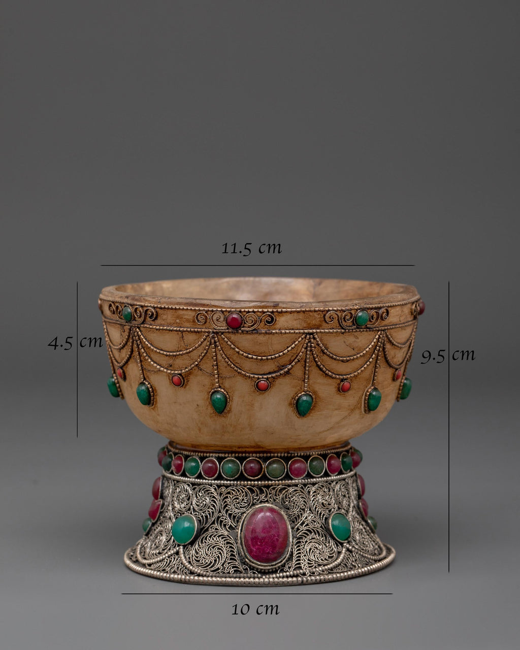 The combination of crystal copper and silver plating not only enhances the bowl's spiritual significance but also adds to its beauty. Perfect for holding offerings like incense, water, or fruits during Tibetan rituals and meditation ceremonies, these bowls bring a sacred touch to your practice. The addition of carefully placed artificial stones adds an extra layer of aesthetic elegance, making each bowl a striking centerpiece in your altar or meditation space. Designed to inspire reverence and mindfulness, these offering bowls help create a serene environment that supports your spiritual growth and connection.