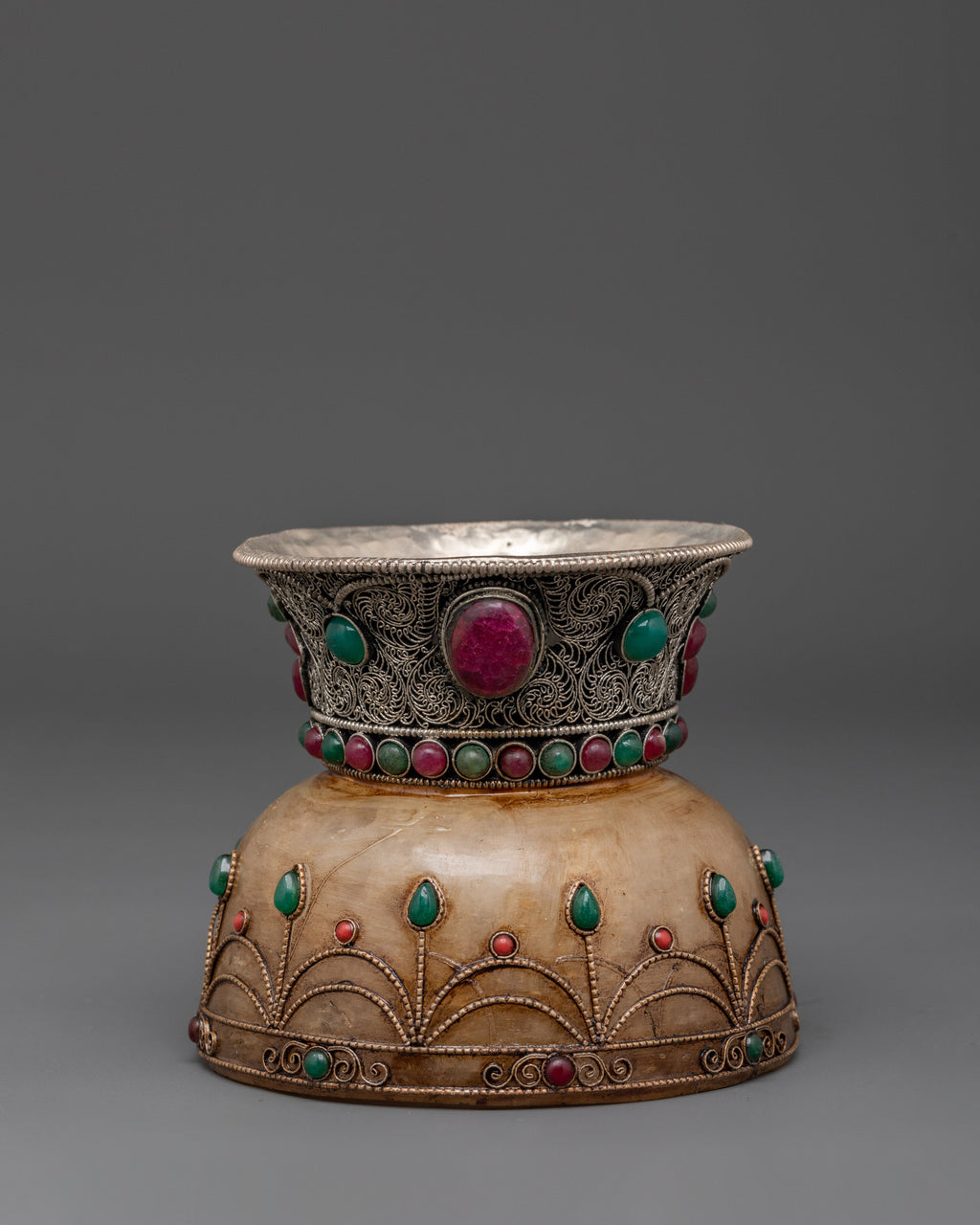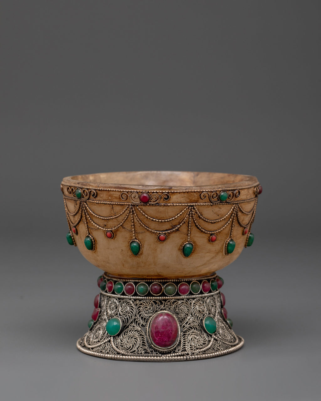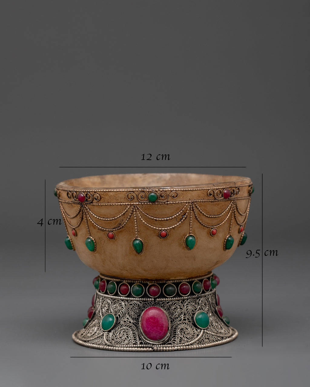 The combination of crystal copper and silver plating not only enhances the bowl's spiritual significance but also adds to its beauty. Perfect for holding offerings like incense, water, or fruits during Tibetan rituals and meditation ceremonies, these bowls bring a sacred touch to your practice. The addition of carefully placed artificial stones adds an extra layer of aesthetic elegance, making each bowl a striking centerpiece in your altar or meditation space. Designed to inspire reverence and mindfulness, these offering bowls help create a serene environment that supports your spiritual growth and connection.