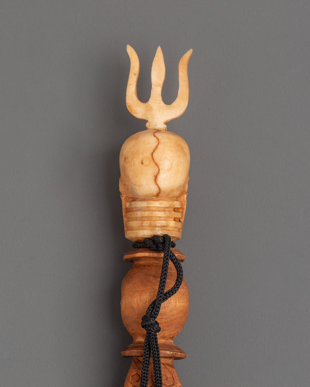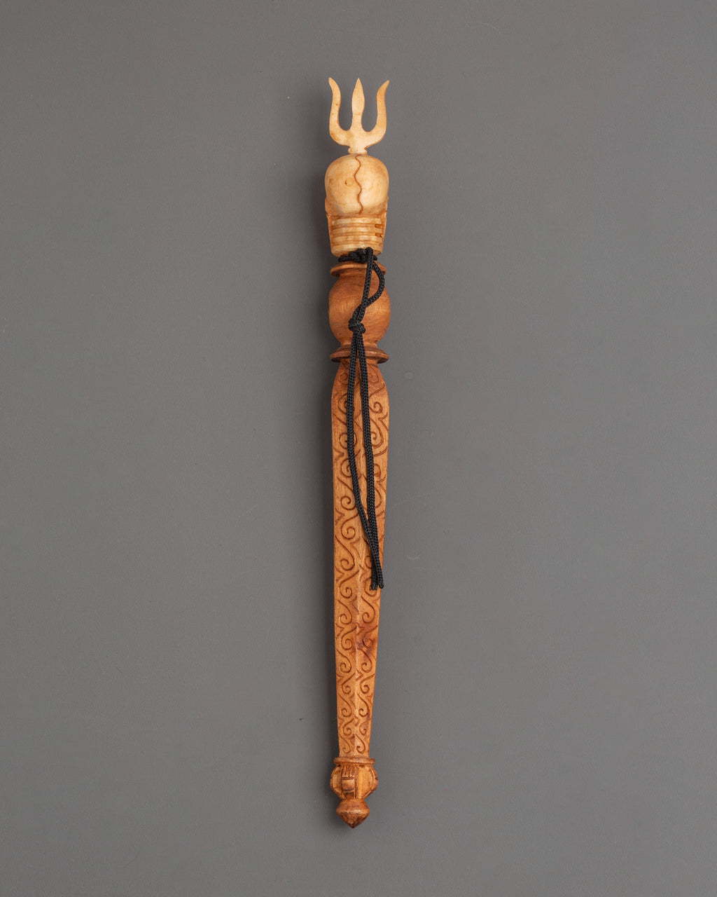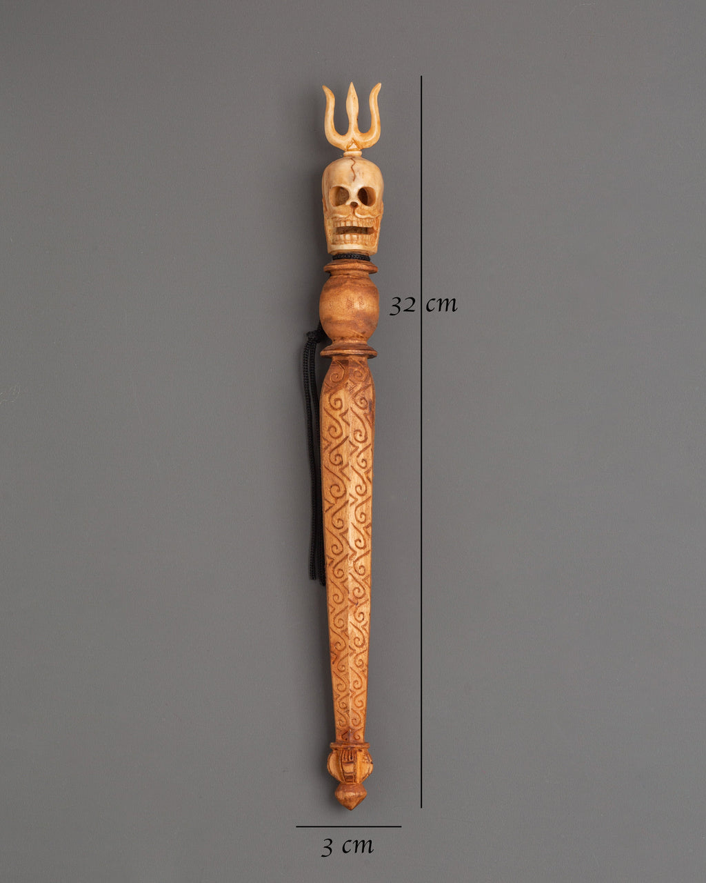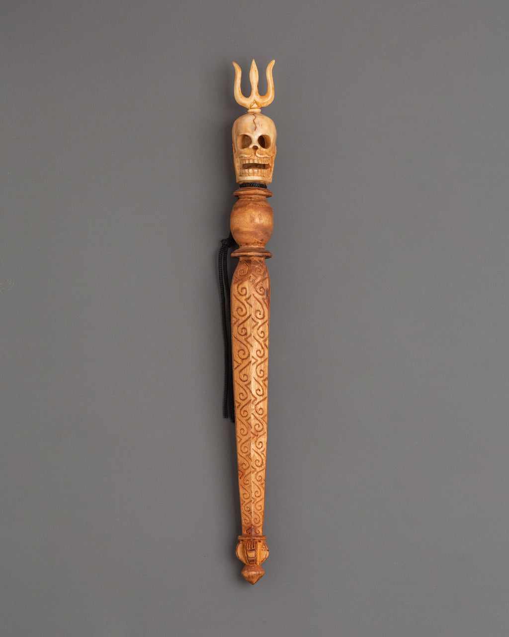 The elaborate design includes a carved skull image at the top, crowned with a trident, which represents overcoming ego, the impermanence of life, and the threefold wisdom of body, speech, and mind. The handle is intricately decorated with etched designs, and the triple-bladed base symbolizes cutting through illusion and binding destructive forces. The combination of wood and bone craftsmanship emphasizes traditional creativity, making this Phurba a strong ceremonial tool as well as a one-of-a-kind spiritual treasure.