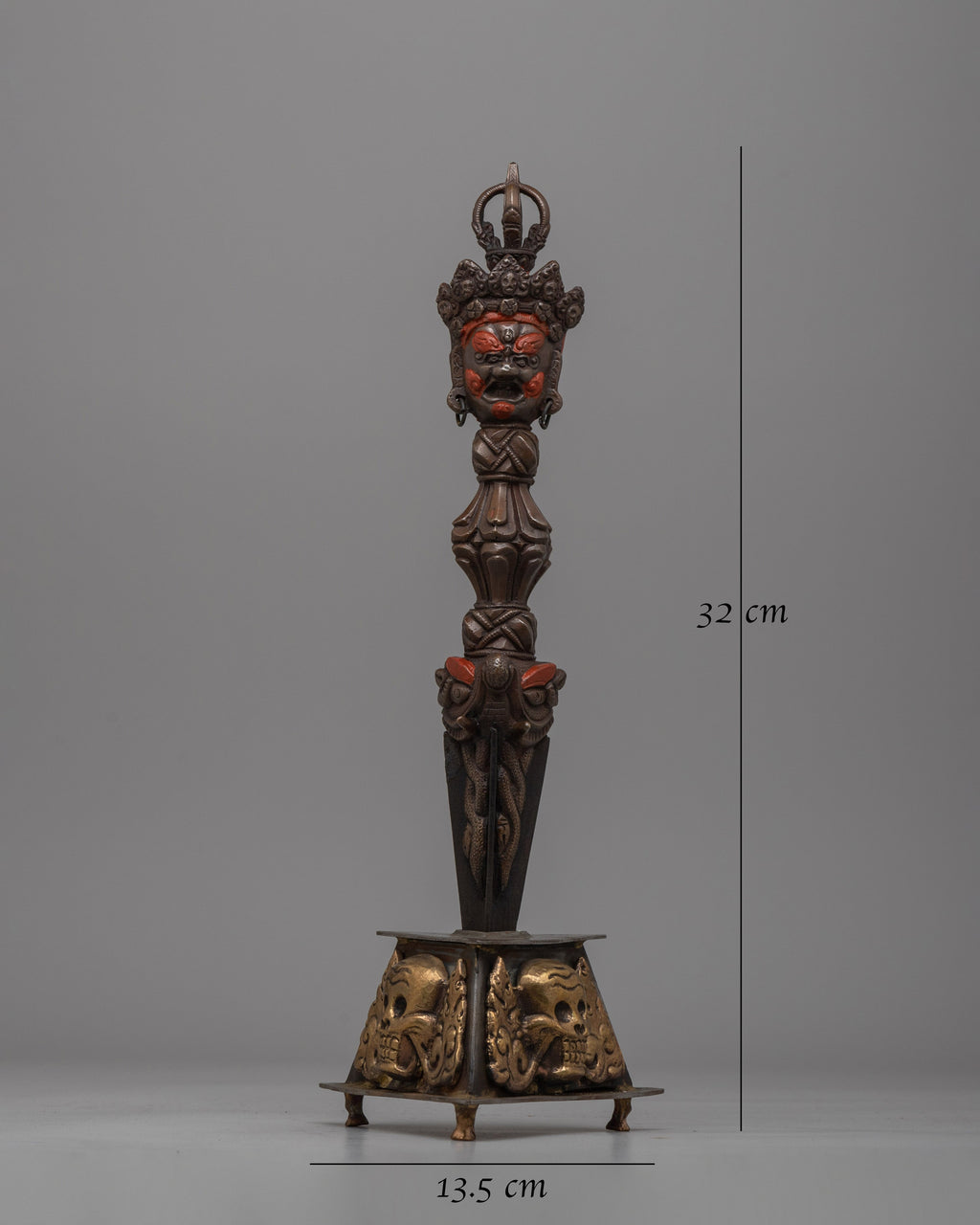 The Sacred Phurba Ritual Dagger is a stunning ceremonial artifact made of brass with an oxidized finish and resting on an artistically carved iron base. This Phurba, measuring 32 cm tall and 13.5 cm wide and weighing 1.50 kg, represents both strength and divine artistry. Its sturdy materials and antique polish emphasize its spiritual significance, making it an important component in traditional Vajrayana Buddhist ceremonies for eliminating negativity and invoking protection.