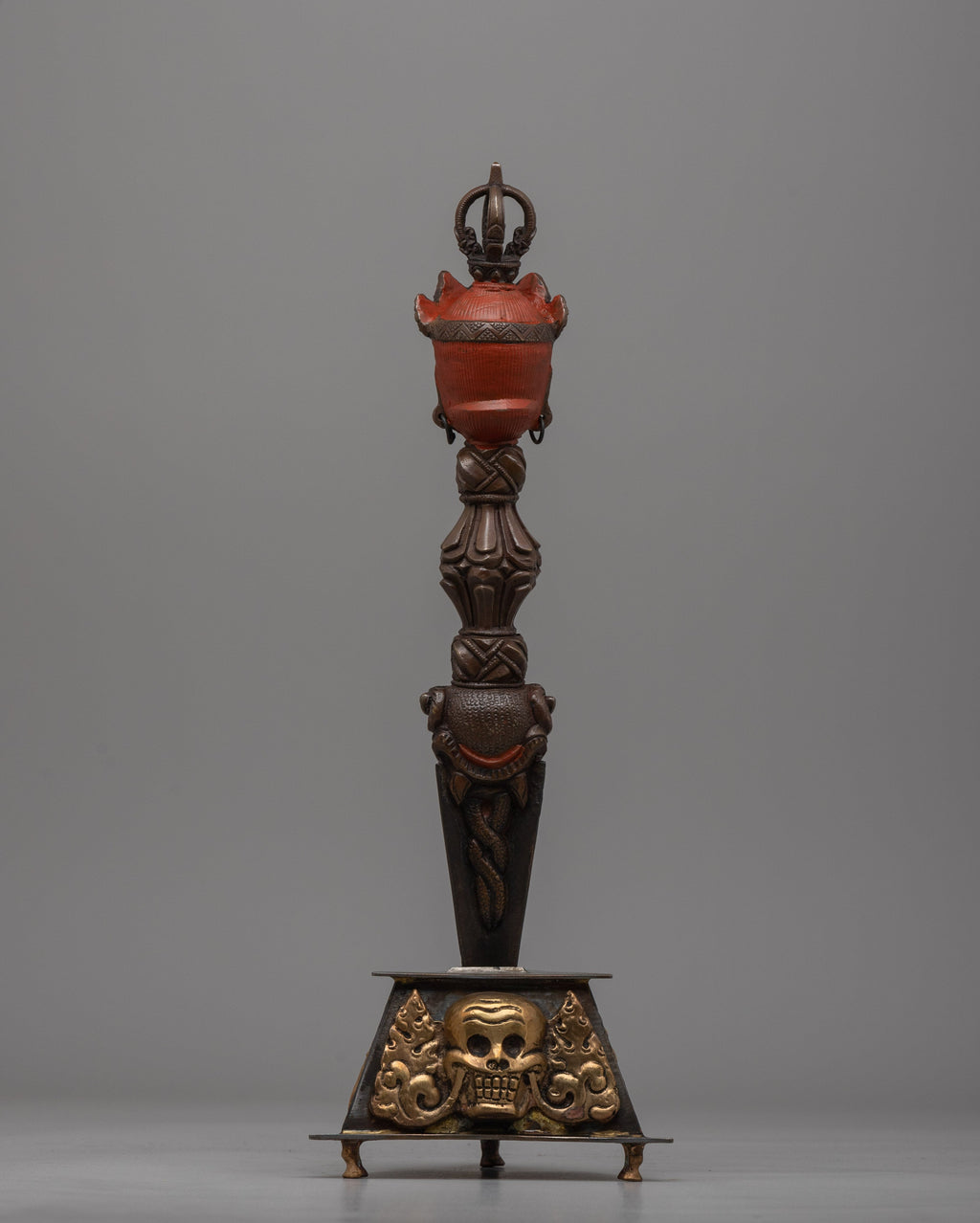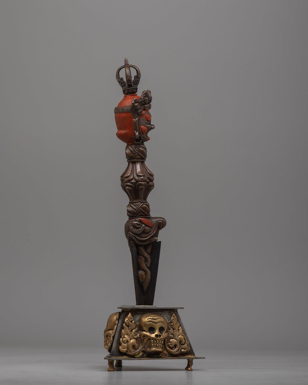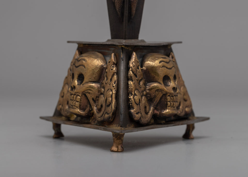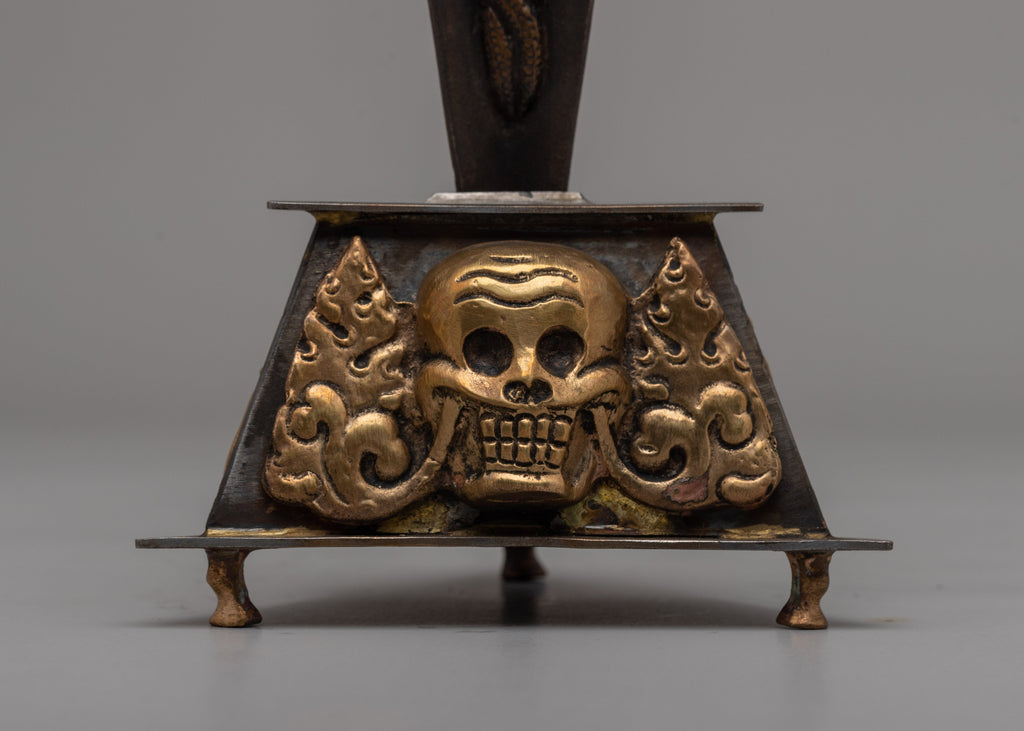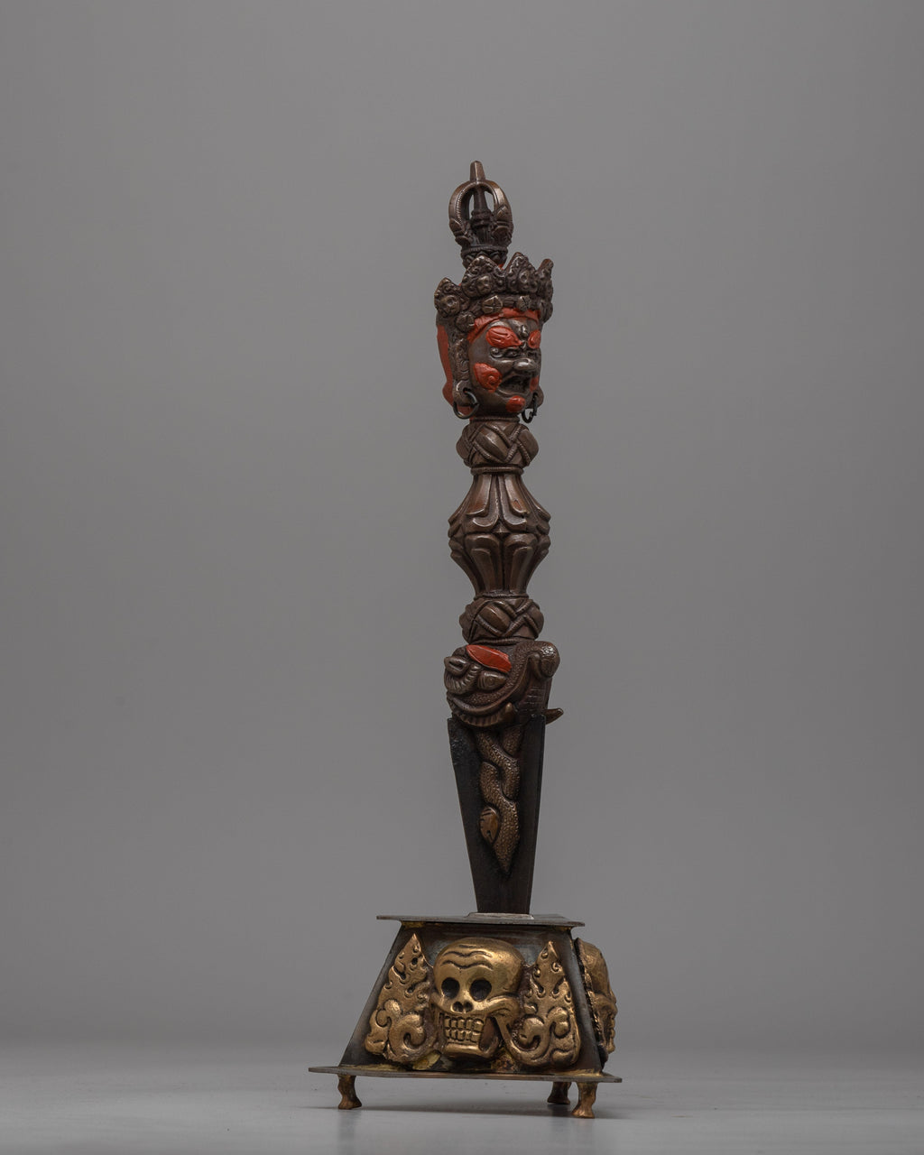 This Phurba has an imposing deity figure at the top, oozing power and authority. The blade's intricate engravings reflect the unification of conflicting forces, symbolizing harmony and spiritual balance. The iron foundation, which is embellished with skull designs, represents the change of ignorance and ego into wisdom and awakening. This Phurba is often utilized in tantric ceremonies and is acclaimed for its capacity to channel energies, overcome obstacles, and help practitioners achieve spiritual focus and freedom. Its excellent craftsmanship and symbolic profundity make it a powerful depiction of Buddhist rituals.