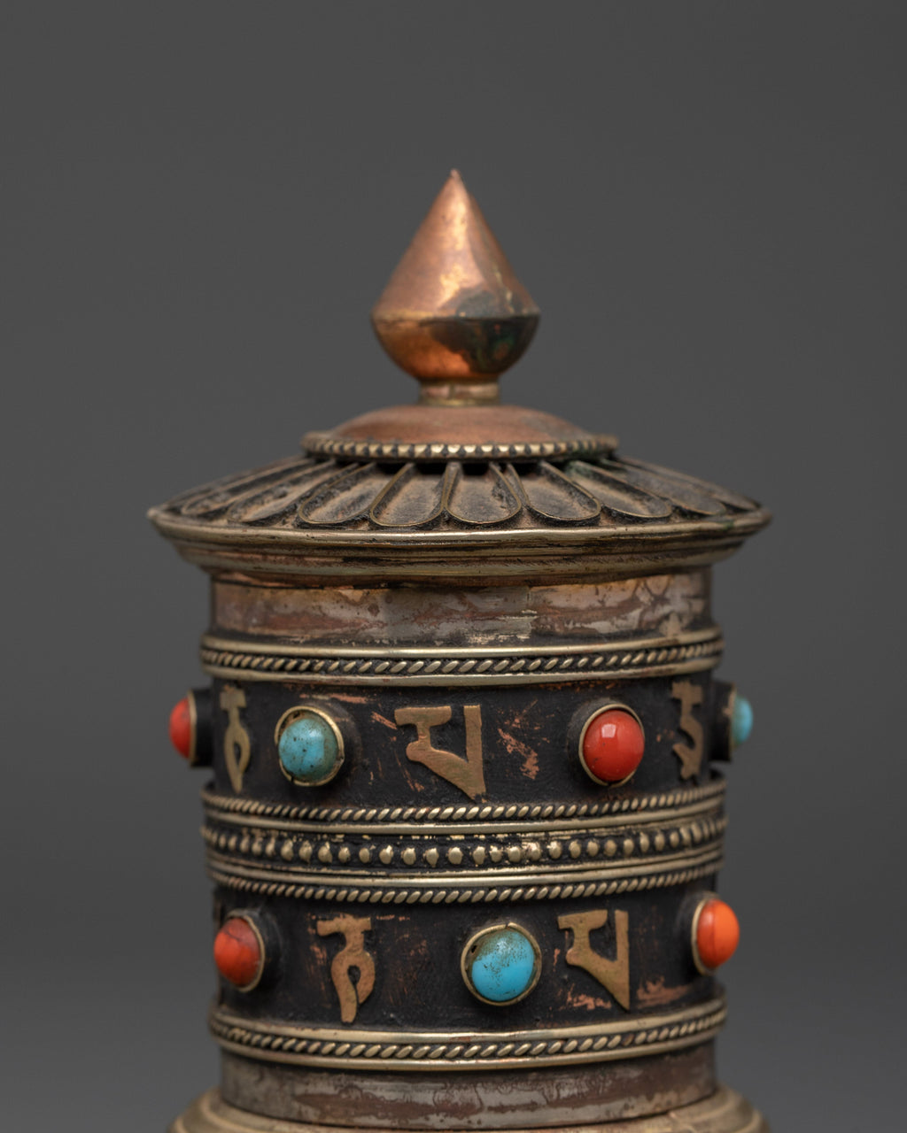 Ideal for Buddhist practitioners, meditation enthusiasts, and spiritual collectors, this Gemstone Buddhist Prayer Wheel enhances inner peace, mindfulness, and sacred energy. Discover how the fusion of brass, turquoise, and coral infuses your home or altar with serenity and spiritual symbolism. Perfect as a spiritual décor piece or a meaningful gift for anyone seeking Tibetan Buddhist art, meditation tools, and mindful living décor.