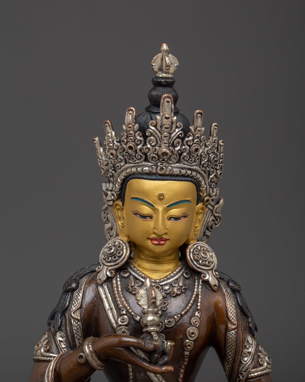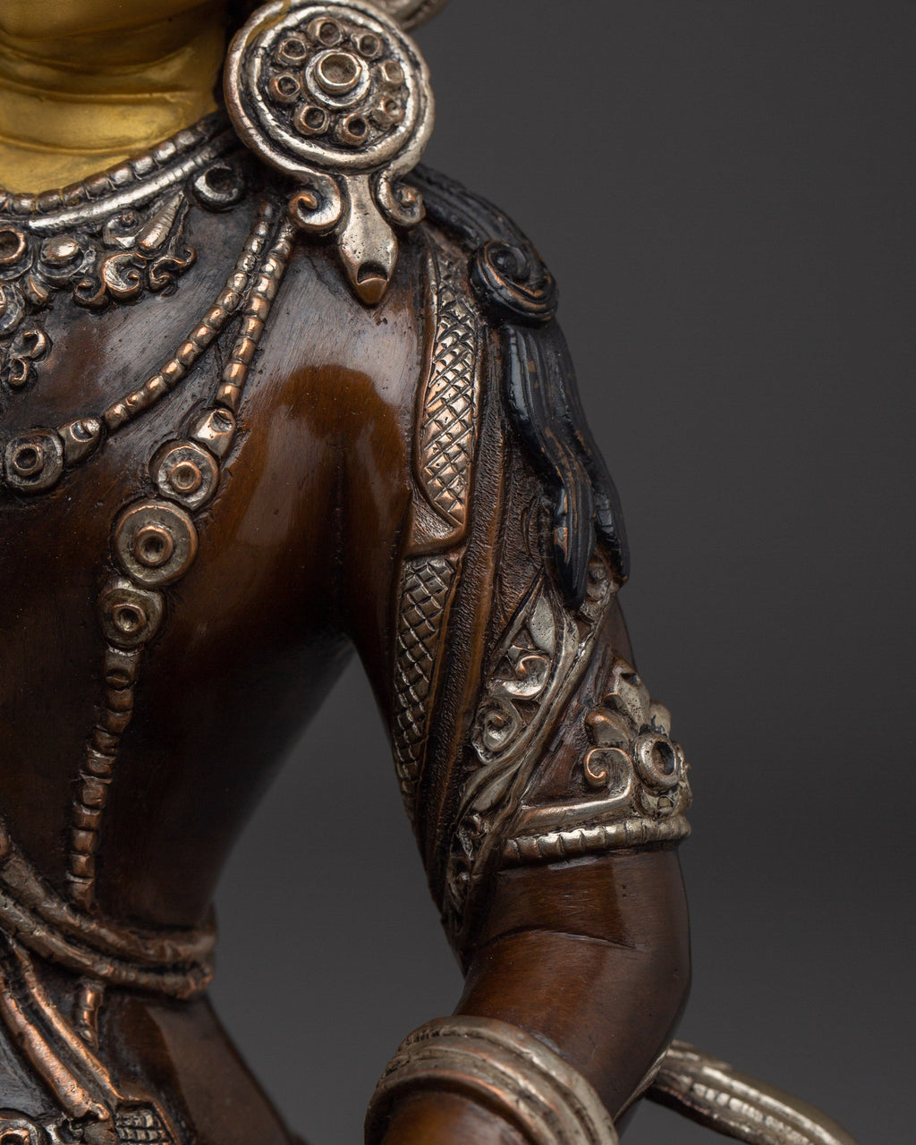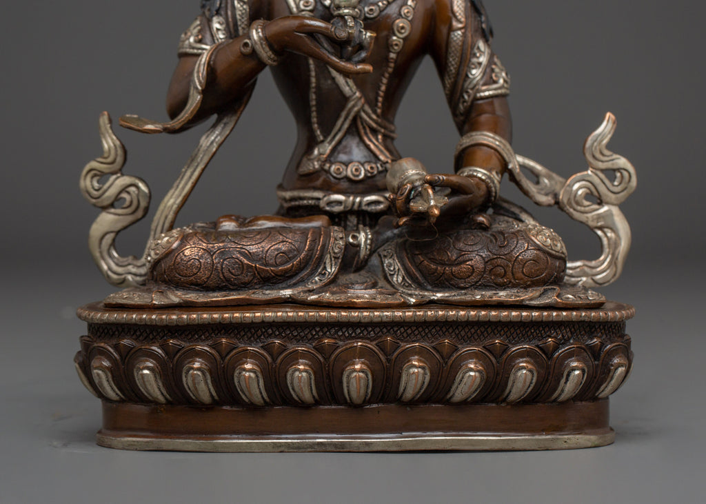 This Tibetan Sacred Purifier Vajrasattva Statue stands at 10”/25.5cm in height and 7.5”/19cm at the base, weighing 1.90 kg. Made from oxidized copper with silver plating and detailed with acrylic paintings, this piece embodies traditional Tibetan craftsmanship. Expertly handcrafted by skilled artisans, it serves as a sacred purifier symbolizing cleansing and spiritual renewal, making it a meaningful addition to altars and meditation spaces.