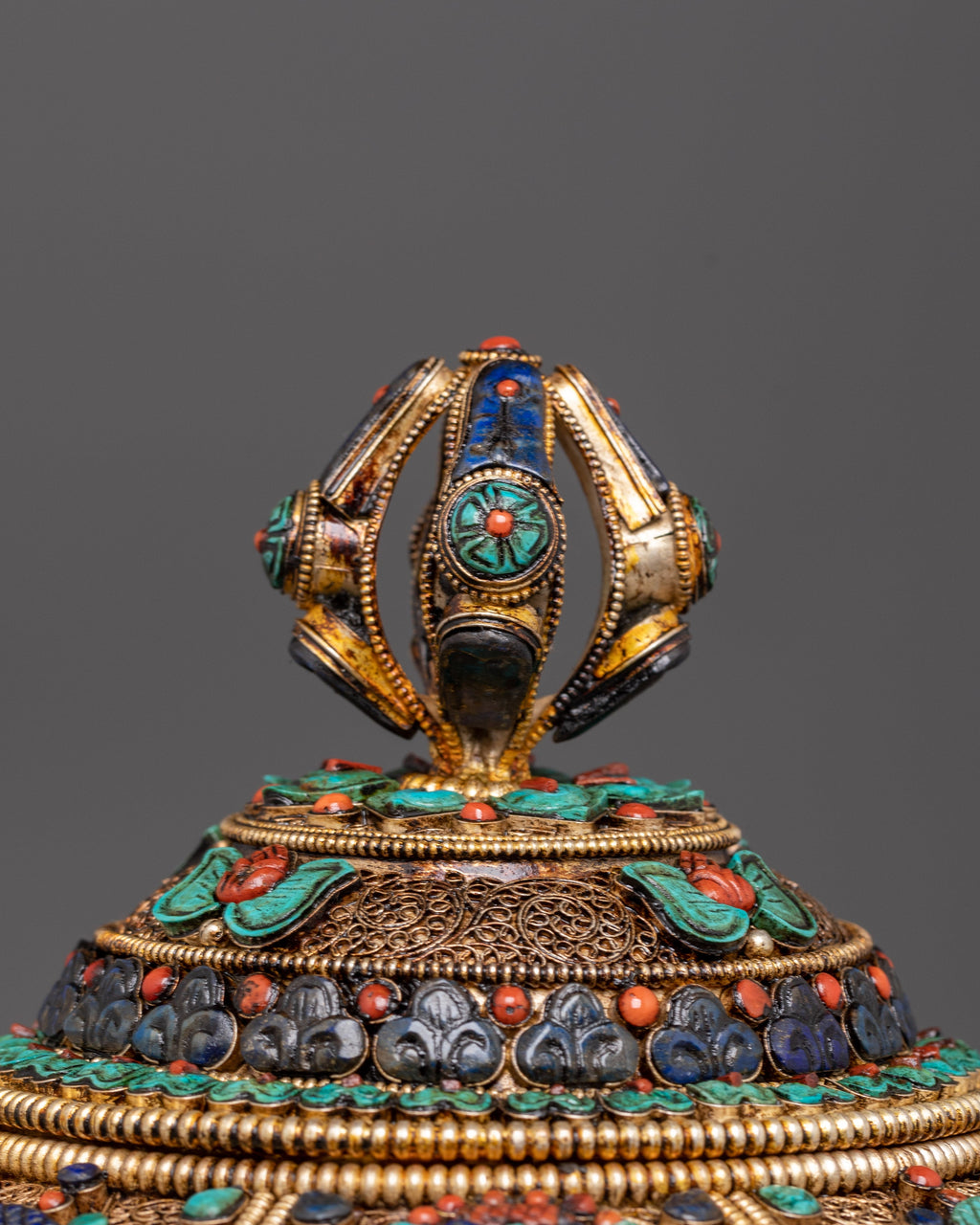 The Sacred Rice Offering Pot is handcrafted with meticulous attention to detail, including complex patterns and symbolic motifs that reflect Tibetan workmanship and spiritual symbolism. The combination of gold and silver plating gives the vessel a bright glow, while the gemstone accents boost its spiritual energy, bringing blessings and positive vibes. Each feature of the pot, from the engraved motifs to the meticulously inlaid lapis lazuli, turquoise, and coral, exudes reverence and dedication, making it an ideal ritual instrument or sacred decorative piece in your spiritual surroundings.