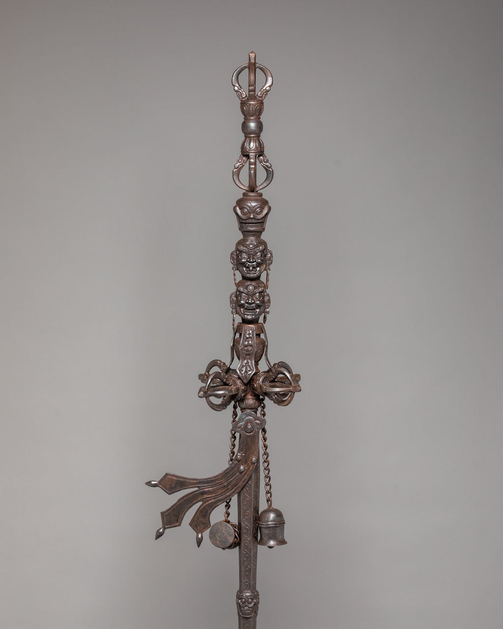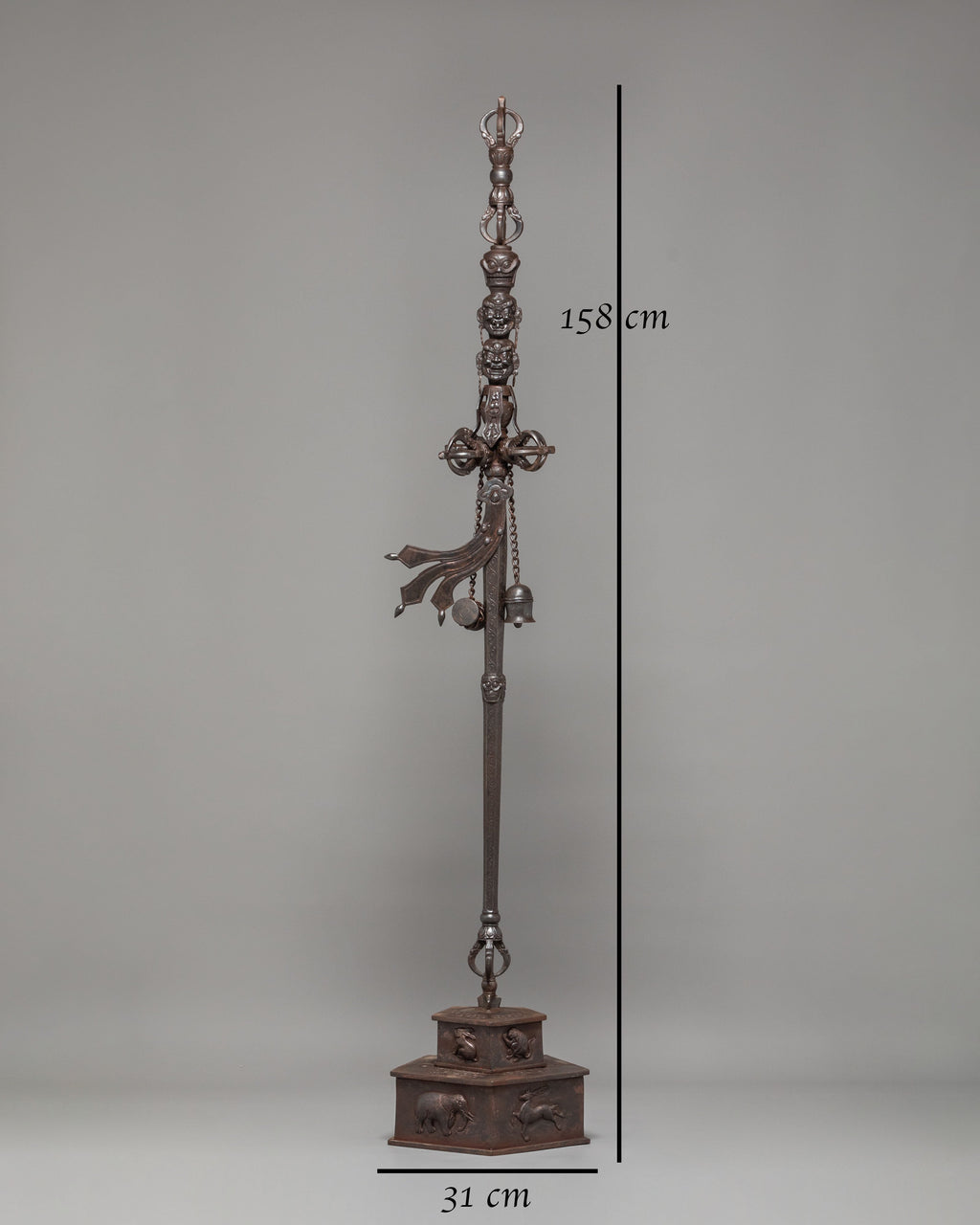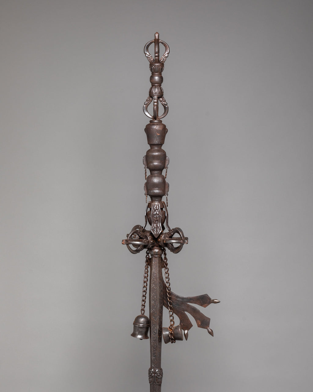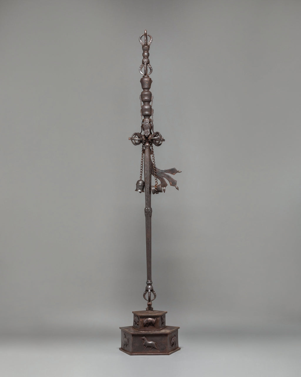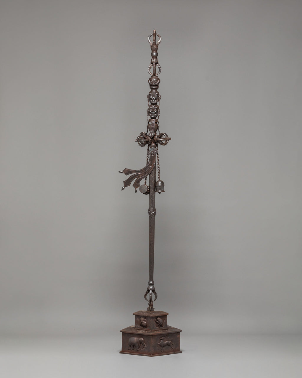 The Sacred Ritual Item Khatan is an impressive ceremonial staff traditionally used in Tibetan Buddhist practices. With a height of 158cm and a body crafted from oxidized copper, enhanced with silver-plated detailing, this piece carries a striking presence. The tall central shaft rises from a sculpted base adorned with symbolic animal figures, adding depth and cultural context to the overall form. Its design reflects elements often associated with spiritual rituals, processions, and protective symbolism within Buddhist traditions.