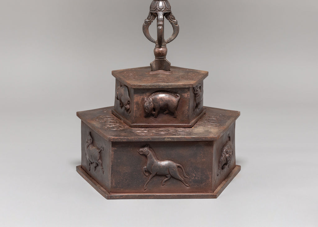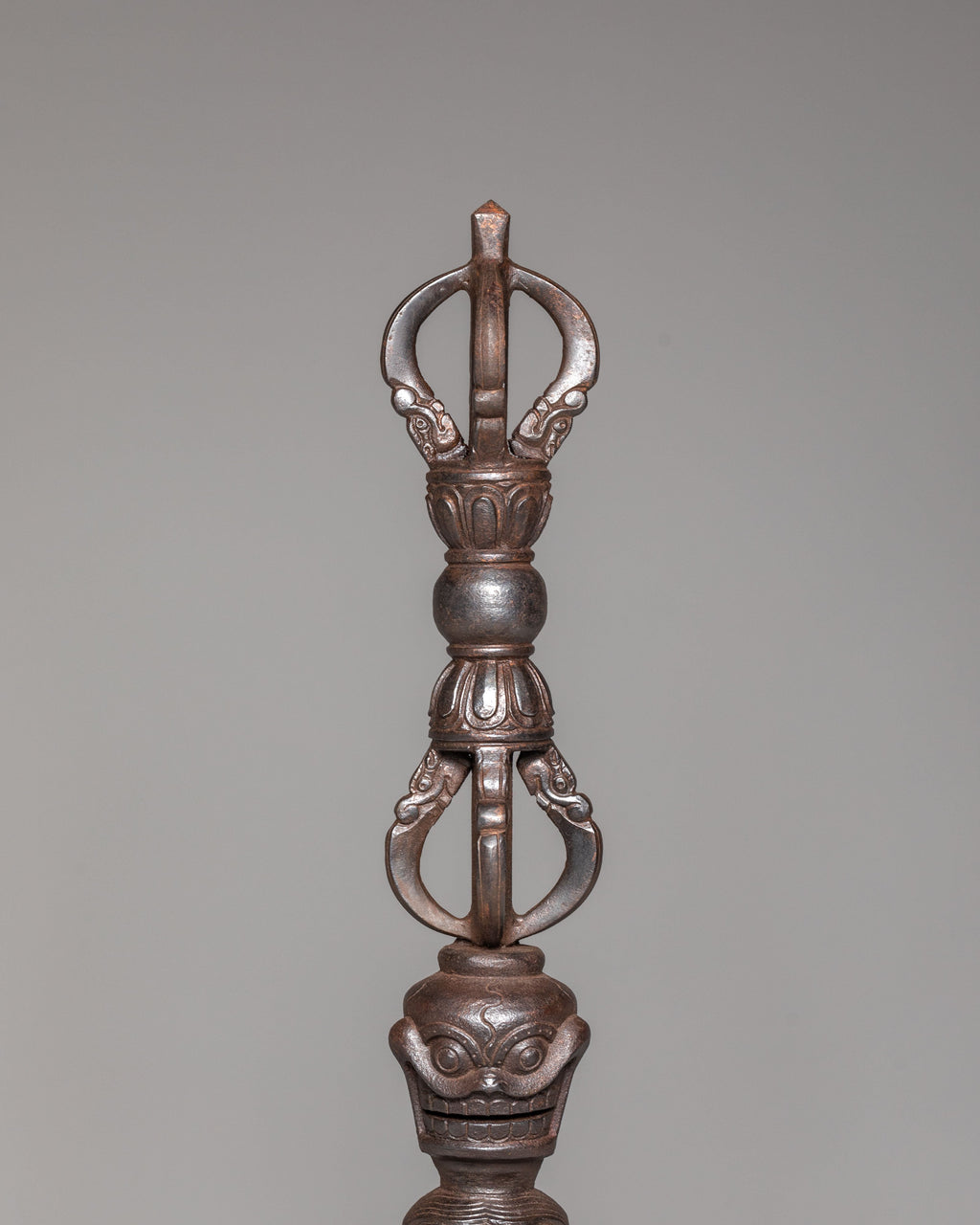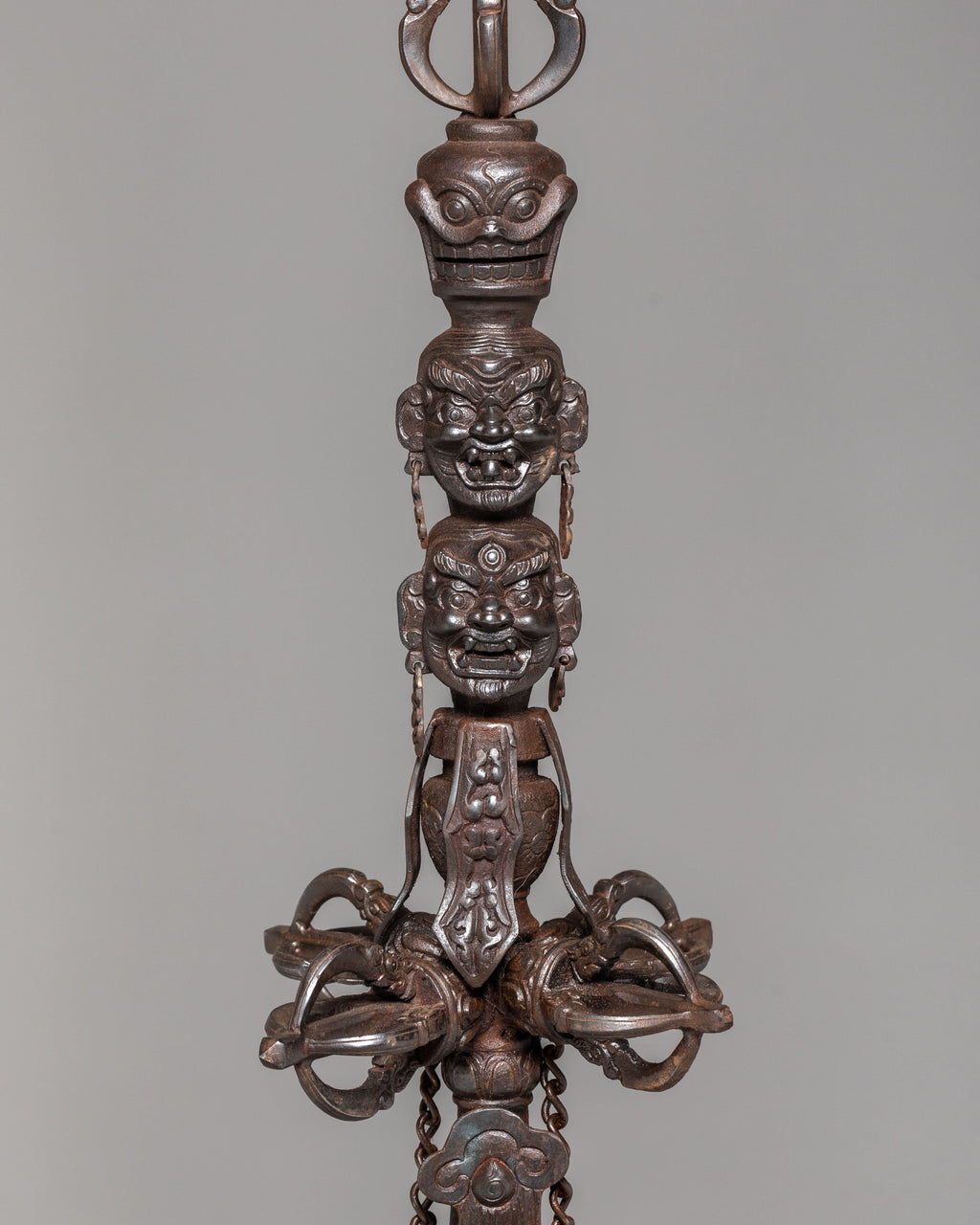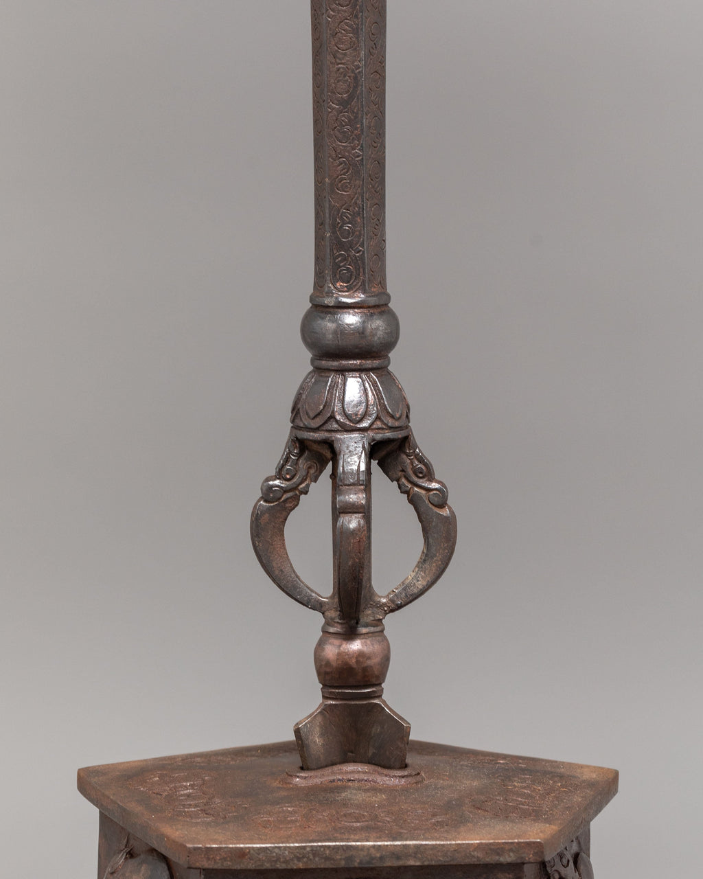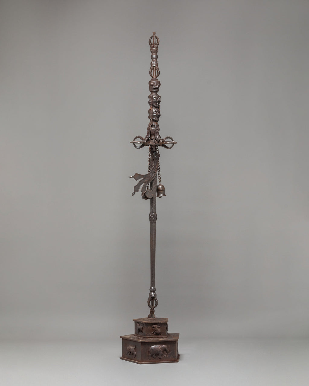 The Sacred Ritual Item Khatan is an impressive ceremonial staff traditionally used in Tibetan Buddhist practices. With a height of 158cm and a body crafted from oxidized copper, enhanced with silver-plated detailing, this piece carries a striking presence. The tall central shaft rises from a sculpted base adorned with symbolic animal figures, adding depth and cultural context to the overall form. Its design reflects elements often associated with spiritual rituals, processions, and protective symbolism within Buddhist traditions.