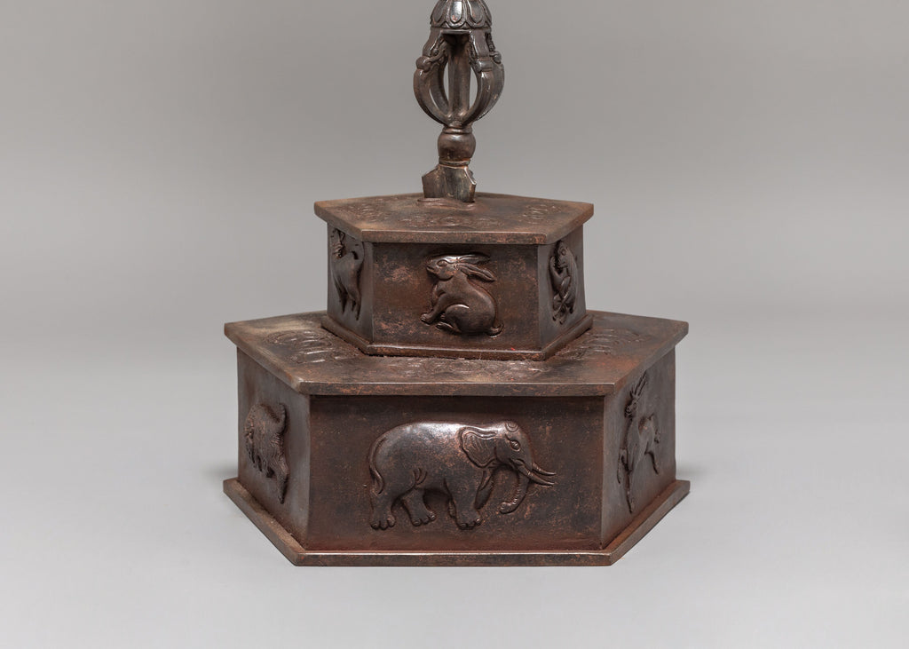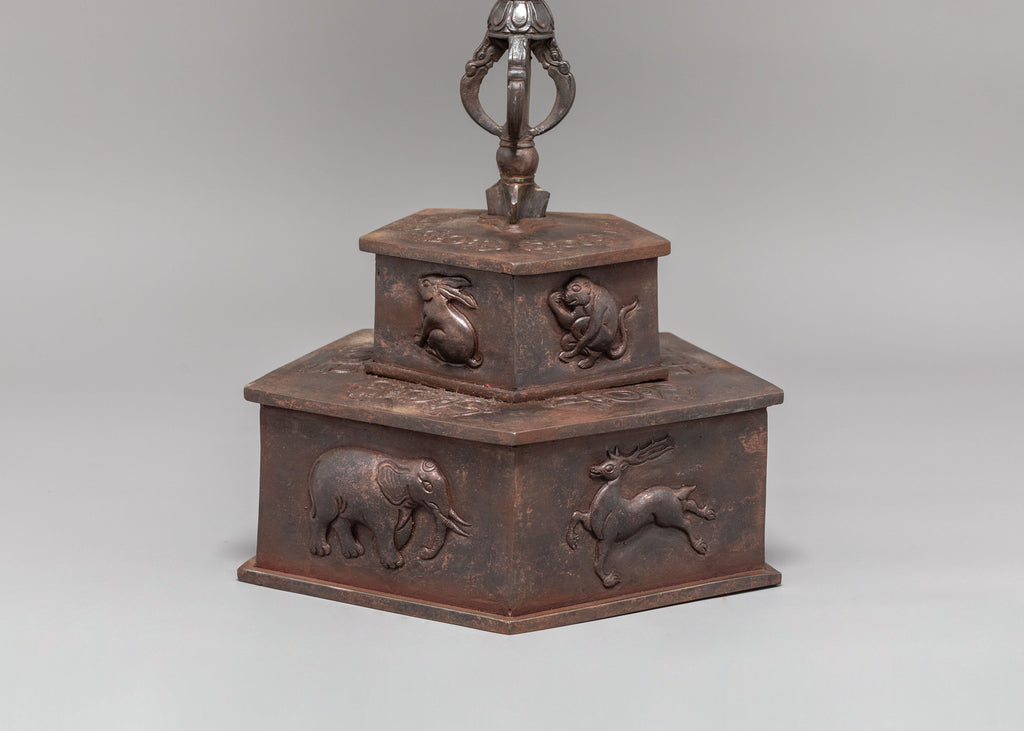 The upper section of the Khatan features layered motifs, expressive sculptural elements, and a refined arrangement of ritual shapes. Flowing metal ribbons, symbolic rings, and suspended ornaments add movement and visual interest. The oxidized copper finish provides an aged, ceremonial look that highlights the fine craftsmanship. The presence of traditional shapes and symbolic elements makes this Khatan a meaningful representation of Himalayan ritual artistry.