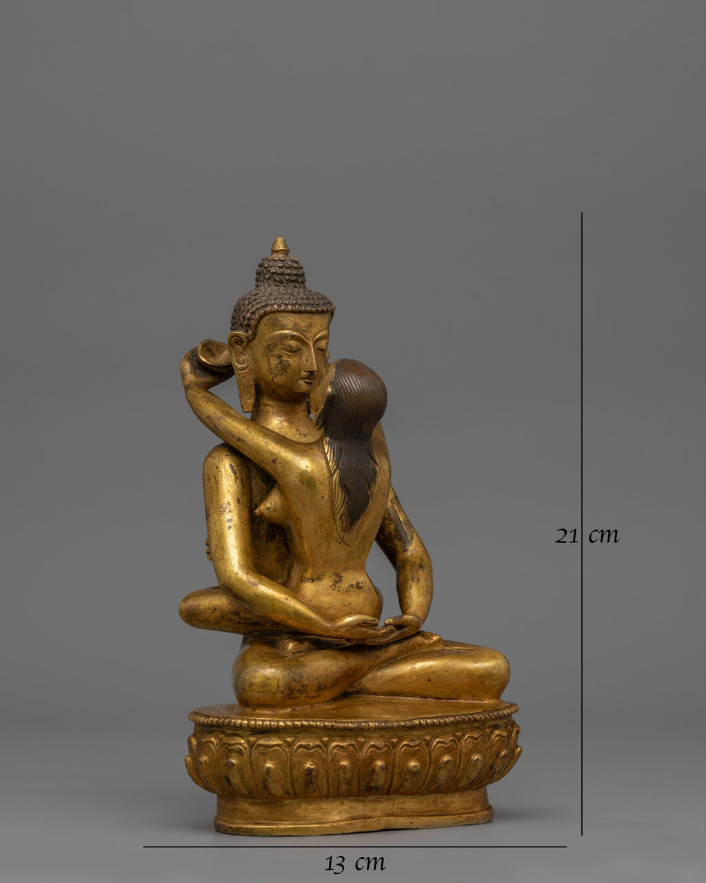 The Sacred Samantabhadra Statue with His Consort, known as the primordial Buddha and embodiment of ultimate unity and wisdom, represents the harmony of compassion and wisdom. This finely handcrafted statue is 8.3" (Height) x 5.1" (Base) and weighs 1.85 kg. It is made of copper and adorned with 24k gold gilded. This sacred sculpture, created by talented Nepalese artisans, represents the craftsmanship of Himalayan Buddhism, making it an important addition to altars, meditation places, and sacred collections.