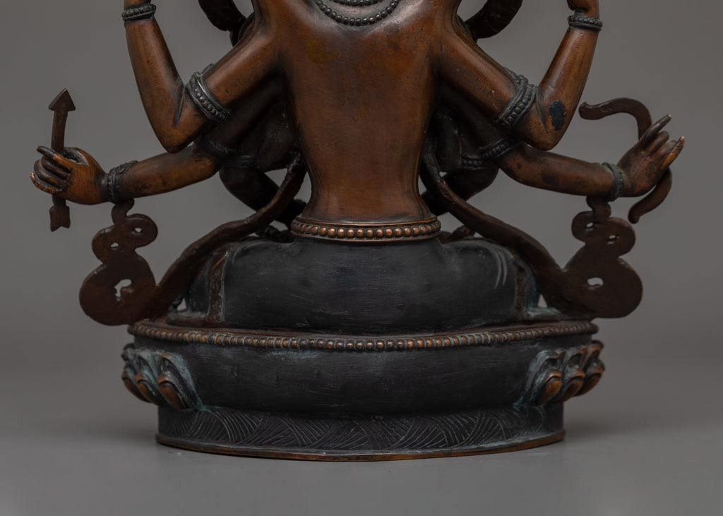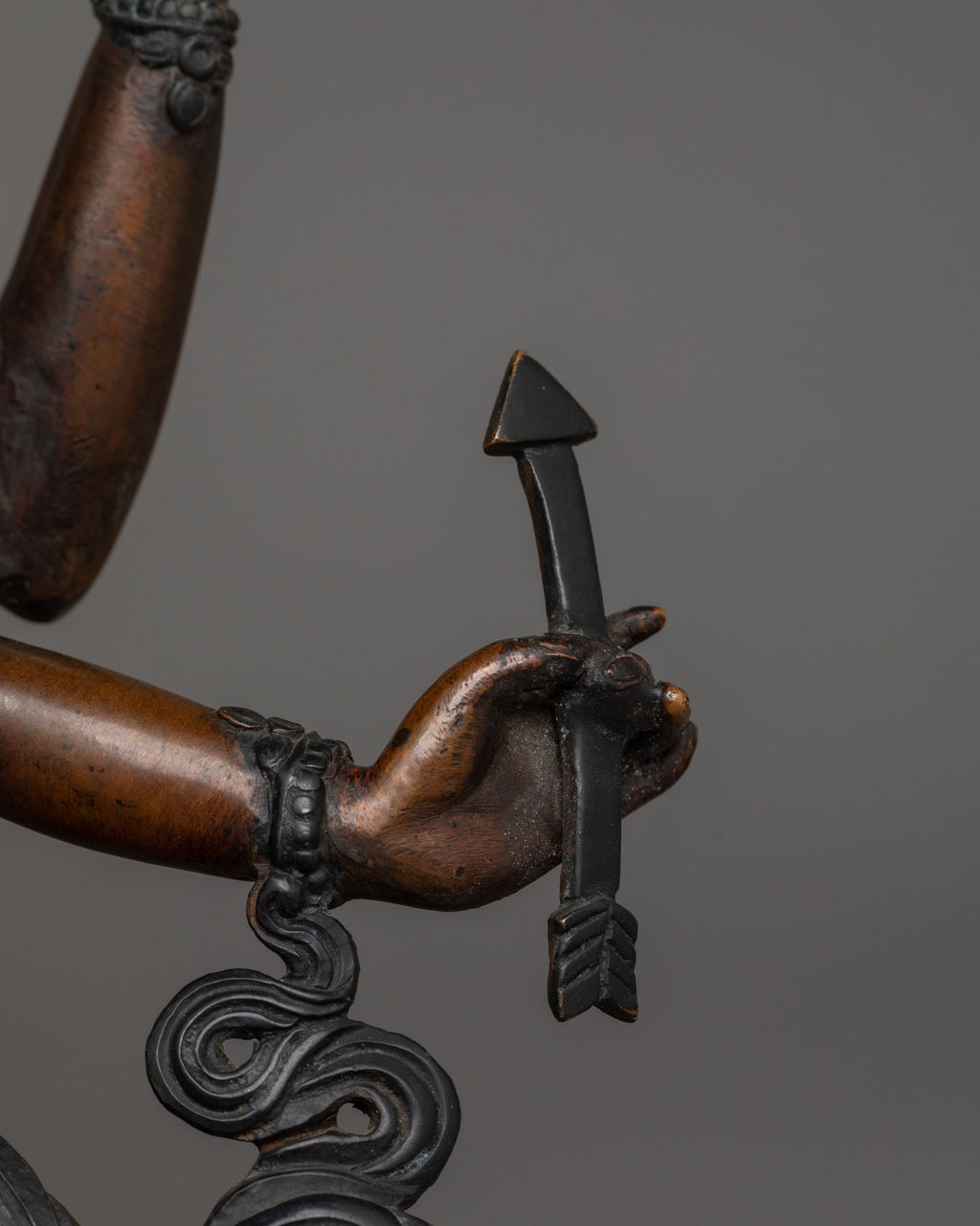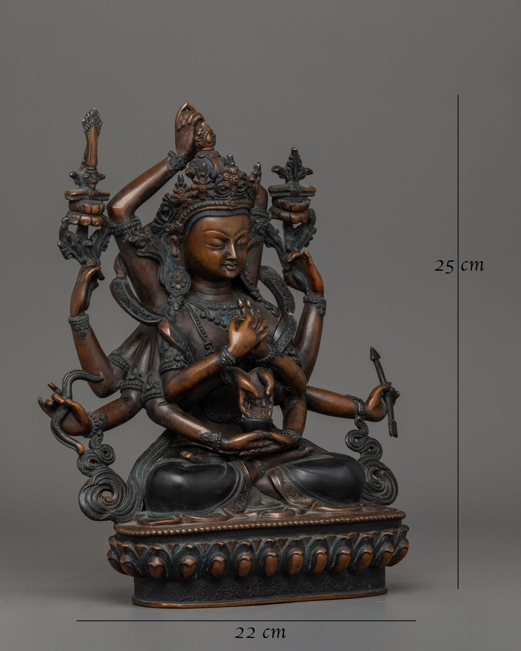 The Sacred Sculpture of Namasangati embodies the essence of purification and protection, making it a powerful representation for spiritual practice and reflection. This Statue stands at a height of 9.8 inches (25 cm) with a base measuring 8.7 inches (22 cm), making it a balanced and meaningful piece for meditation spaces or altars. Weighing 3.230 kg. The body is made of oxidized copper, providing both durability and an antique look, while the intricate acrylic paintings enhance the detailed design.