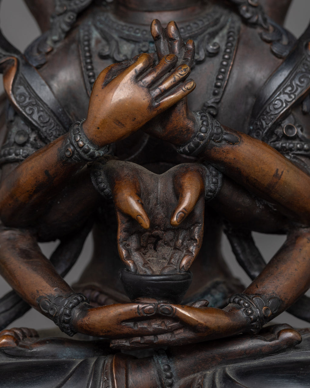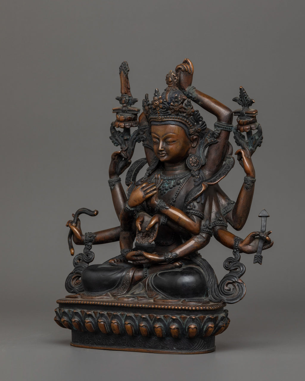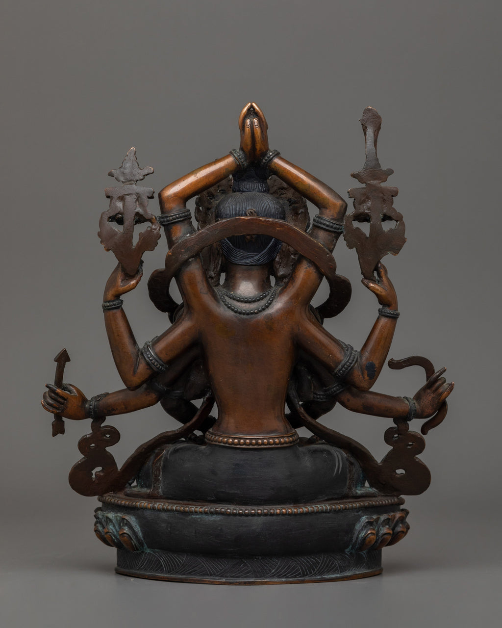 The Sacred Sculpture of Namasangati embodies the essence of purification and protection, making it a powerful representation for spiritual practice and reflection. This Statue stands at a height of 9.8 inches (25 cm) with a base measuring 8.7 inches (22 cm), making it a balanced and meaningful piece for meditation spaces or altars. Weighing 3.230 kg. The body is made of oxidized copper, providing both durability and an antique look, while the intricate acrylic paintings enhance the detailed design.