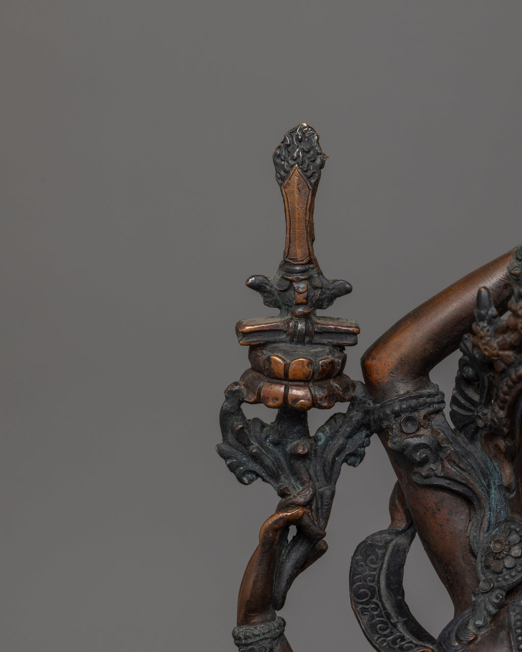 Namasangati is seen with the lotus that holds the Prajnaparamita sutra, representing the complete comprehension of emptiness and brandishing the sword of wisdom that slashes through illusion. The meticulous detailing, from the intricate patterns of his attire to the dynamic posture, reflects the depth of Namasangati teachings and his role as a guide for practitioners seeking to deepen their understanding of Dharma.