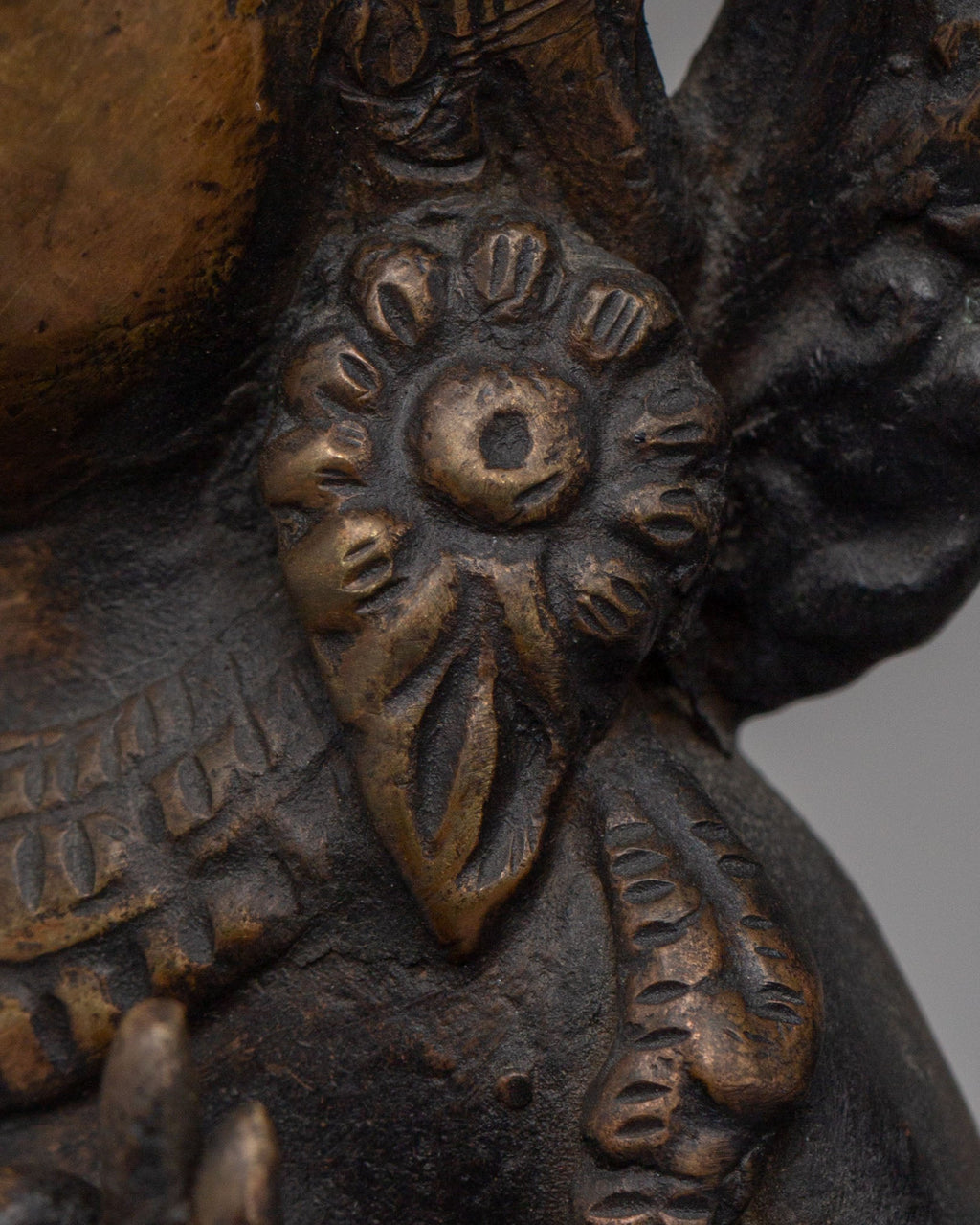 This Green Tara statue depicts the goddess seated gracefully, symbolizing readiness to respond to the needs of all beings. Her right hand extends in a gesture of blessing and generosity, while her left hand holds the sacred lotus, representing purity and spiritual awakening. The oxidized copper finish enhances the intricate detailing of her crown, ornaments, and flowing robes, reflecting authentic Himalayan craftsmanship and devotional artistry.