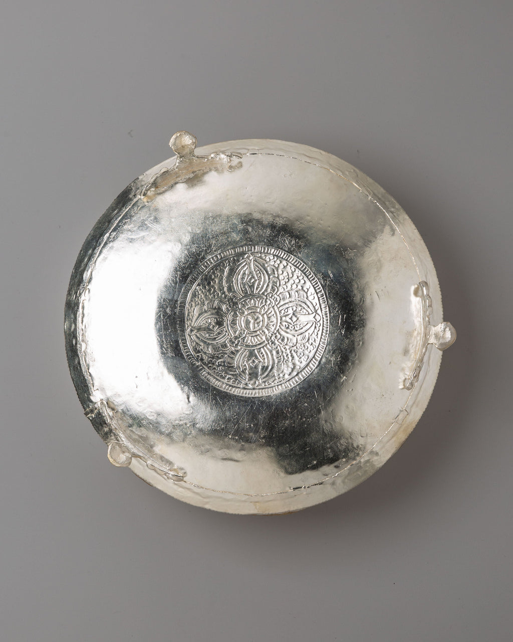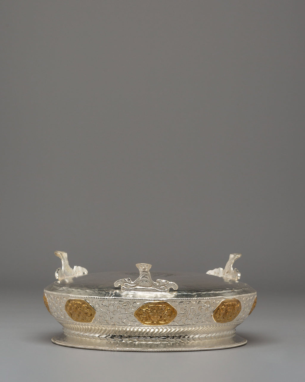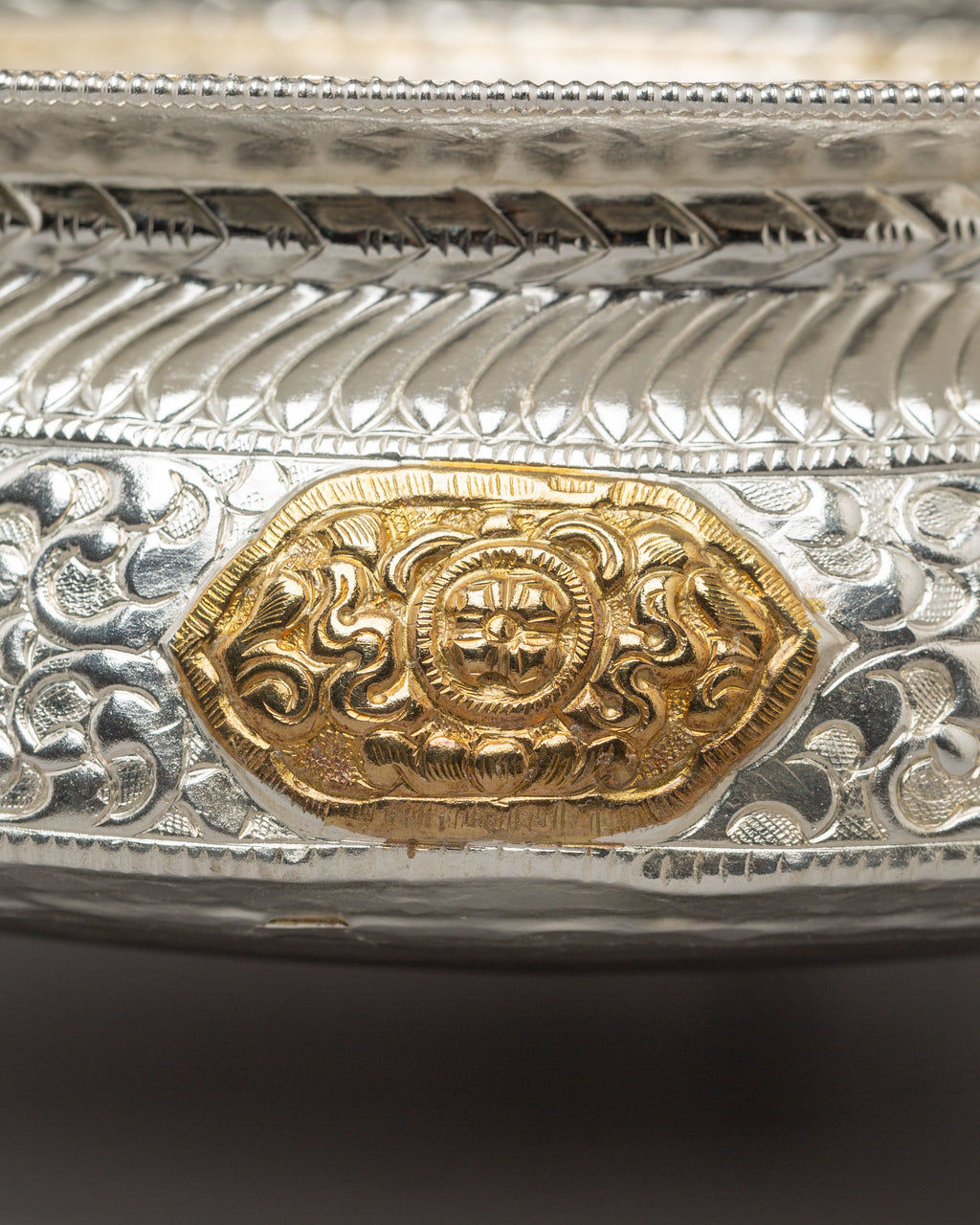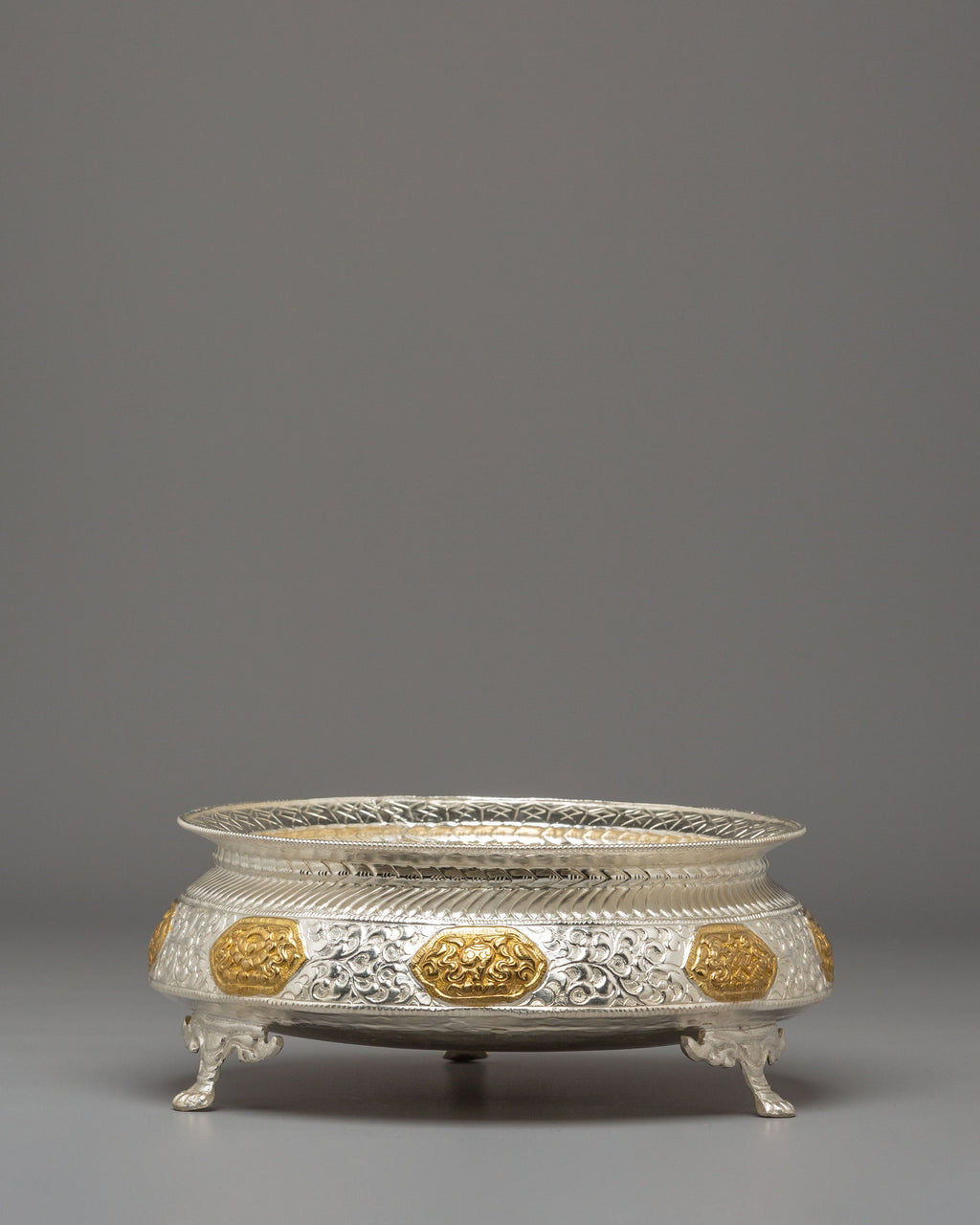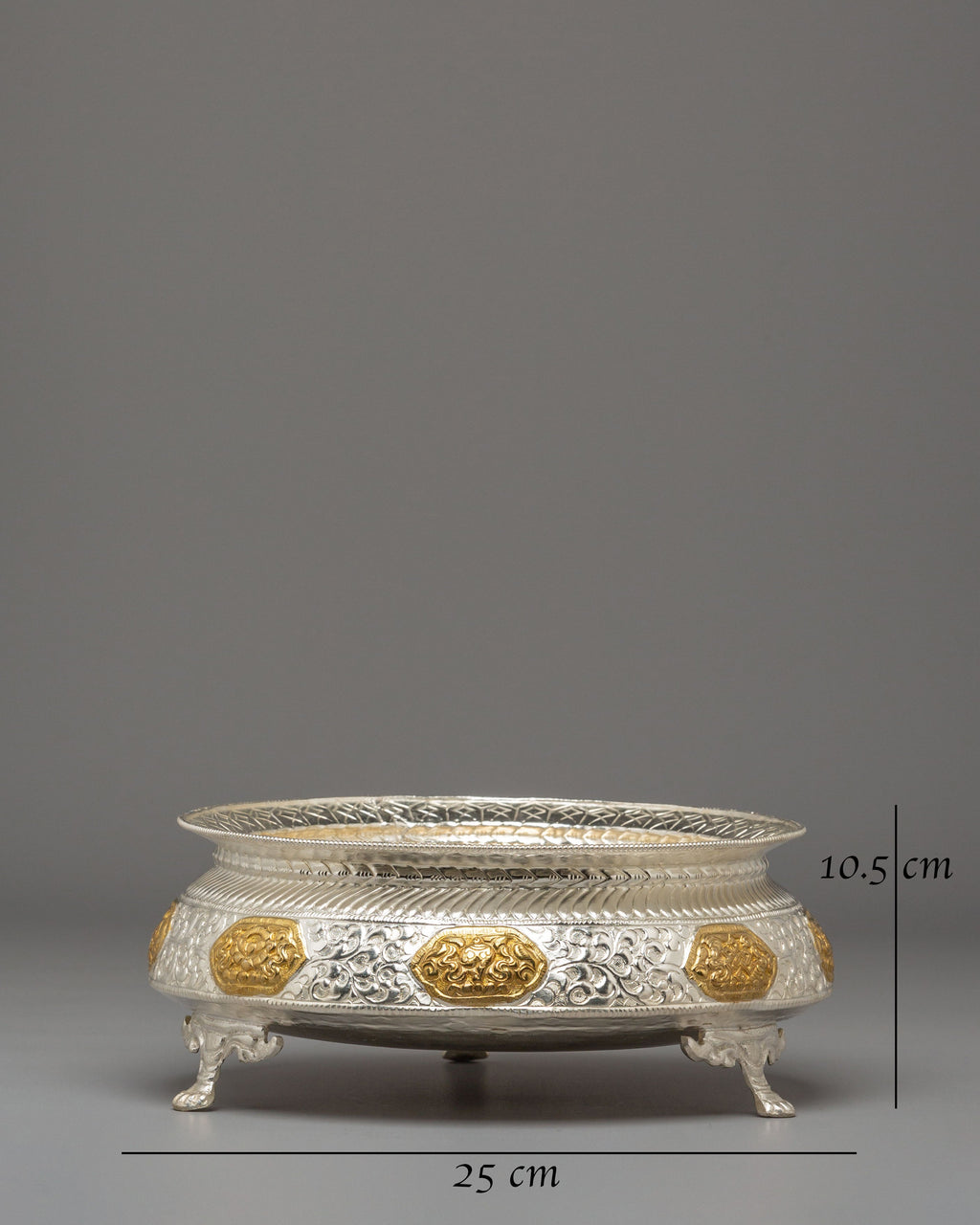 The decorative motifs found on this Khadkulo draw from classical Nepali tradition, representing prosperity, purity, and sacred energy. Each gold-accented panel is shaped to evoke mythological themes often associated with protection and auspiciousness. The contrast between the silver-plated surface and golden motifs enhances its visual appeal, making it an exceptional item for altars, cultural spaces, or curated home décor collections. The craftsmanship honors long-established techniques, giving the bowl a distinctive character rooted in traditional ceremonial art.