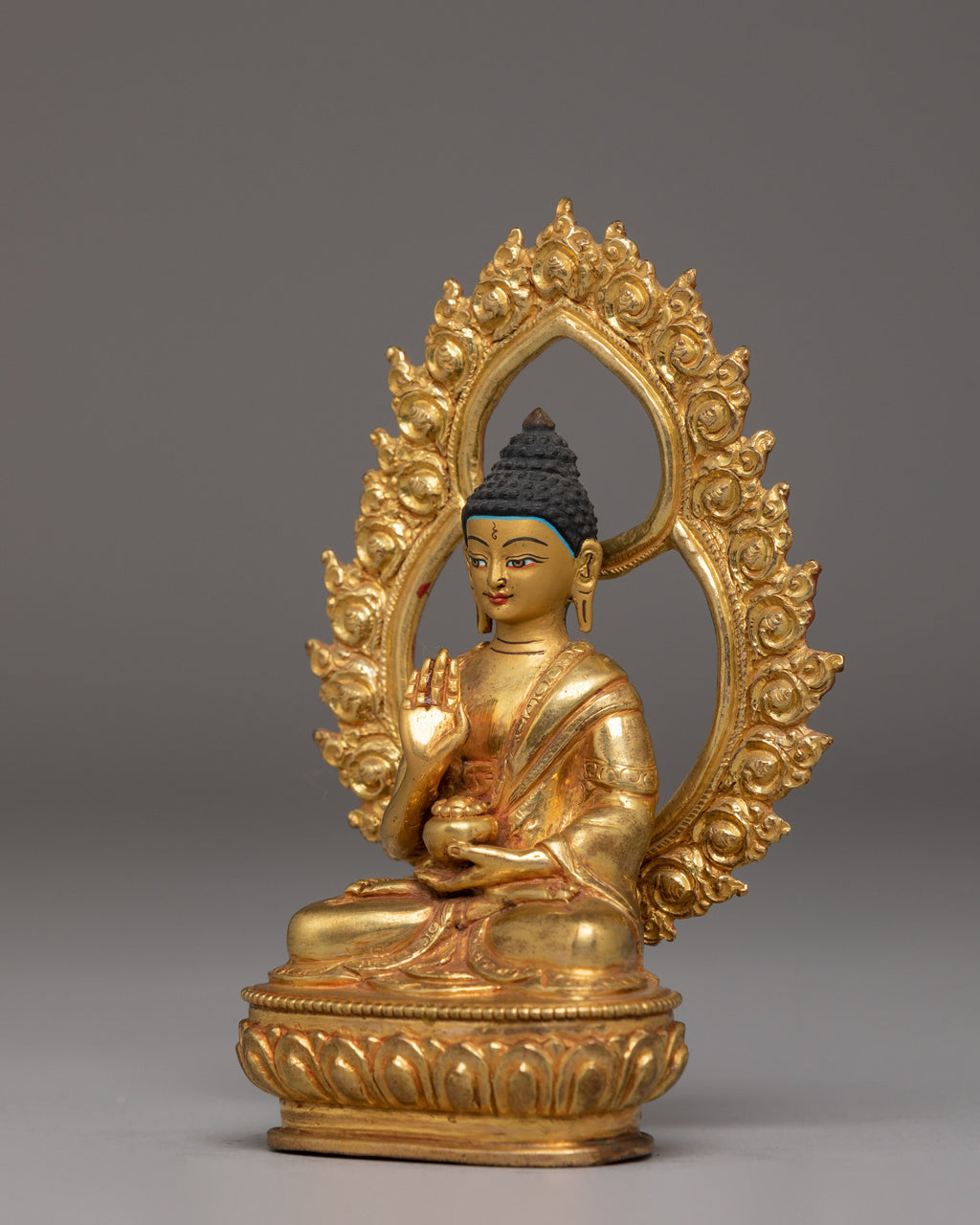 The Buddha is depicted seated in a poised meditative posture, with the right hand raised in the abhaya mudra—an ancient gesture symbolizing fearlessness, courage, and protection. The calm expression, finely detailed robes, and smooth contours reflect careful artisan workmanship. The decorative halo behind the Buddha is enriched with floral and flame motifs that represent clarity, transformation, and spiritual radiance. The gold-plated finish adds warmth and a gentle glow to the sculpture.