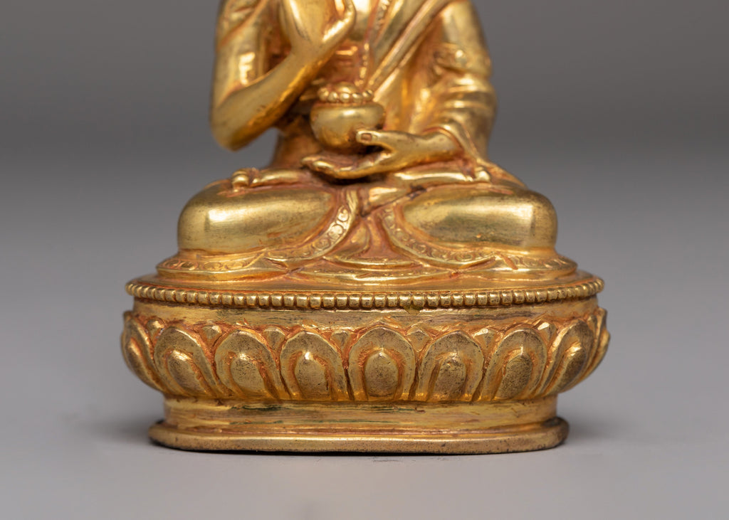 This Statue of Amoghasiddhi Buddha is crafted from a copper body with elegant gold plating, measuring 12.5cm in height and 8.5cm in width, and weighing 0.33kg. Small yet visually striking, it embodies the peaceful strength associated with Amoghasiddhi, the Buddha of Accomplished Action. This piece is ideal for enhancing meditation rooms, altar arrangements, or meaningful display spaces that celebrate Buddhist symbolism and Himalayan craftsmanship.