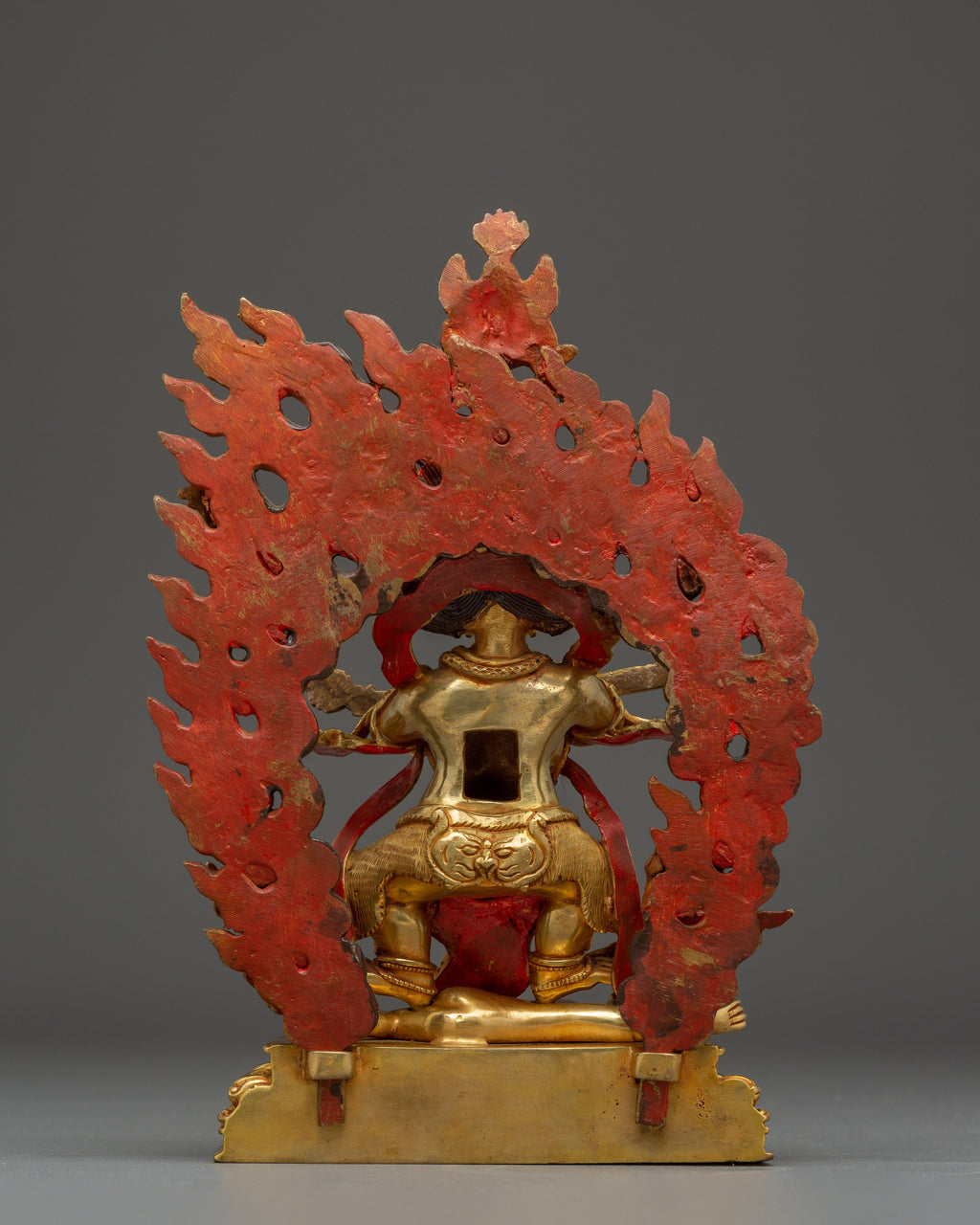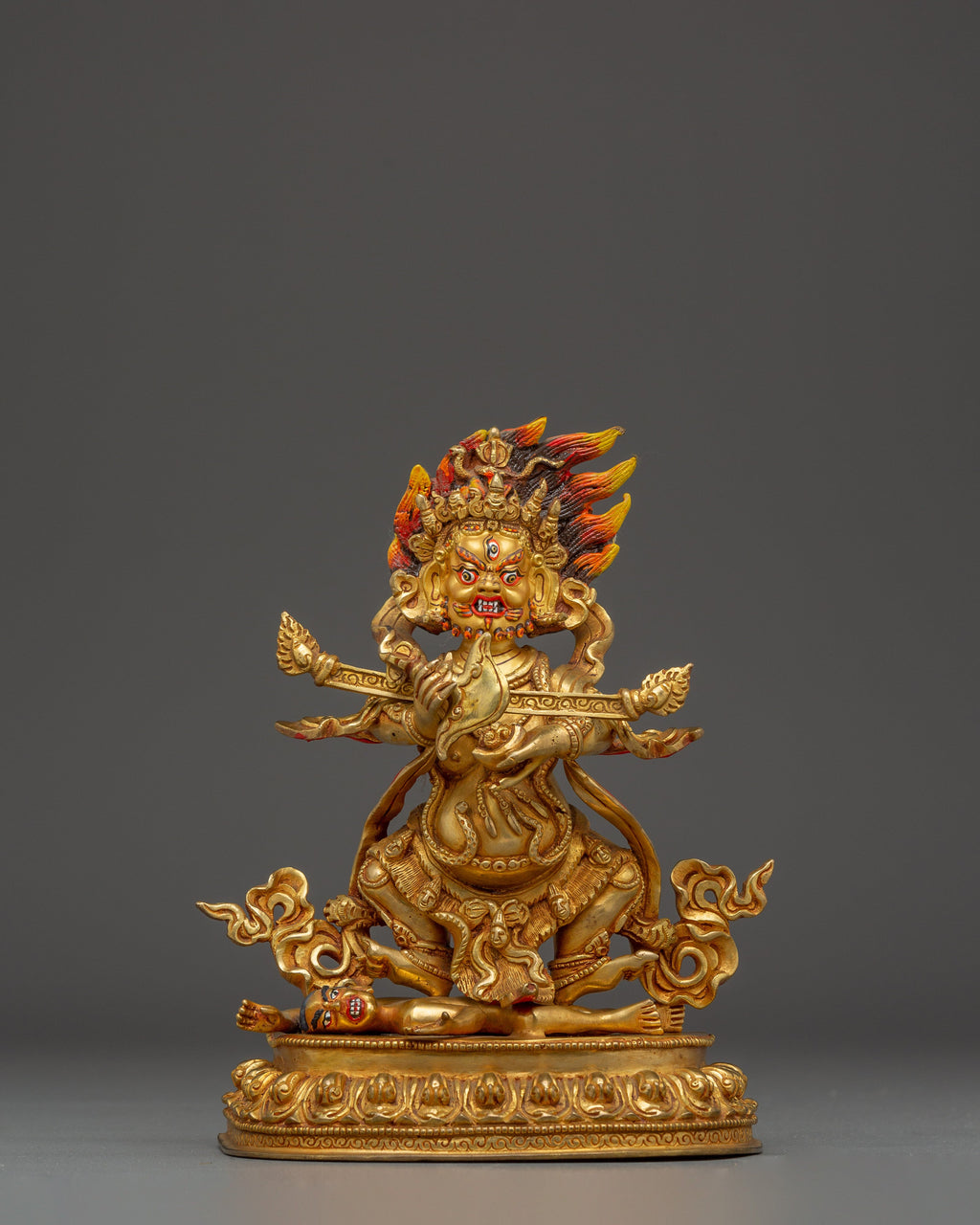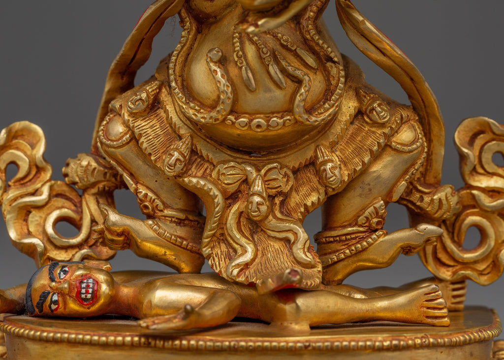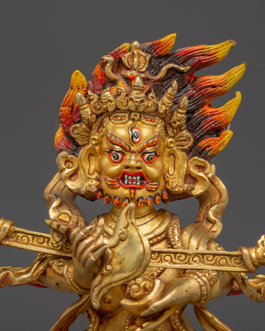 With intricate details, the statue showcases multiple eyes and hands, each holding specific meanings, and the crown of skulls, a symbol of triumph over opposing forces. This Mahakala statue is a true masterpiece of Tibetan Buddhist art, blending exquisite craftsmanship with profound spiritual significance. Whether you're a devotee of Buddhist art or looking to enrich your meditation space, this sculpture embodies strength, protection, and spiritual focus. Its striking design and rich symbolism make it an essential addition to any collection or sacred space.