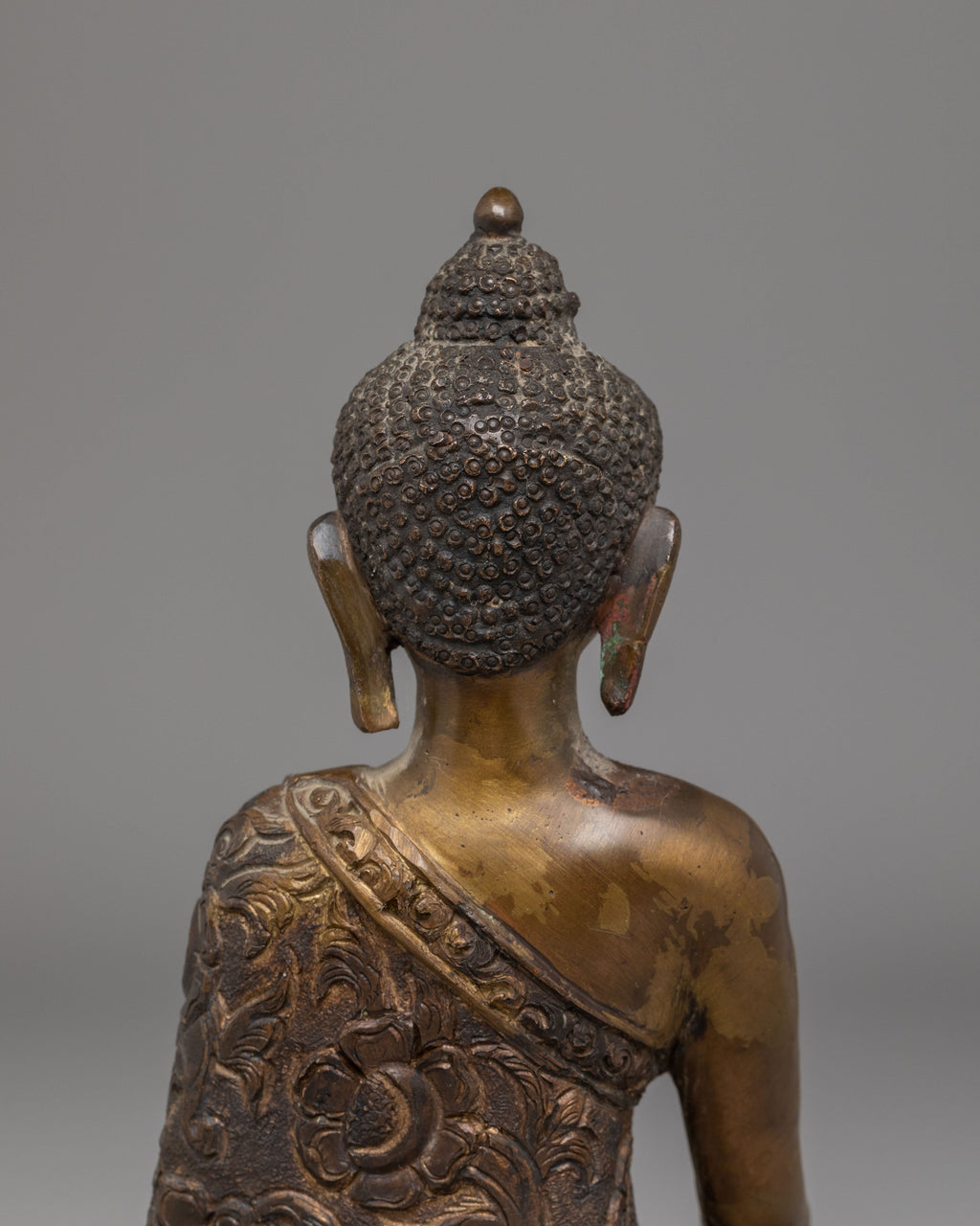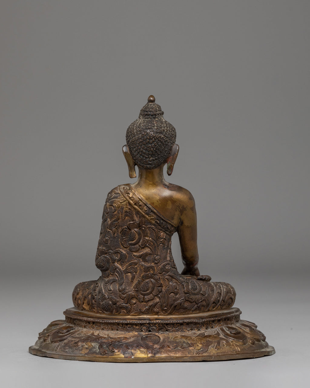 Shakyamuni Buddha is depicted in the padmasana (lotus) posture on a lotus base, wearing traditional robes. His right hand is in bhumisparsha mudra, symbolizing enlightenment, while his left hand holds an alms bowl, representing generosity and spiritual discipline. The ushnisha atop his head signifies wisdom and spiritual awakening, completing this classic and inspiring representation.