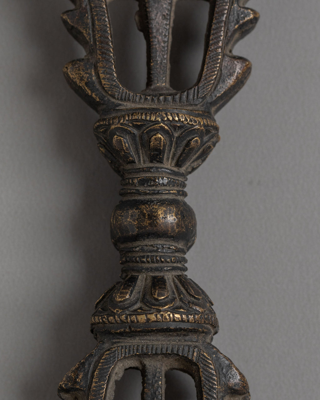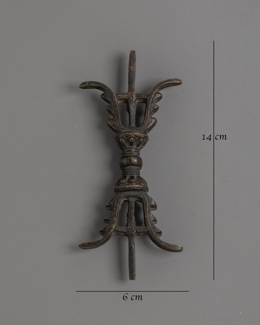 Symbolizing the indestructible power of enlightenment, this brass vajra serves as an essential ritual tool in tantric meditation, often paired with the bell to express the union of method and wisdom. Its compact, well-balanced form and darkened finish highlight the authenticity of traditional Himalayan metalwork. Perfect for personal altars, ceremonies, or collections, this handcrafted vajra carries the sacred energy of centuries-old spiritual tradition and the artistry of Tibetan metalcraft.