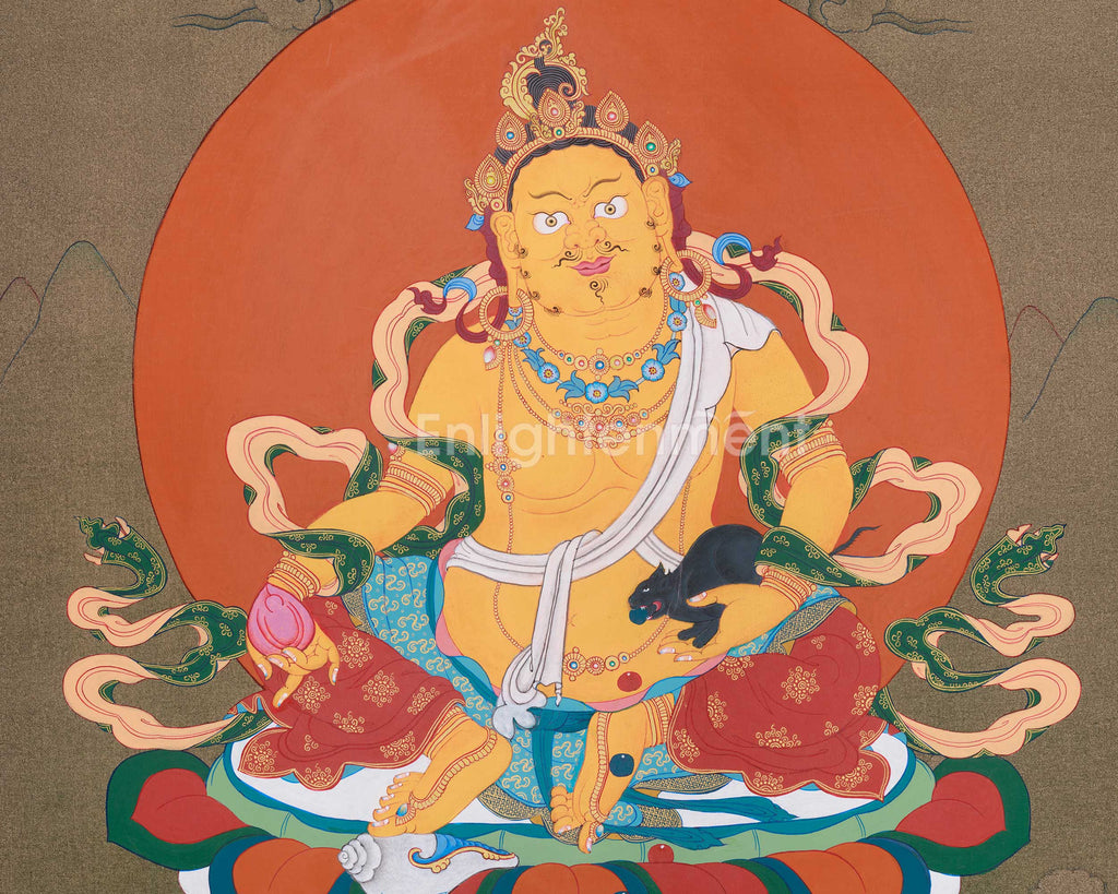 Buddhist art often depicts Dzambhala in a majestic pose, emphasizing his mastery over wealth and possessions. His yellow skin indicates abundance, while his clothing signifies prosperity. He wears a five-jeweled crown, holds a mongoose spitting jewels, and a citron fruit. These symbols symbolize his spiritual and worldly wealth, his ability to fulfill wishes, and his enlightened condition. Additional objects, such as a conch shell, a vase, and a utpala garland, highlight his offerings. The thangka radiates wealth and divine generosity, inspiring viewers to seek Dzambhala's blessings for prosperity.