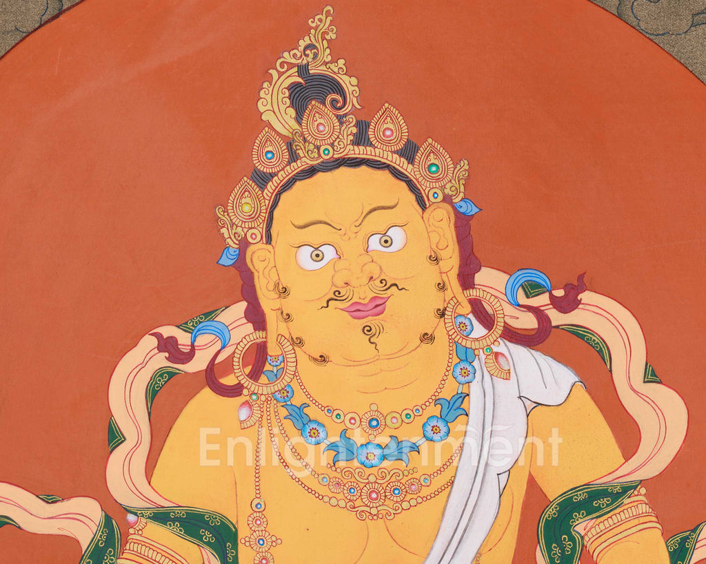 A sacred thangka of Dzambhala, the Buddha of wealth, is an important Tibetan Buddhist artwork that symbolizes abundance, generosity, and protection. Created by hand in the traditional Karma Gadri style, it displays detailed craftsmanship and lively colors. Made on cotton canvas, it provides a durable, textured surface that boosts its visual appeal. The artist highlights key features with 24K gold, giving a radiant glow that deepens its spiritual meaning. Bright acrylic colors vividly capture Dzambhala's expressions and prosperity symbols with clarity.