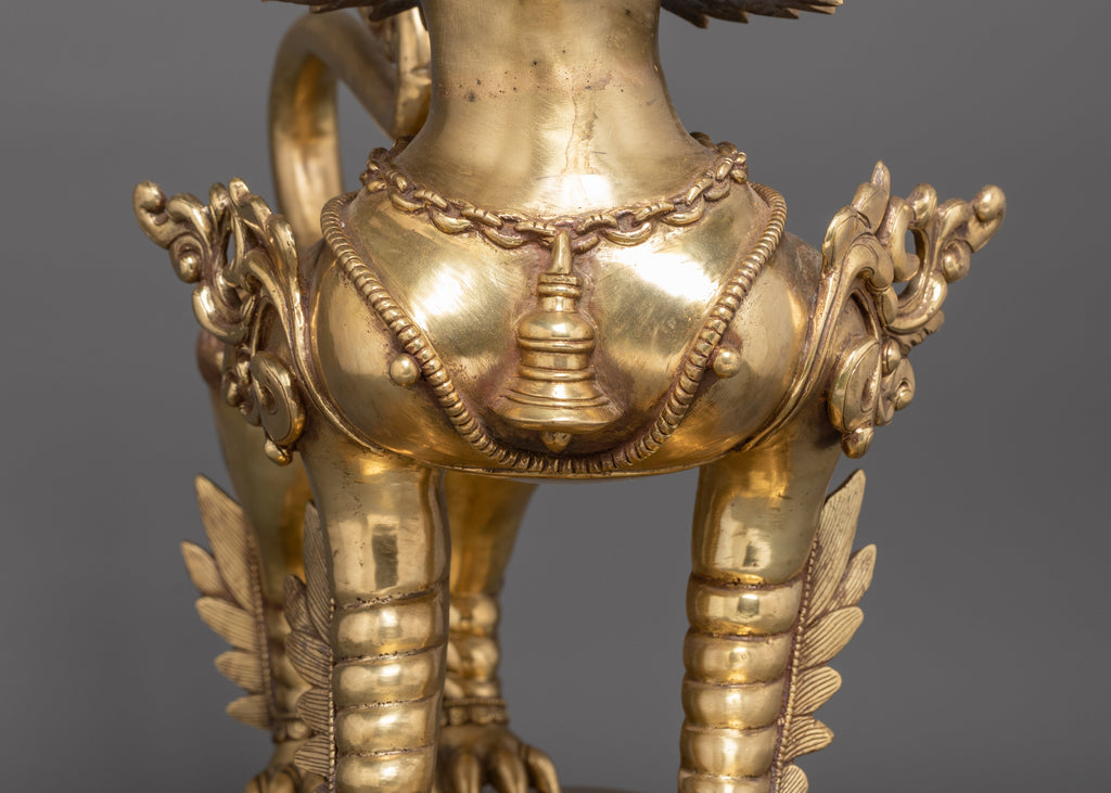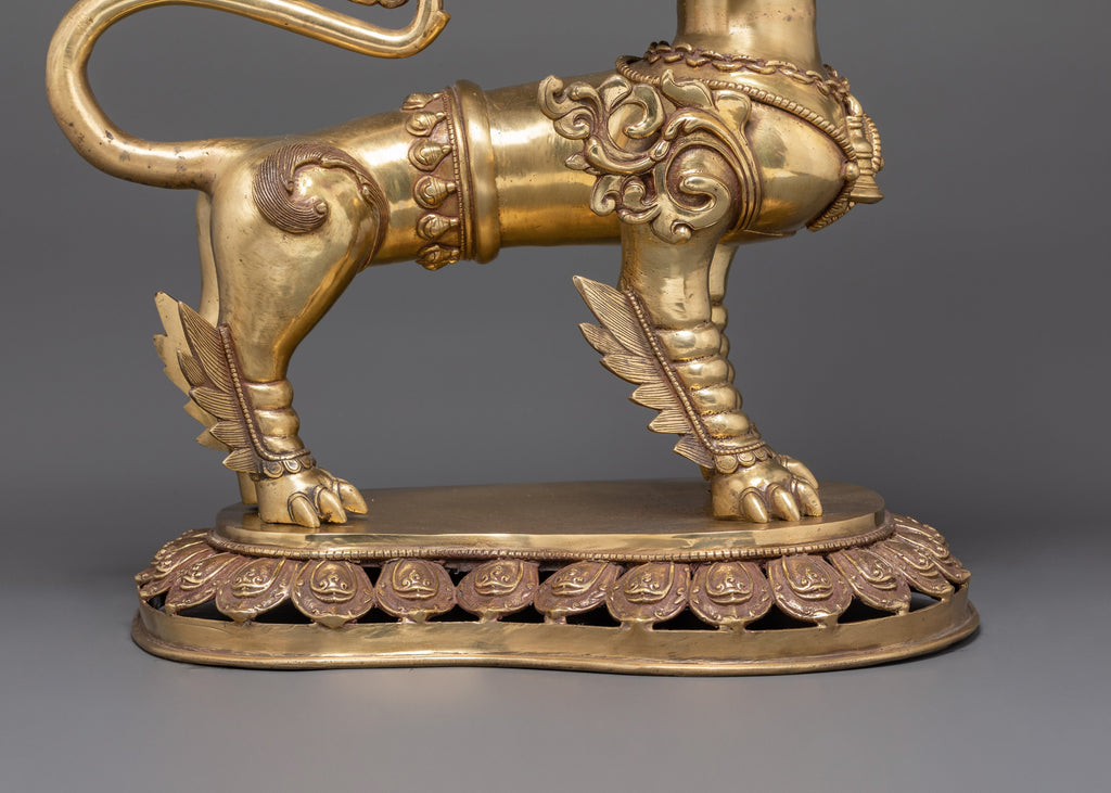 The intricate design showcases exquisite Tibetan artistic mastery with elaborate scrollwork adorning each lion's muscular body, while fierce protective expressions demonstrate their role as spiritual sentinels. The ornate manes feature traditional cloud motifs representing the celestial realm, while the detailed lotus petal bases symbolize purity and enlightenment. Each Buddhist protector lion displays characteristic fangs and bulging eyes that convey their wrathful compassion, a fundamental concept in Tibetan Buddhism where fierce appearance masks benevolent protection. The brass construction creates a lustrous golden finish that enhances the lions' divine presence. At the same time, traditional decorative elements, including jeweled harnesses and ceremonial regalia, reflect their status as celestial guardians in Buddhist cosmology.
