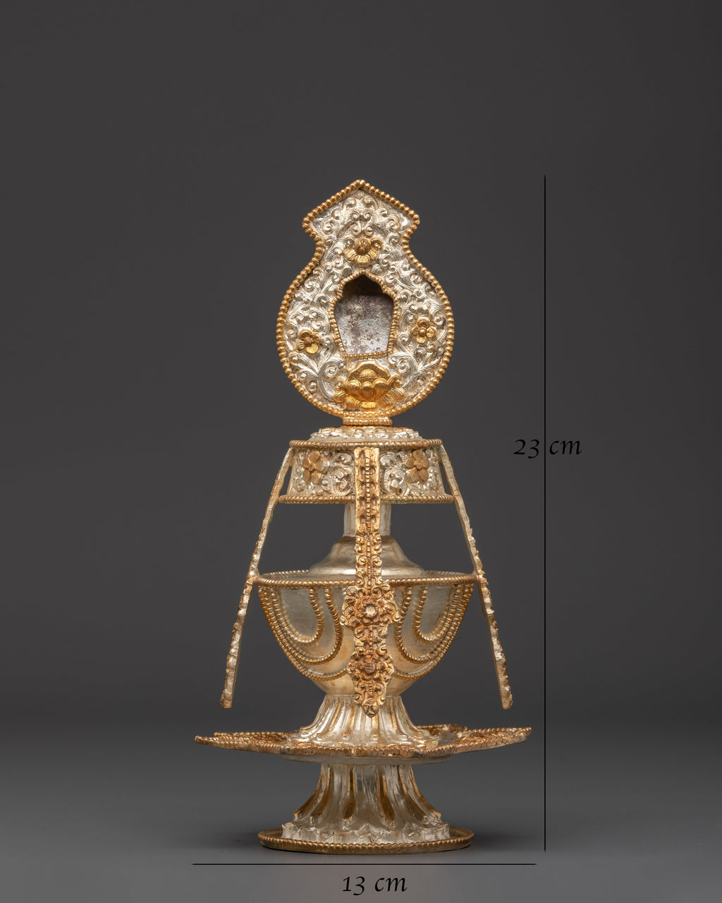 Exquisitely crafted from a blend of copper, silver plating, and radiant gold accents, this Tibetan Buddhist life vase exemplifies a harmonious fusion of sacred artistry and materials. The silver-plated surface symbolizes spiritual purity, while the gold detailing signifies divine blessings and enlightenment. With a height of 23 cm and a width of 13 cm, this sacred vessel embodies both presence and purpose, making it suitable for rituals and ceremonial displays. Weighing only 0.49 kg, it achieves a balance between durability and elegance, rendering it ideal for use on sacred altars, in spiritual offerings, or within personal sanctuaries.
