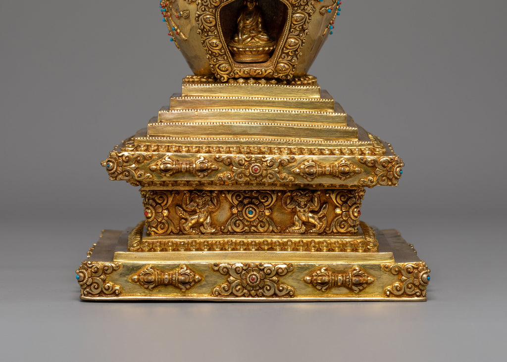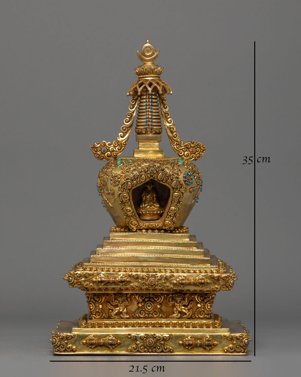 Weighing 5.19kg, this stupa is a meaningful addition to meditation rooms, altars, or as a thoughtful spiritual gift. Whether you wish to deepen your practice or add a touch of Buddhist artistry to your space, this Sacred Spiritual Stupa is a profound and decorative piece. The blend of copper, gold, and precious stones brings an air of peace and tranquility, creating a sacred ambiance in any Space.