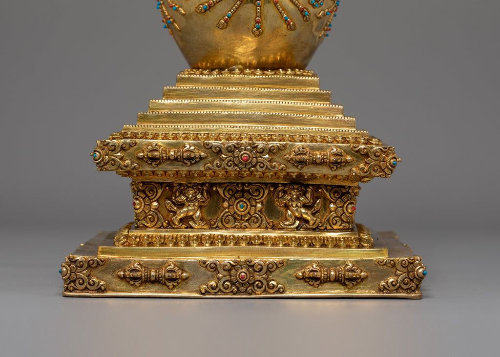 This Sacred Spiritual Buddhist Stupa beautifully embodies the essence of Buddhist teachings and the path to enlightenment. Crafted from copper and gold-plated, this stupa radiates a warm, divine glow. It is adorned with artificial coral and turquoise stones, both of which hold significant meaning in Tibetan Buddhism. These stones are believed to bring healing, protection, and wisdom, making them ideal symbols to complement the stupa's more profound spiritual significance. The intricate motifs reflect Buddhist ideals of peace, compassion, and spiritual growth, making this stupa a cherished centerpiece for any sacred space.