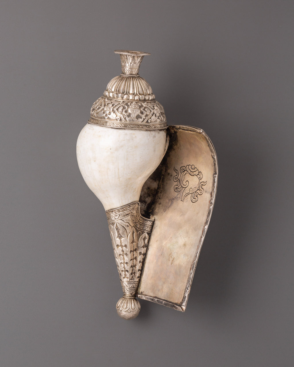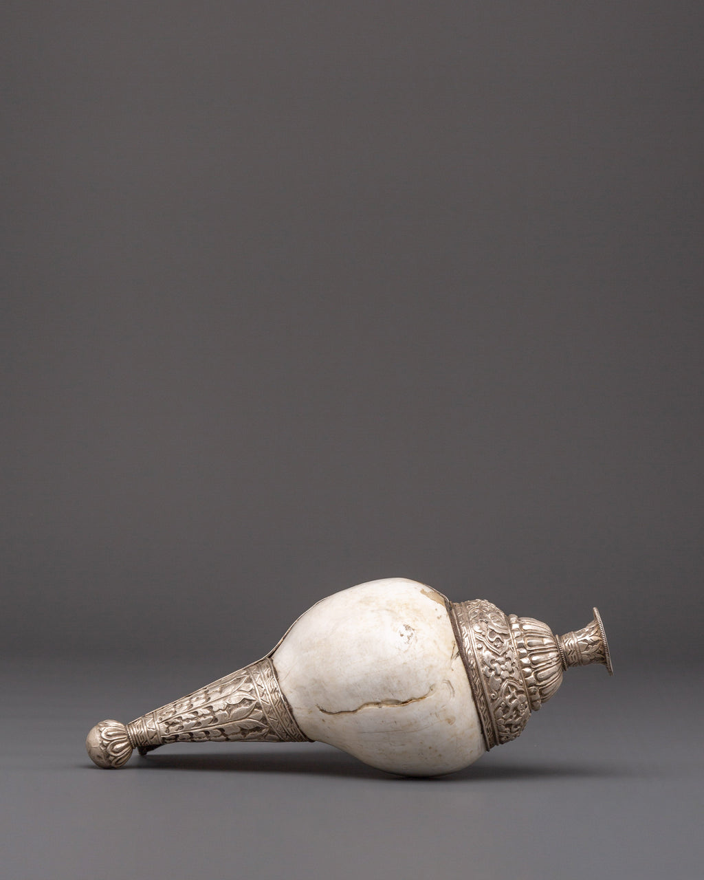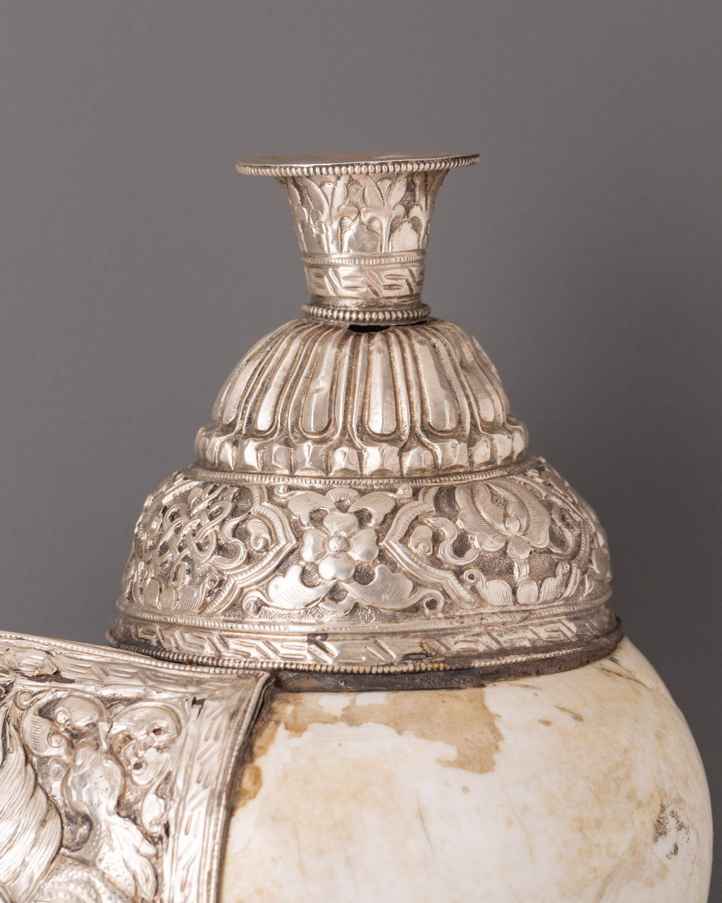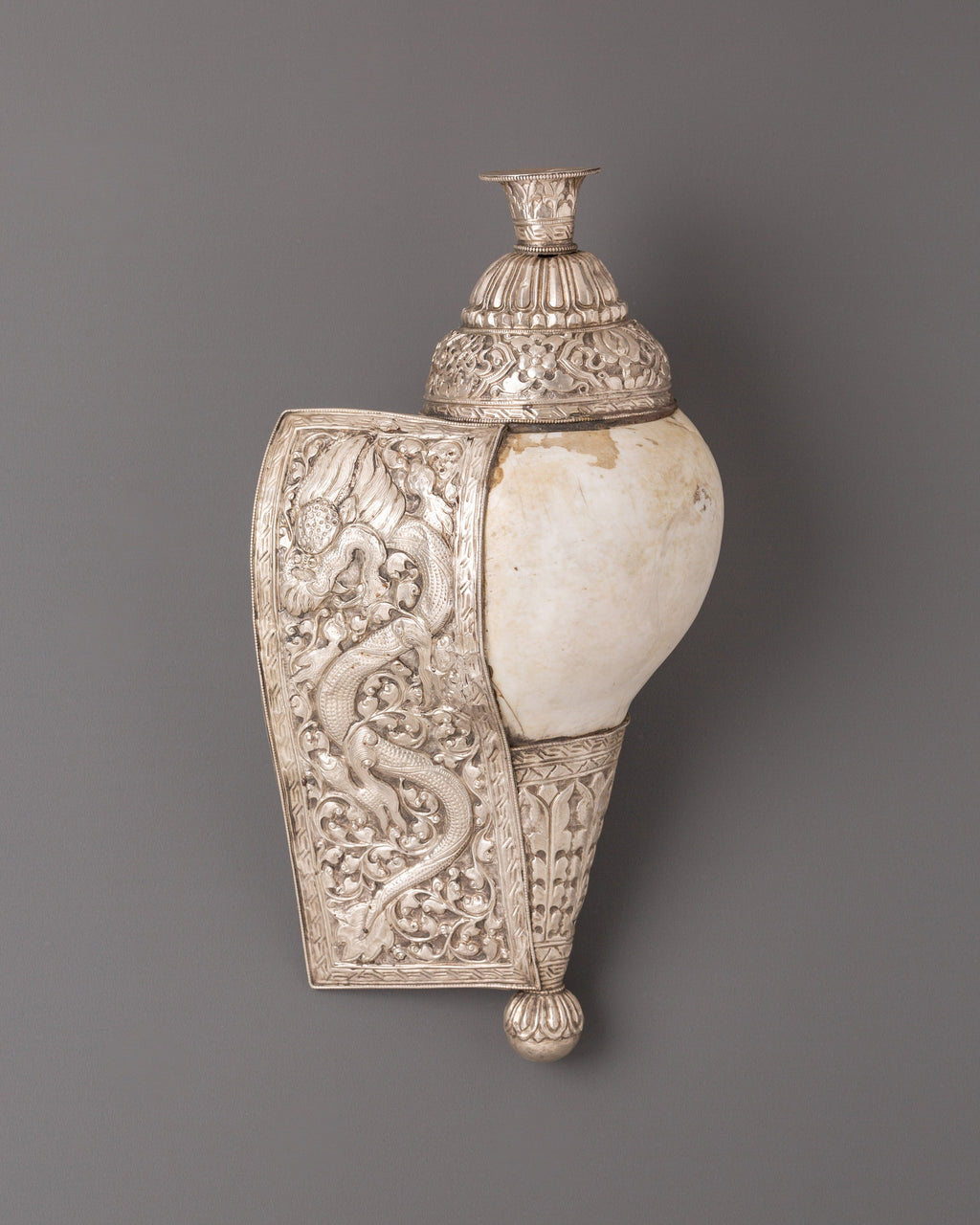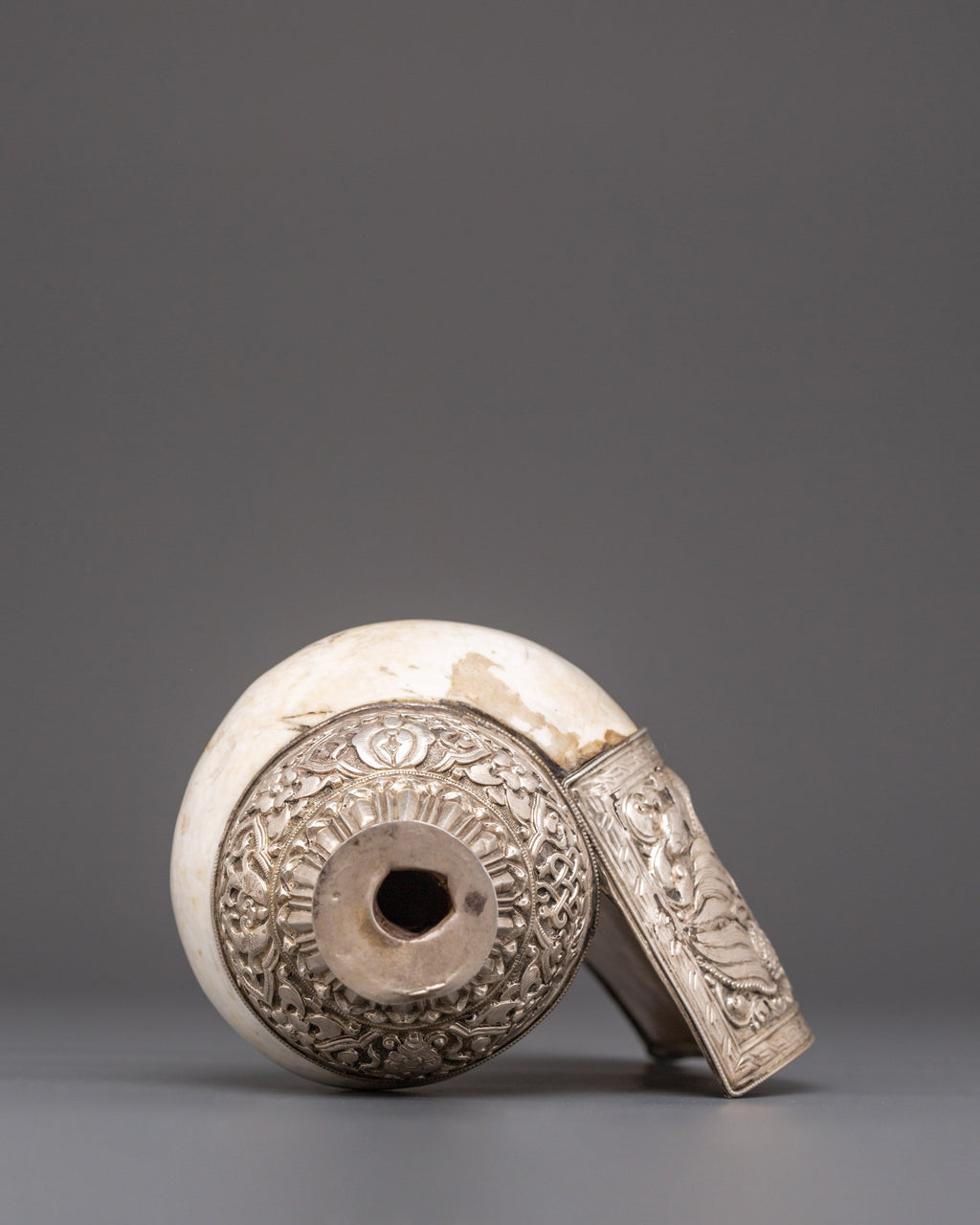 This Tibetan conch shell highlights the natural spirals and textures of the shell, which are traditionally associated with the flow of sacred energy. Its polished surface combined with white metal accents gives it a distinctive presence while maintaining its spiritual essence. When used in rituals, the conch shell produces a resonant sound believed to purify the environment, awaken awareness, and encourage harmony in both personal and shared meditation spaces. This makes it an ideal addition to spiritual practices, meditation sessions, or sacred displays.