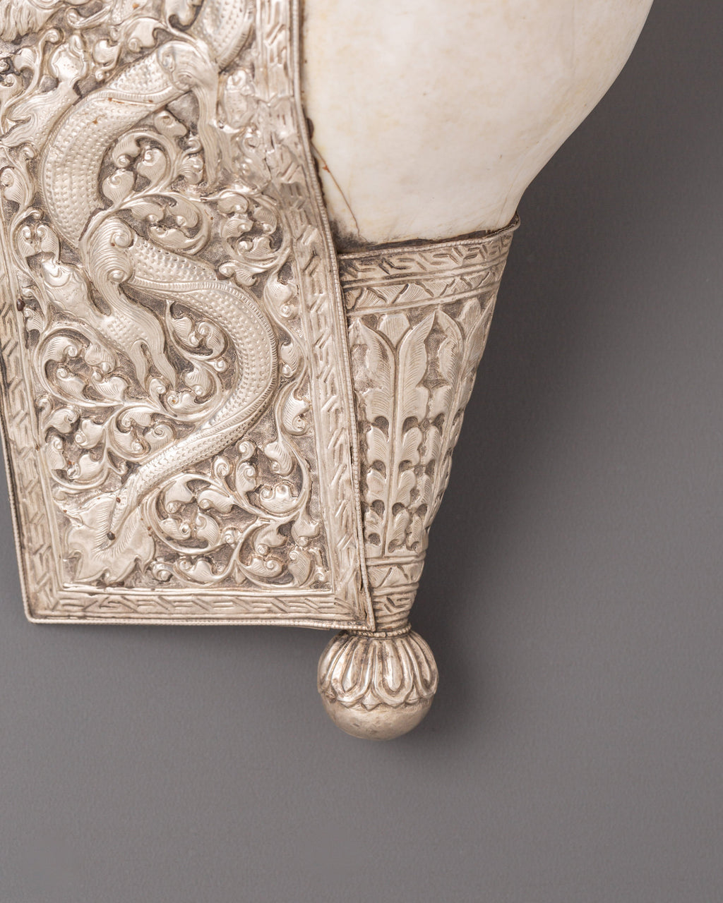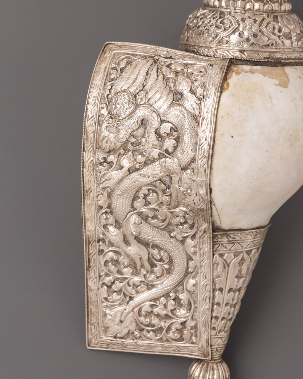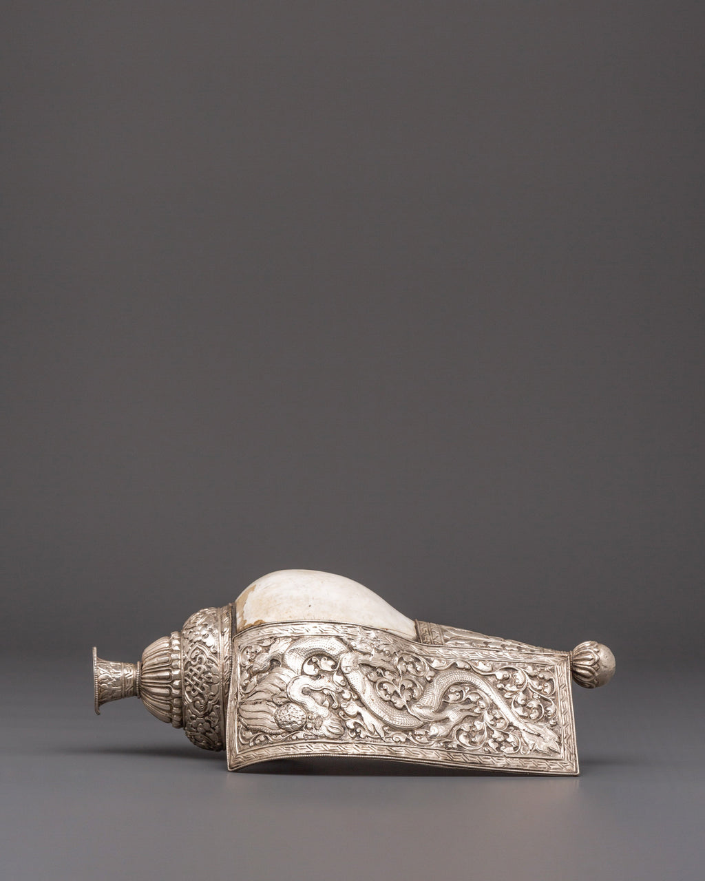 In Buddhist worship, the conch shell is used as a trumpet or offertory receptacle and represents Buddha's spoken voice. It is one of the eight auspicious Buddhist symbols, reflecting the victory of the Buddha's teachings, which spread omnidirectionally like the sound of a conch shell. The conch shell is a symbol of power, authority, and sovereignty; its sound is believed to ward off evil spirits, prevent natural disasters, and deter dangerous creatures.