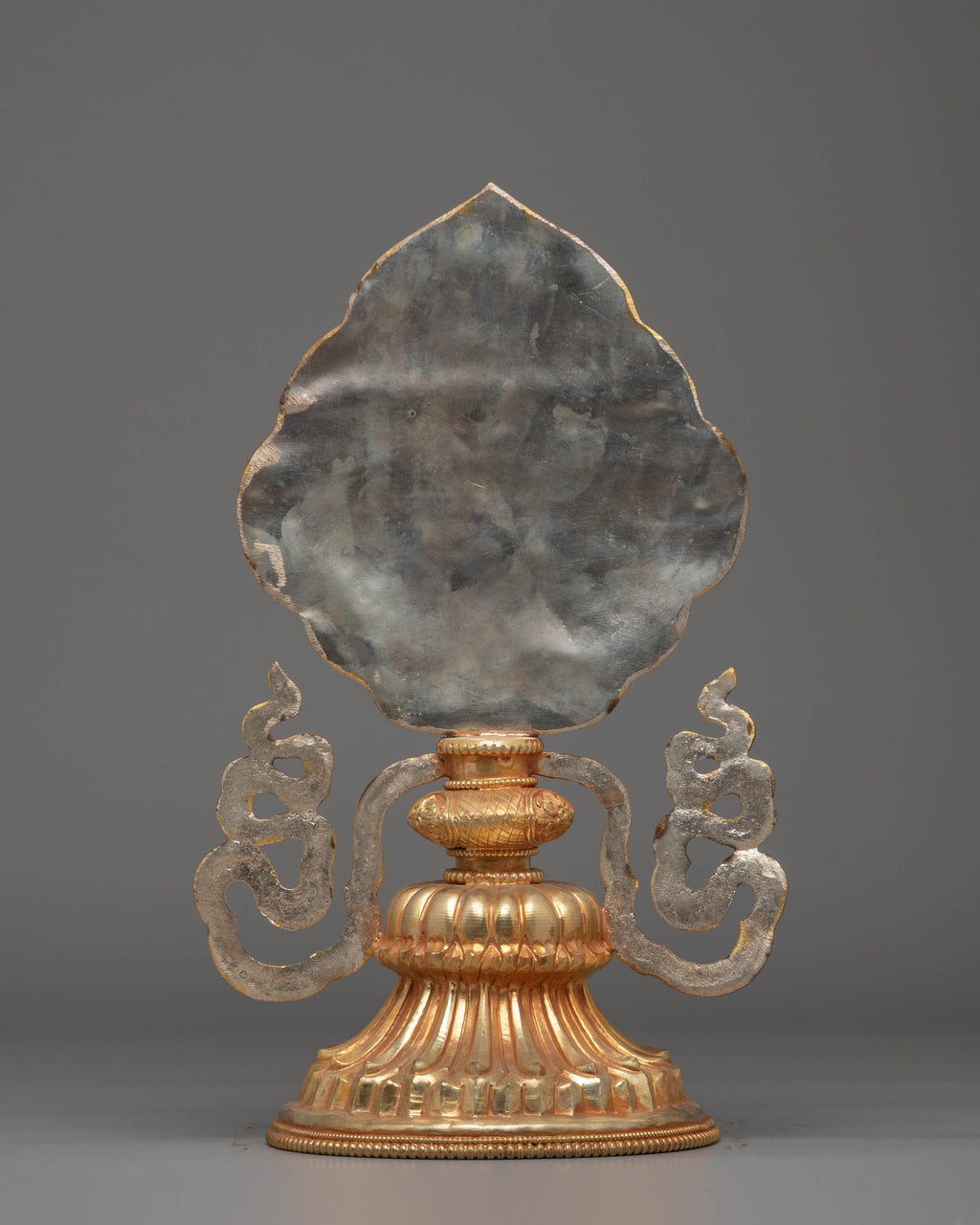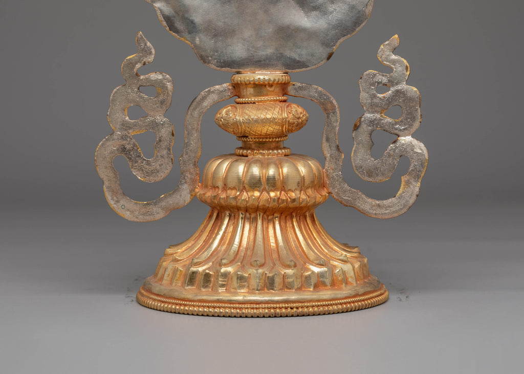 This exquisite statue features the eight symbols arranged in a symmetrical design, beautifully framed by the graceful curves of the copper base. The electro gold plating gives the sculpture a radiant, timeless appearance, making it a perfect addition to any meditation space or home altar. Its compact size allows it to be displayed prominently in various settings, while the copper body adds both durability and a touch of elegance. The intricate details of each symbol are designed to inspire spiritual reflection and meditative practice.